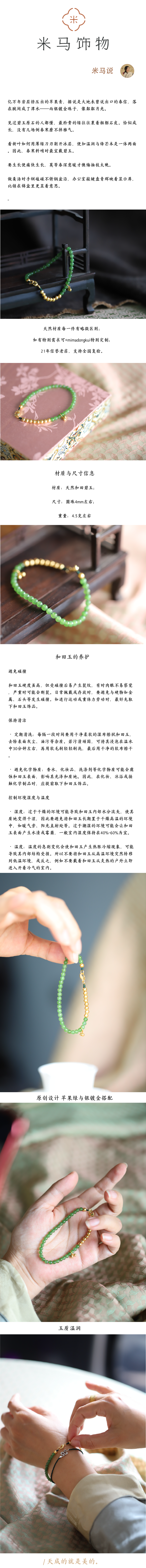 米马饰物 天然和田碧玉 苹果绿银镀金手链 莫等春意暖