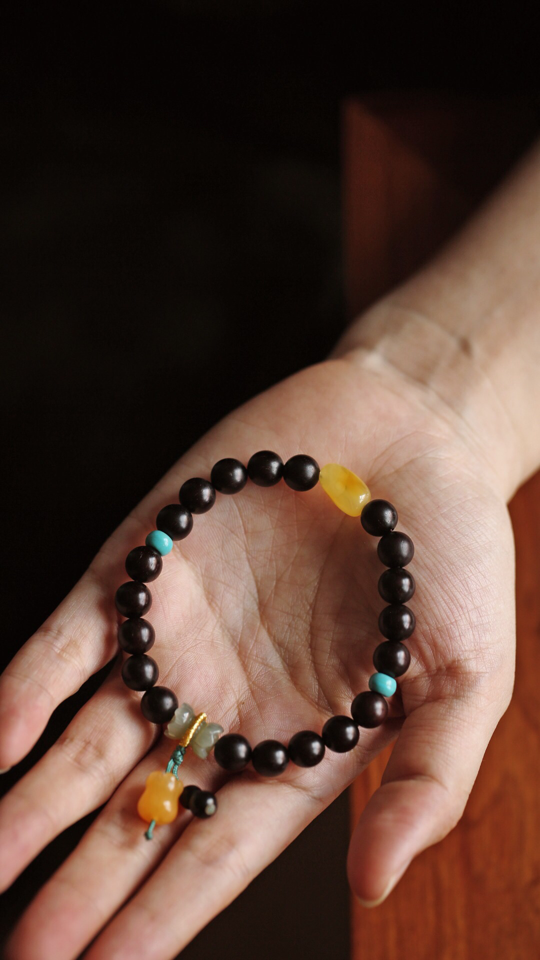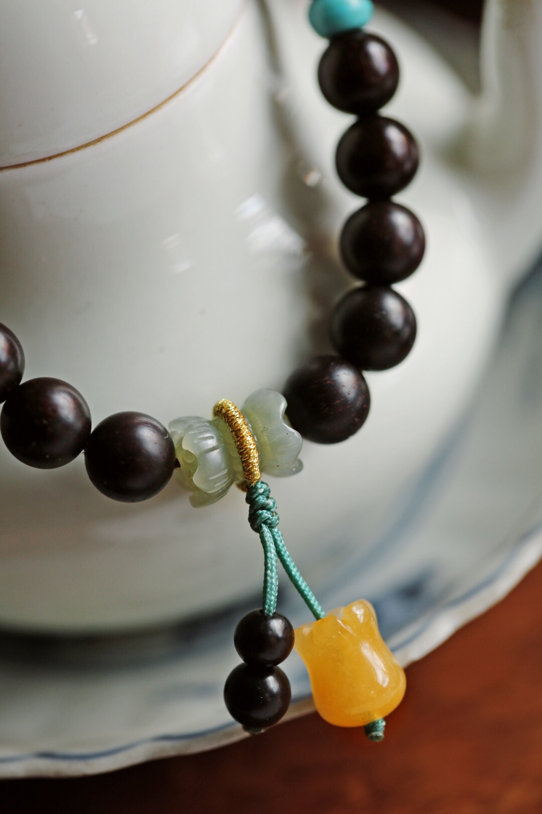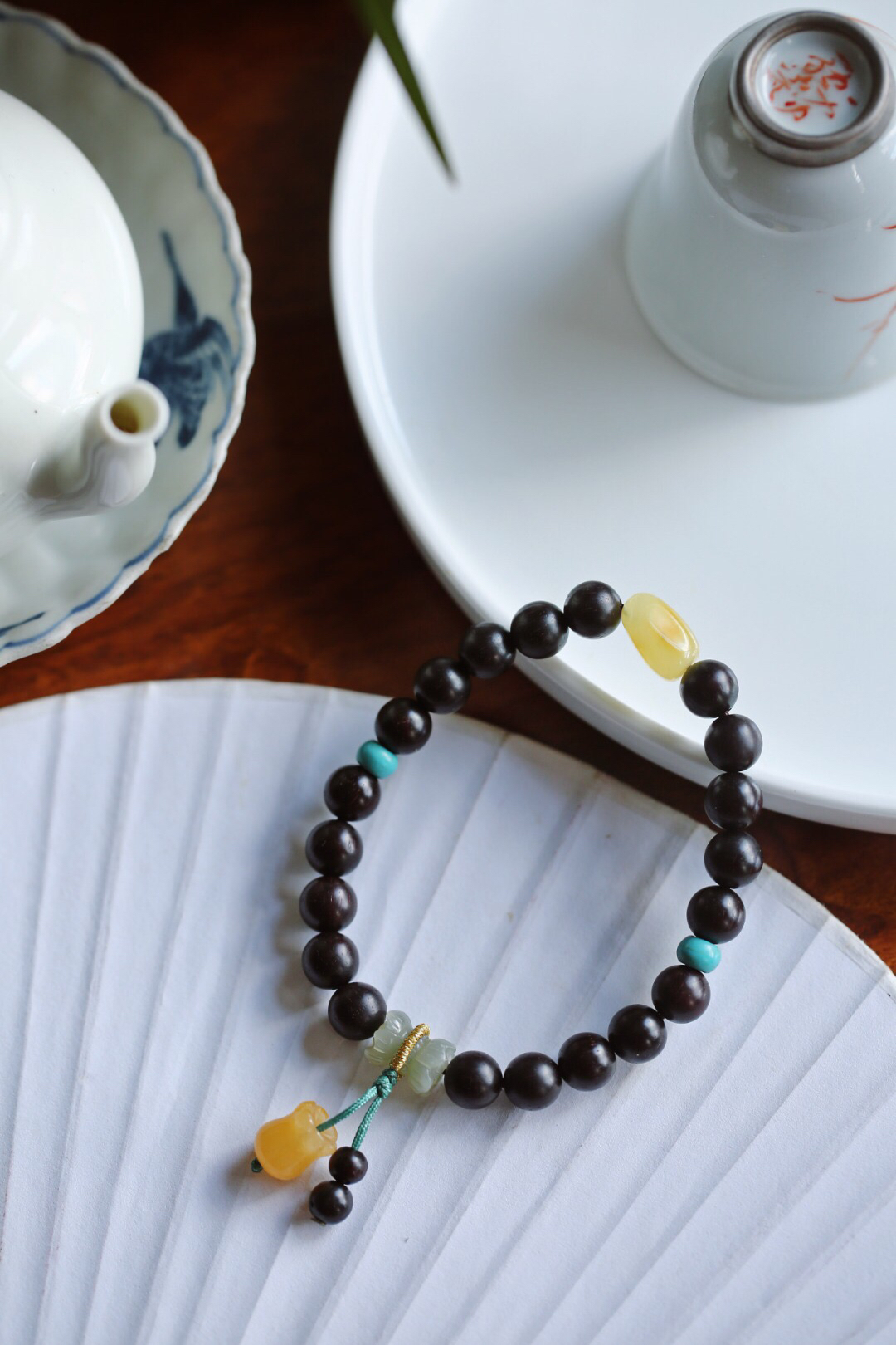 小叶紫檀原创手串坠有一朵金丝玉的铃兰, 其花语幸福的归来; 佩戴举手投足间,灵动生巧。