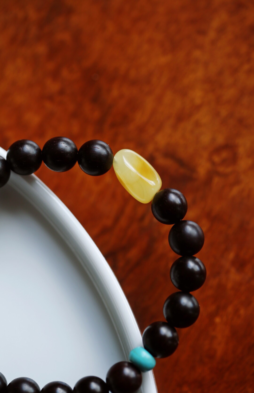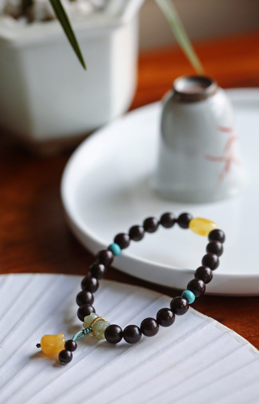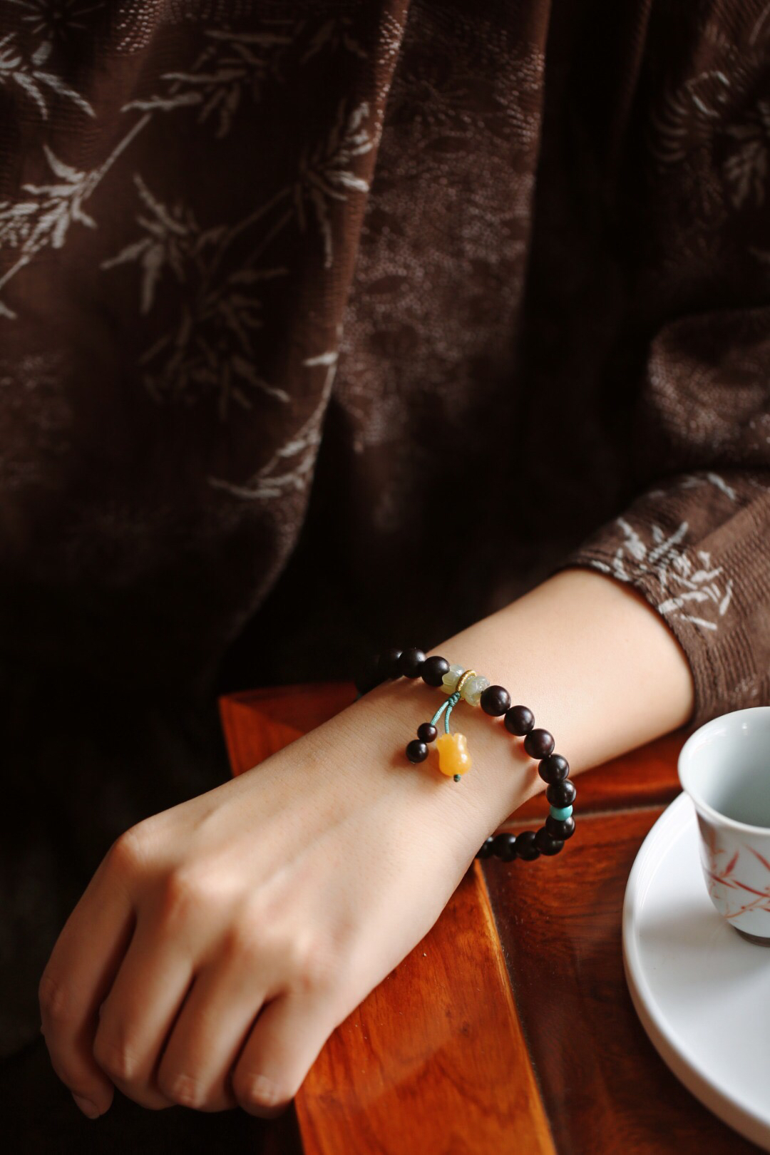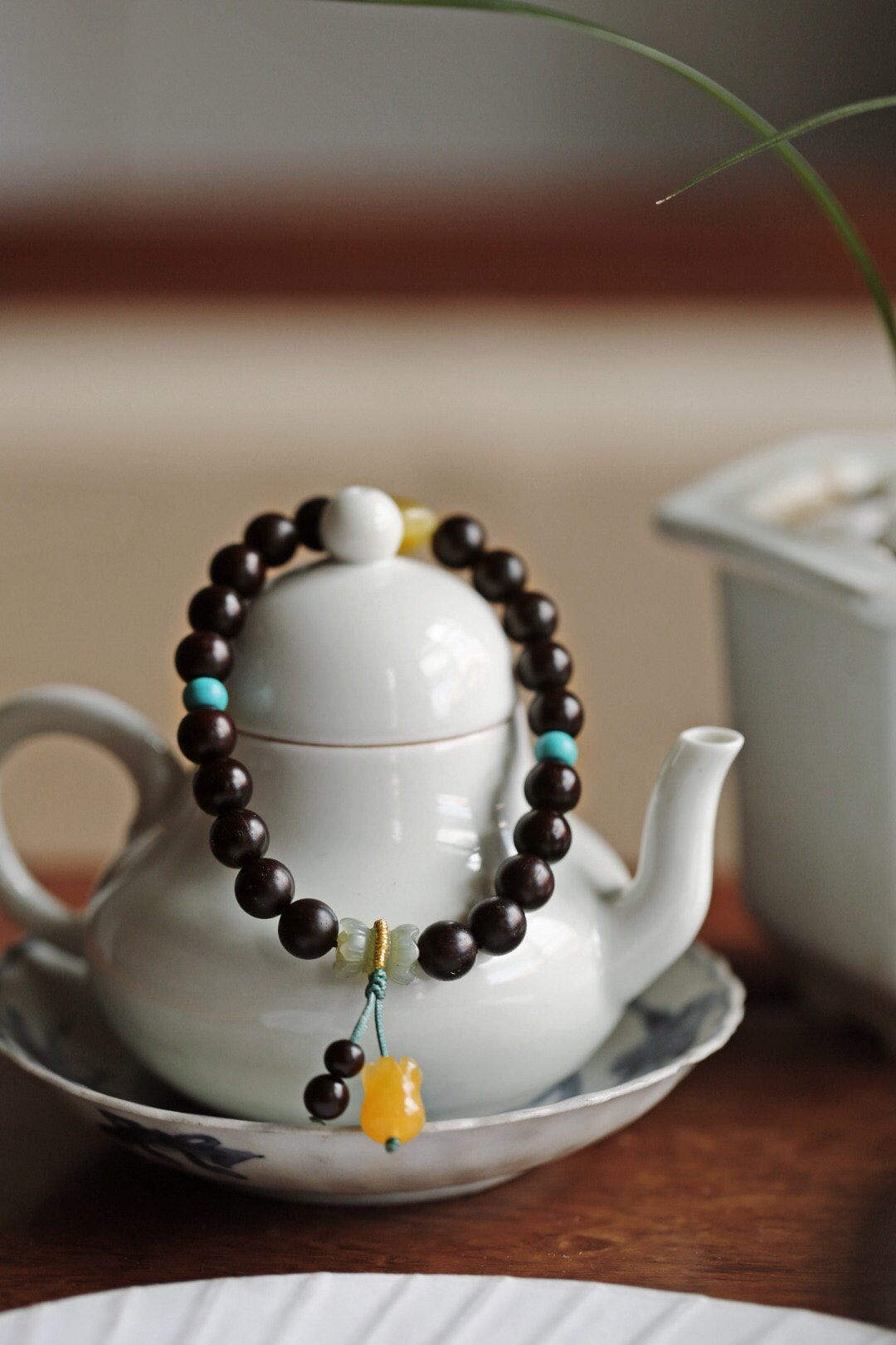 小叶紫檀原创手串坠有一朵金丝玉的铃兰, 其花语幸福的归来; 佩戴举手投足间,灵动生巧。