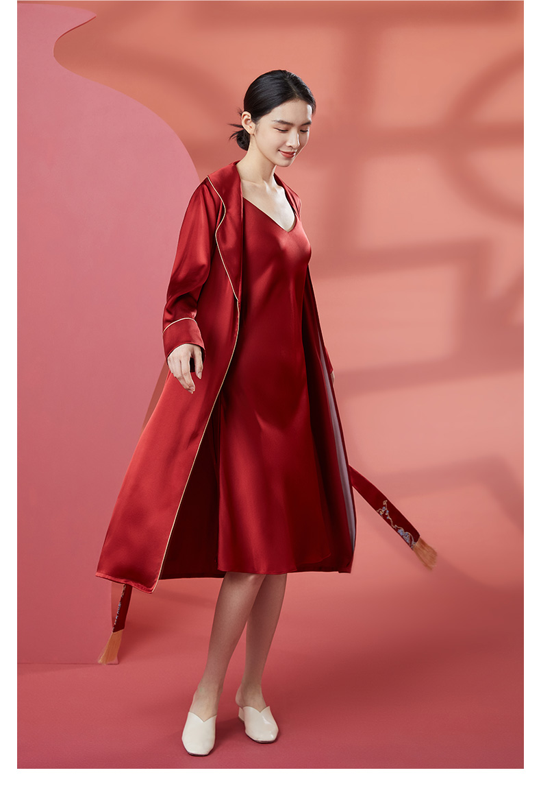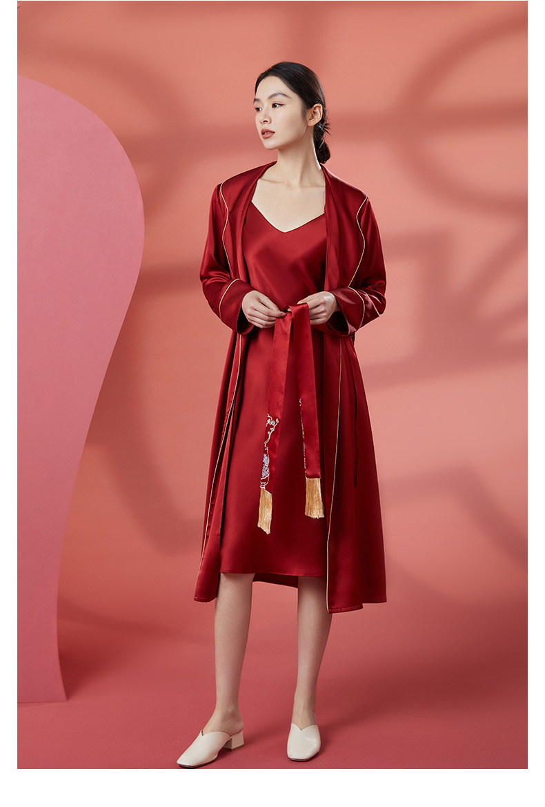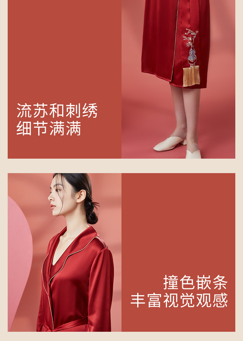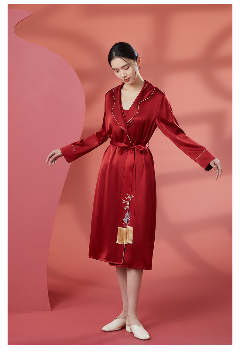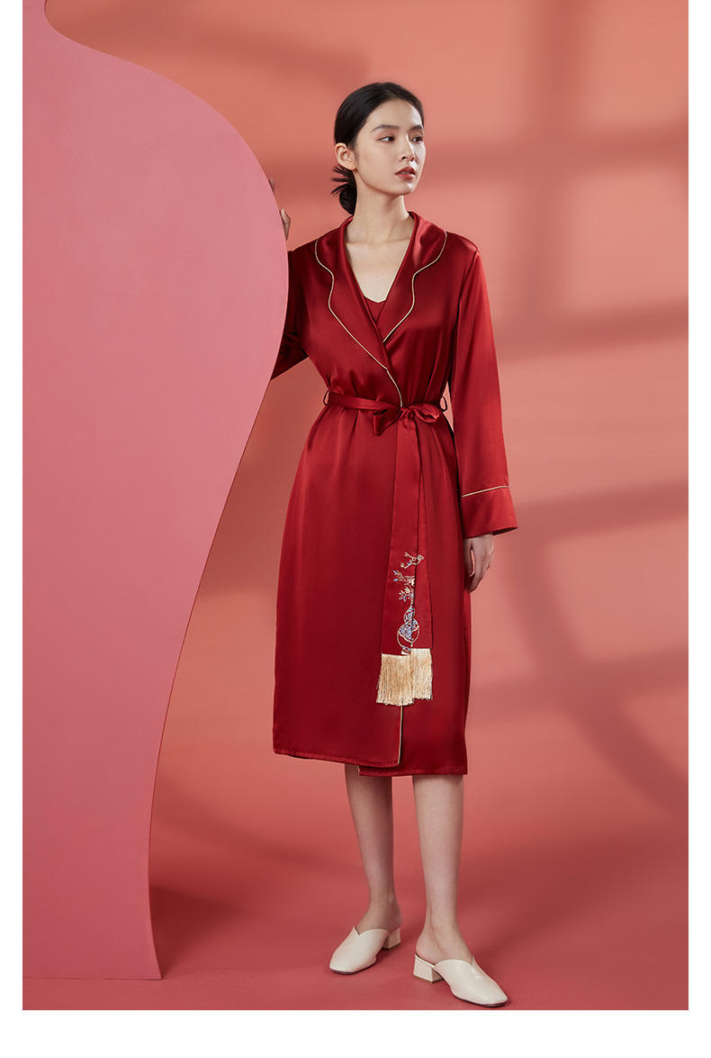 新年献礼】19姆米100%桑蚕丝红色真丝新中式刺绣睡袍女晨袍金三塔新品 YSFDD106