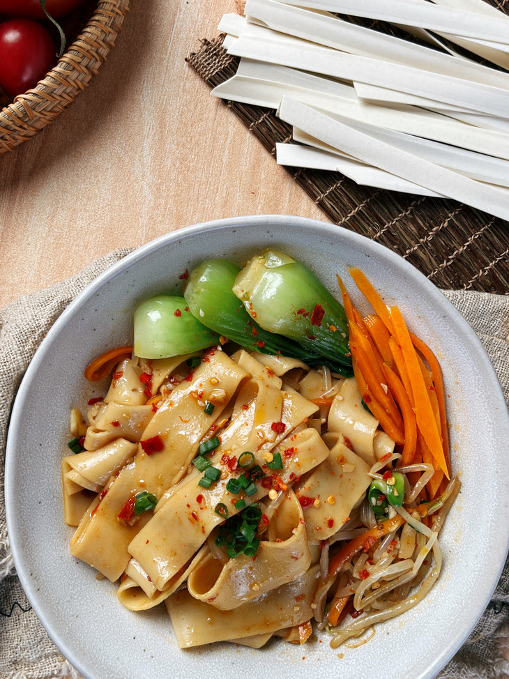 此款宽面,不是鲜面,胜似鲜面,劲道爽滑美味,足以与鲜面相媲美。