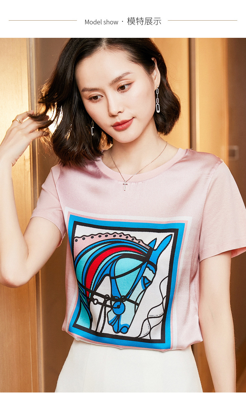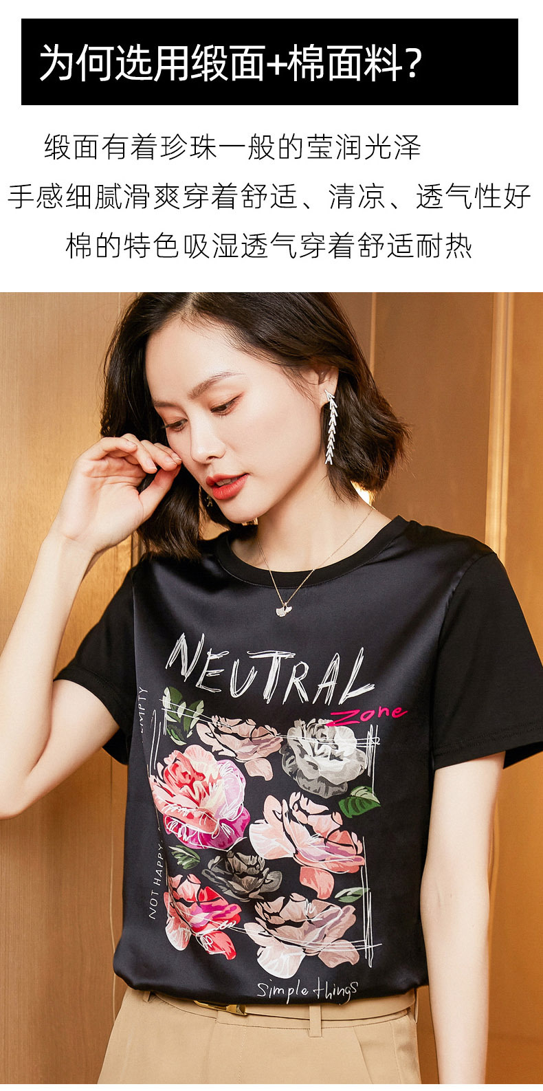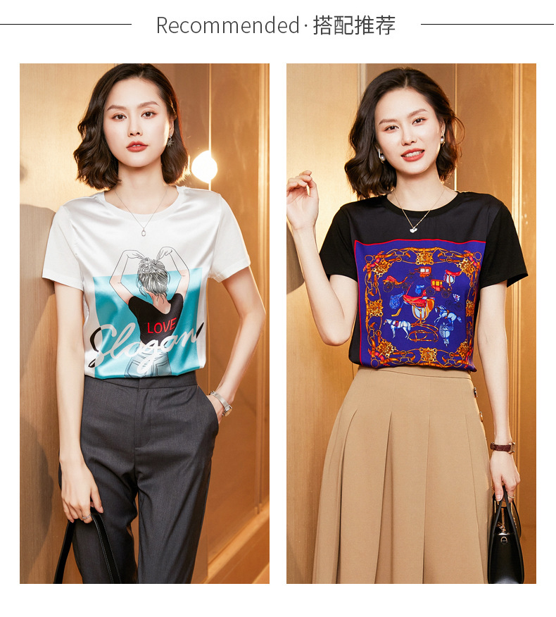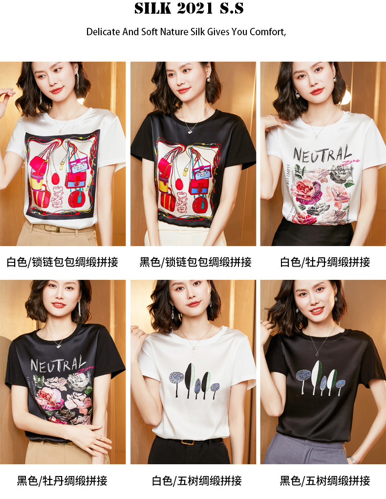 【缎面印花T恤】缎面+丝光棉拼接 柔软亲肤 透气清爽 时髦减龄 宽松不挑身材