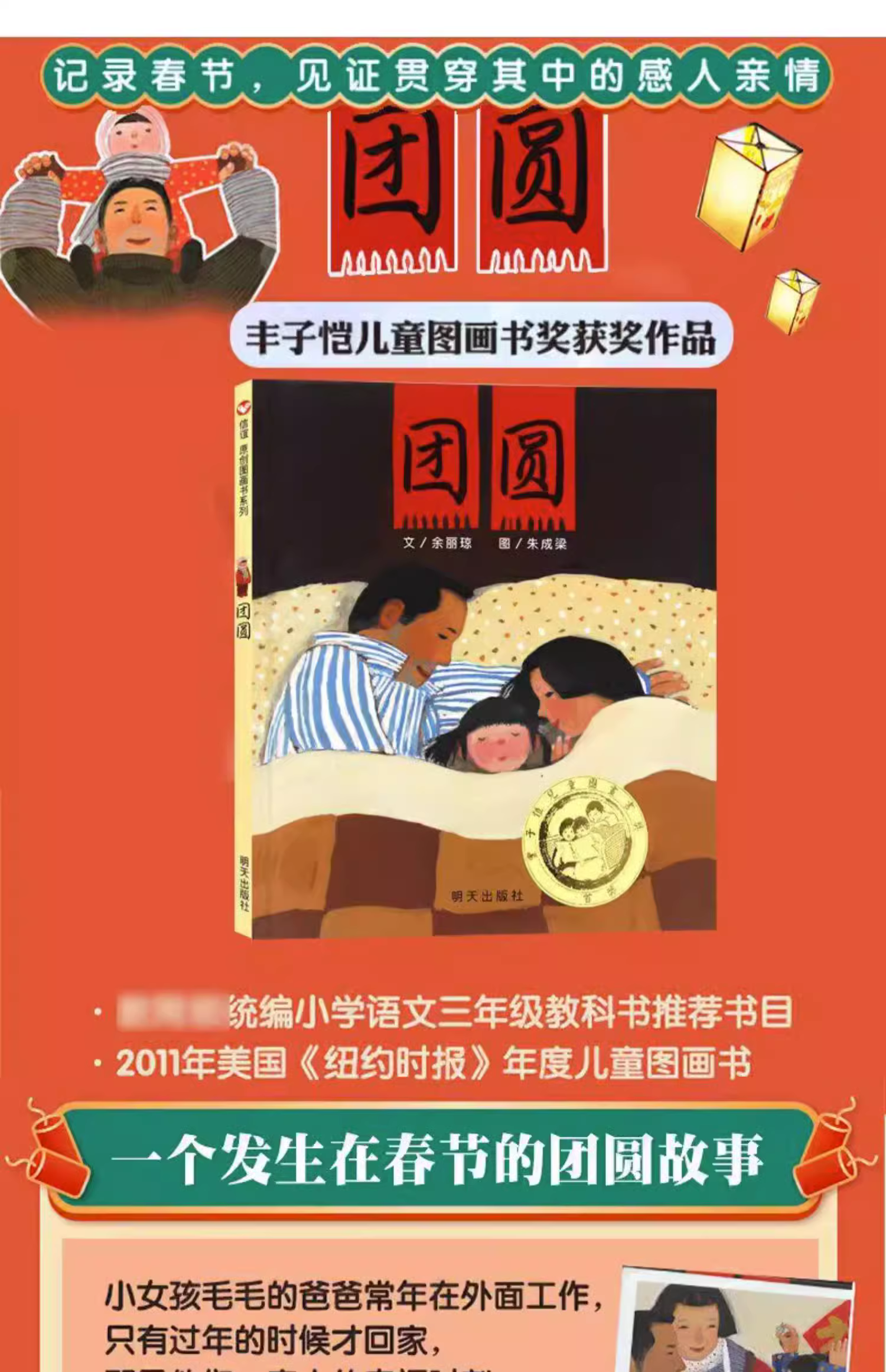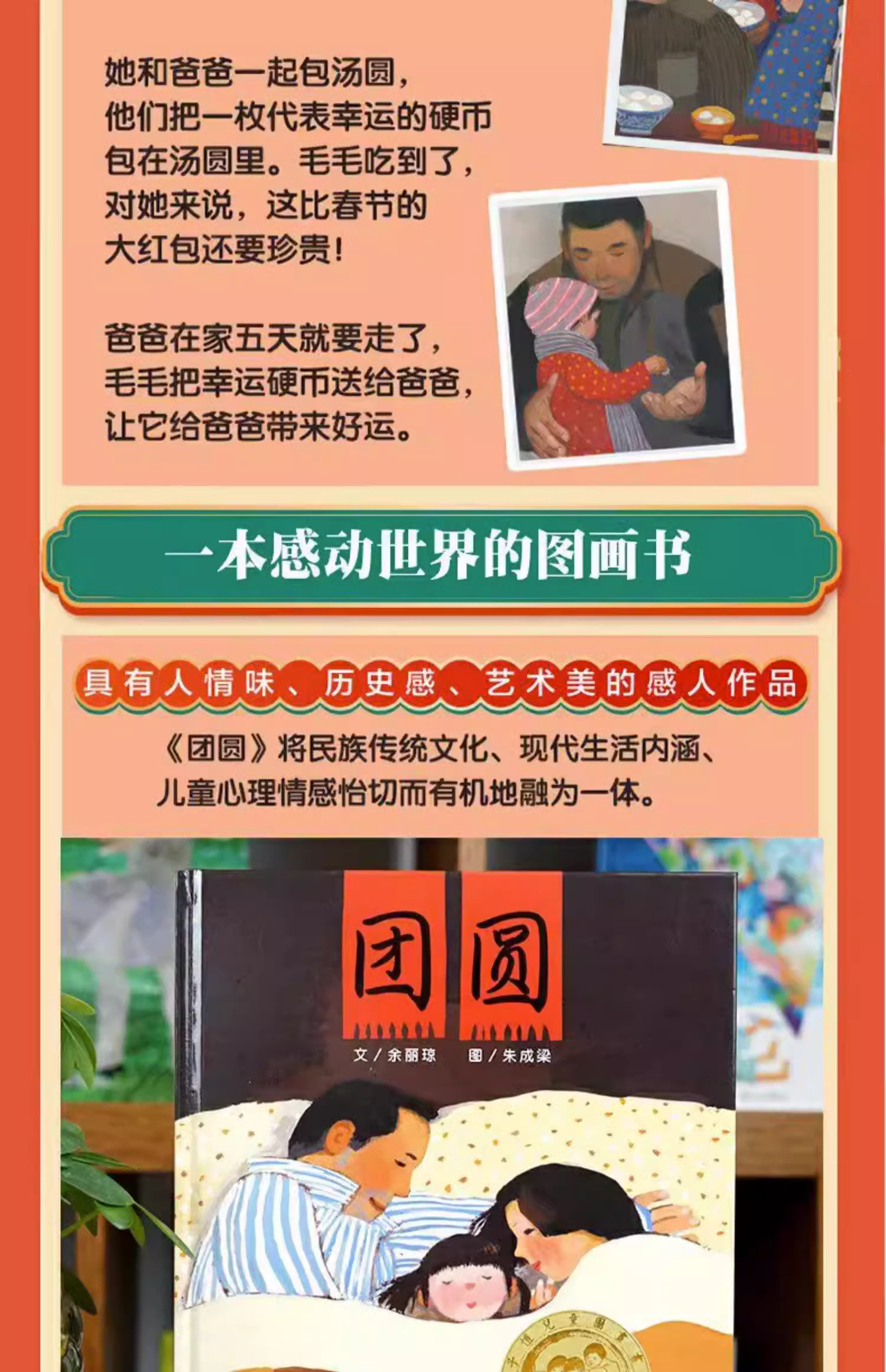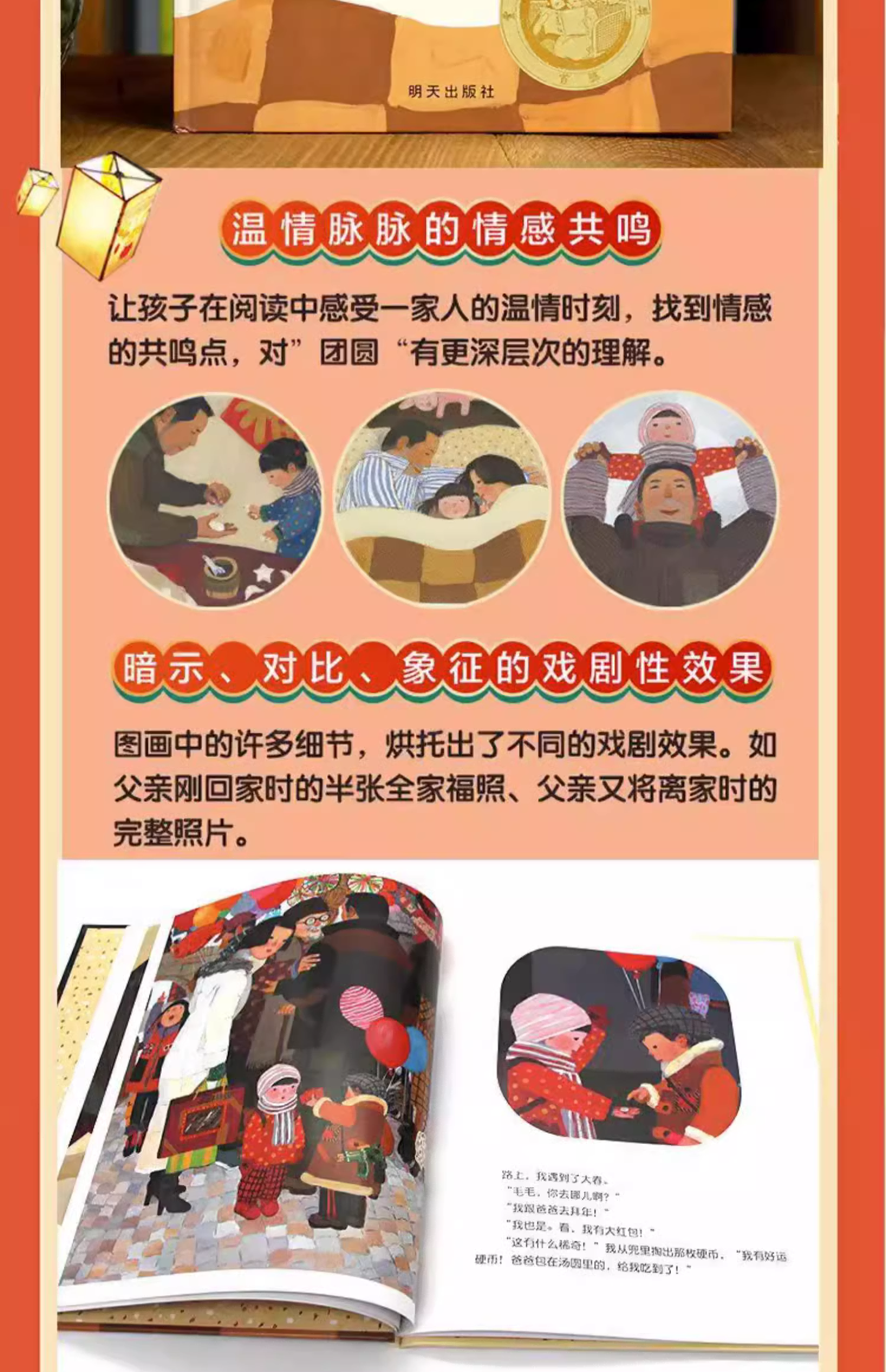 本书是一部将民族传统文化、现代生活内涵、儿童心理情感恰切而有机地融为一体,具有人情味、历史感、艺术美的感人作品。其文字故事自然素,没有夸饰的言辞,没有过剩的意绪,主题意蕴含而不露,情感表达酽而不烈,结构安排疏而不漏,既为绘画提供了坚实的展开基础,也给绘者留下了广阔的创意空间。本书讲述了一个爸爸常年在外,回家过年团圆的故事。