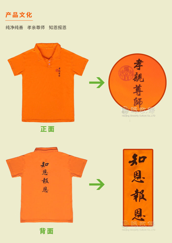 服装款型:成人男士女士平时都适合穿着,简单大方,更适合做传统文化课程义工服装。