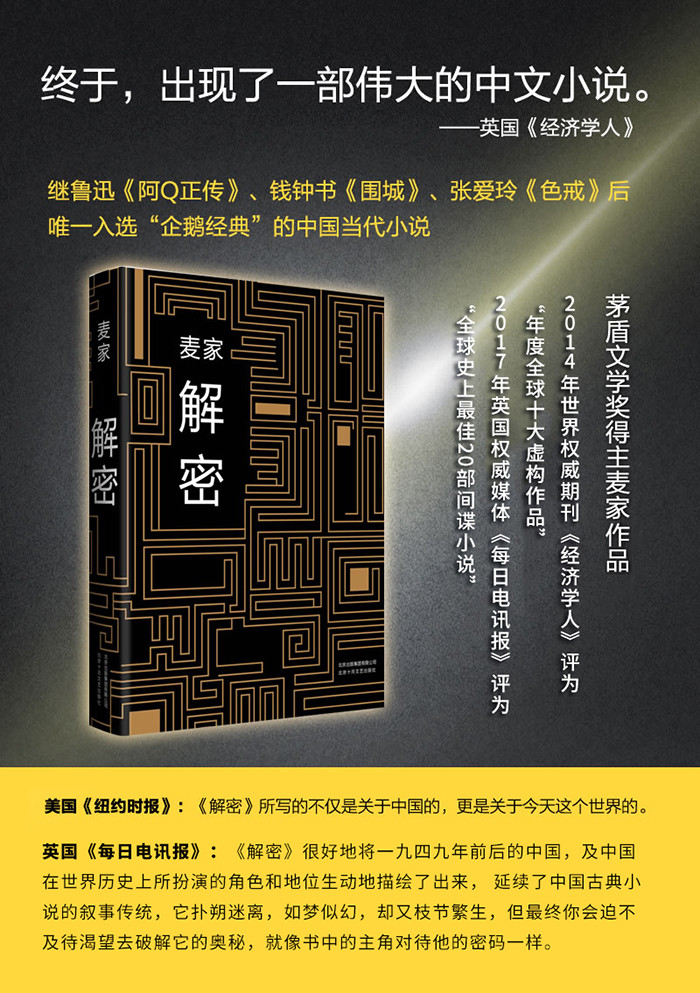 ★《解密》很好的将一九四九年前后的中国,及中国在世界历史上所扮演的角色和地位生动地描绘了出来,延续了中国古典小说的叙事传统,它扑朔迷离,如梦似幻,却又枝节繁生,但最终你会迫不及待渴望去破解它的奥秘,就像书中的主角对待他的密码一样。——英国《每日电讯报》