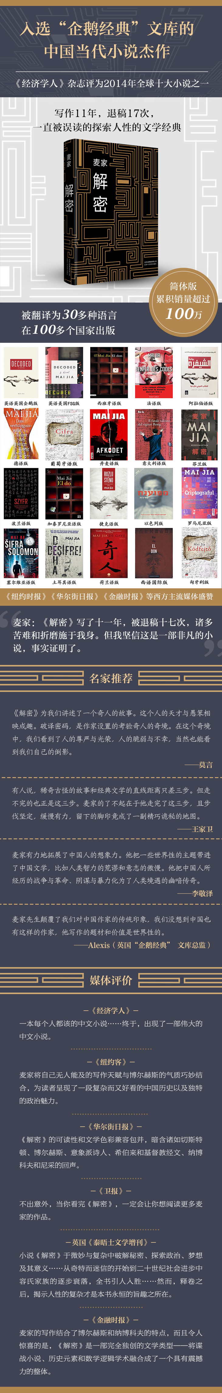 ★不出意外,当你看完《解密》,一定会让你想阅读更多麦家的作品。——英国《卫报》
