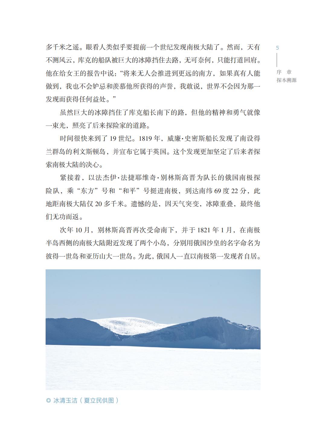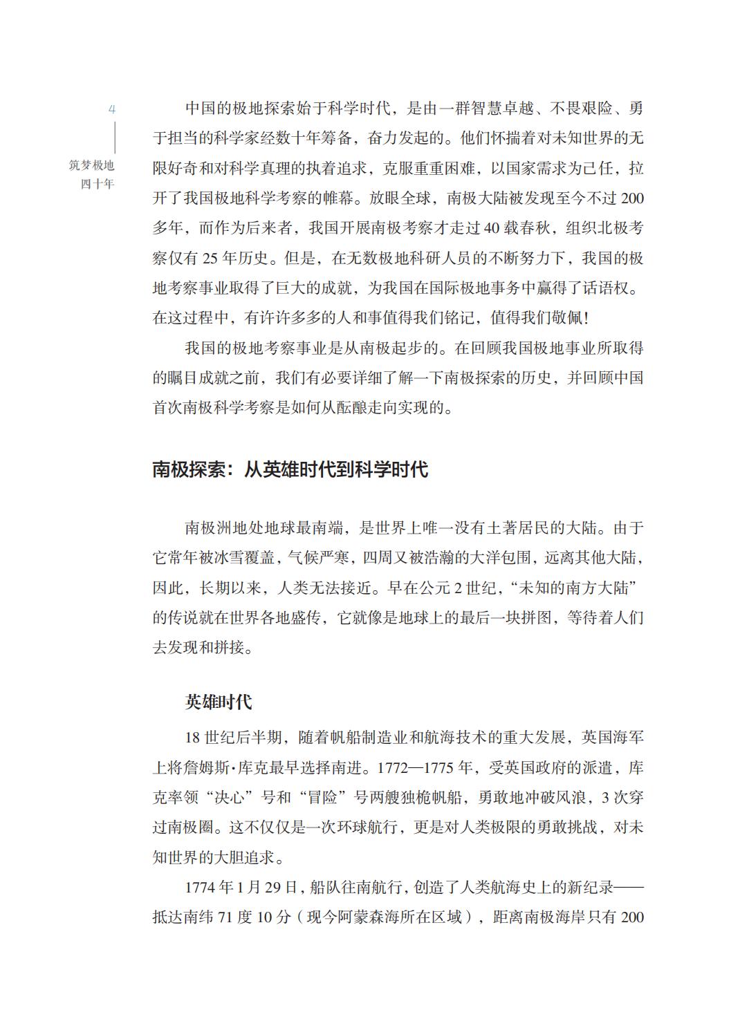 【前言】序 ???2024年是中国极地考察40周年。40年前,中国开始南极考察,这项功在当代、利在千秋的伟大事业,是人类对未知世界的探索,是为我国未来的发展谋求战略空间。 ???一直以来,党和国家领导人高度重视极地考察工作。1984年,在首次南极科学考察前,邓小平同志为考察队题词:;为人类和平利用南极做出贡献。1998年,当中国正在实施第14次南极科学考察之际,江泽民同志亲笔题写了;中国南极长城站站名。2004年6月21日,胡锦涛同志致电祝贺南极仲冬节;2010年2月,在中国南极昆仑站建成一周年之际,胡锦涛同志又为昆仑站题写了站名。 ???党的十八大以来,习近平总书记对极地考察工作的重视一以贯之:2013年6月,南极仲冬节之际,他向南极考察站工作人员致电慰问;2014年1月,;雪龙号遇冰被困,他第一时间作出重要指示;同年2月,他致信祝贺中国南极泰山站建成并投入使用;同年11月,他慰问中澳南极科考人员并考察;雪龙号;在2020年新年贺词中,他专门提到了;雪龙2号首航南极;2024年2月7日,龙年春节前夕,中国南极秦岭站建成并投入使用,他致信表示热烈祝贺,并向广大极地工作者致以诚挚问候和美好的新春祝福;在不同国际场合,他多次提出深化极地等领域合作总书记的重要指示批示为新时代新征程我国极地事业发展指明了前进方向,提供了根本遵循。 ???40年前,中国的极地事业是在一张白纸上起步的,没有一个极地考察站,没有一艘专业极地科考船。40年来,我国在西南极的乔治王岛上建立了长城站,在东南极大陆拉斯曼丘陵上建立了中山站,在南极内陆最高点的冰盖上建立了昆仑站,接着又建立了泰山站、秦岭站。科考船舶也经历了多次更新换代,现在已拥有;雪龙号和;雪龙2号这样的现代化考察船;建立起以固定翼飞机、直升机为支撑的空中保障系统;几十辆雪地车奔驰在冰海雪原,确保了内陆运输的顺利进行。这些都有力支撑和拓展了我国南极考察的领域和空间,有效地维护了我国的南极权益。2017年,我国成功承办第40届南极条约协商会议,并在会上牵头提出;绿色考察倡议。我国将国内海洋保护利用行动与履行国际条约和义务相结合,展现了负责任大国的担当。 ???1988年11月20日,作为船长,同时也是中国第5次南极科学考察队的一员,我站在;极地号驾驶台上拉响汽笛,开始远征南极,目的是建设中山站。这是一次填补自郑和下西洋600多年航海史空白的航行,是一次开拓中国南极考察新领域的里程碑式航行,也是一次将五星红旗插上南极大陆的航行。当然,这也是一趟艰辛的、对未知领域的探索之旅。 ???浩瀚大洋,茫茫冰海,无数困难在等待着我们。