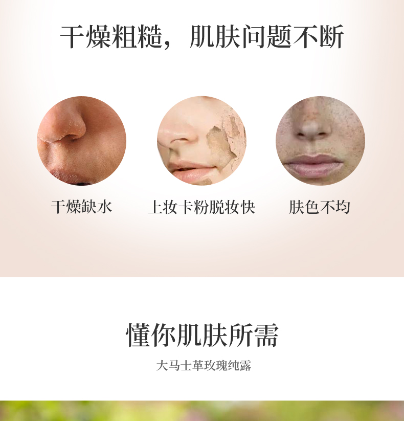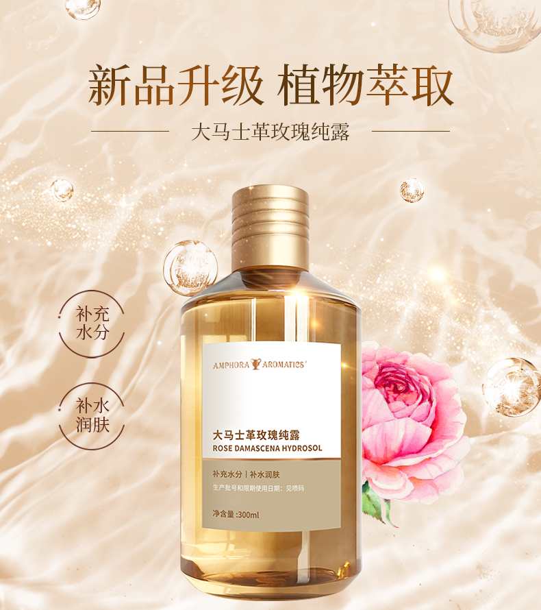 大马士革玫瑰花苞经过蒸馏工艺提取出来的鲜花原露,可使肌肤水润光泽,滋养柔软肌肤,改善肌肤干燥,让肌肤充分吸收,补水调理肤色,保持细腻柔滑。