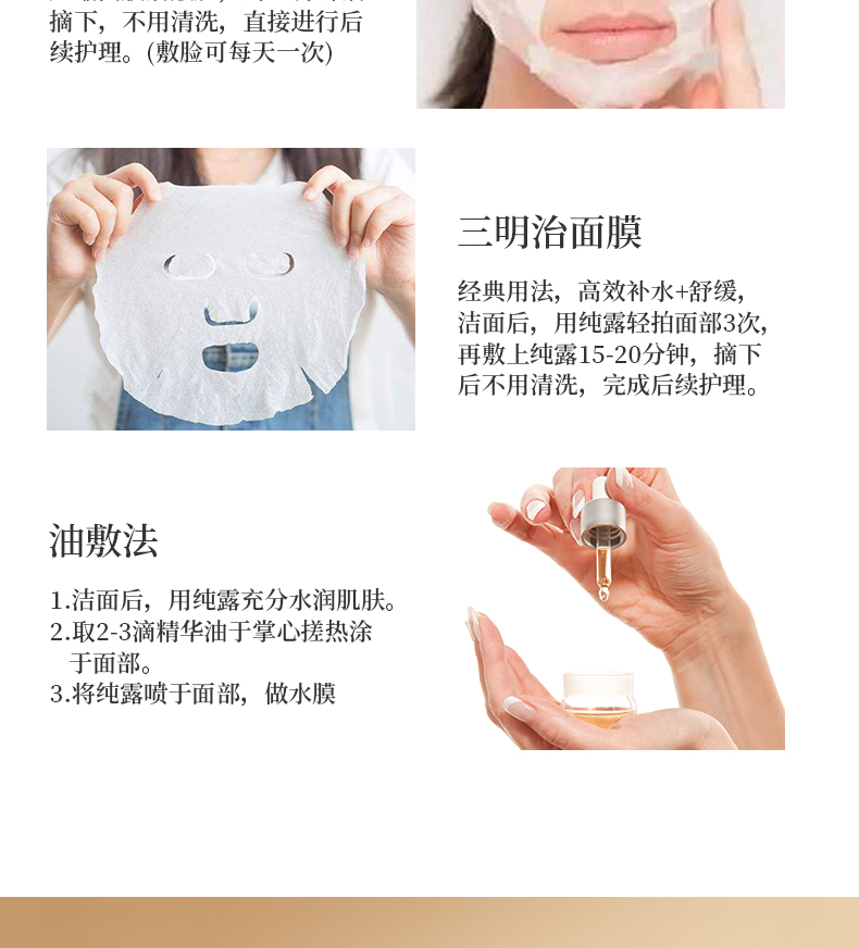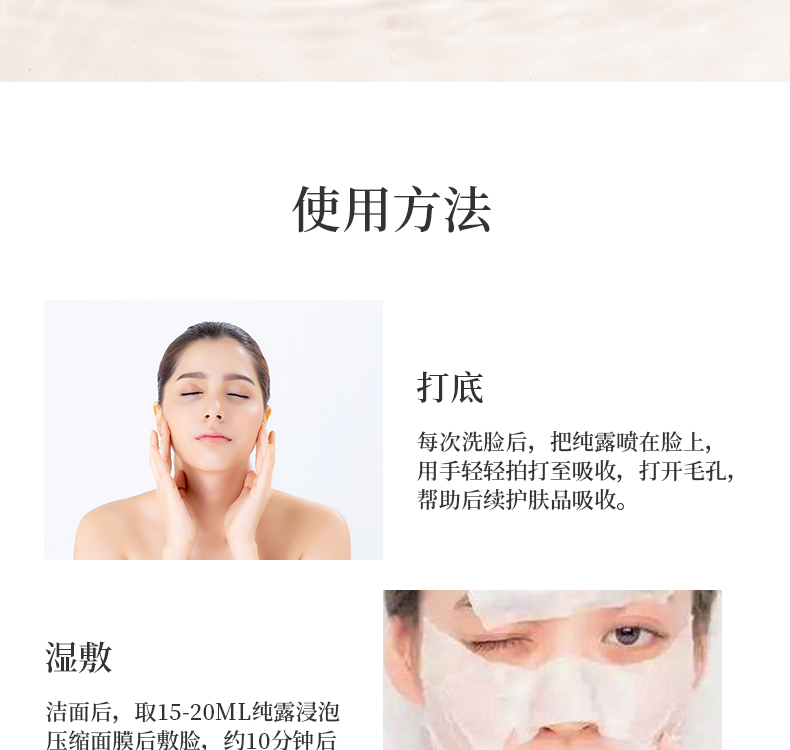 1、可以用来湿敷,或者做水膜。将压缩面膜泡于纯露中,使面膜纸完全浸润;清洁面部肌肤后,将浸好的水膜展开,轻拍贴合,享受3~8分钟的面部SPA;