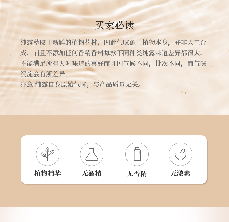 很多人不了解纯露,觉得只是个新产品,其实纯露已经有了上千年的历史了,只是因为近些年大家追捧天然才重新流行起来,纯露又叫做水精油,纯露的水分子很小,可以很好的被皮肤吸收,提高肌肤的水润度,不用纠结于护肤水选什么,回归最纯真的原始护肤方式,零添加,零防腐。