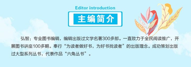 弘智:专业图书编辑,编辑出版过文学名著300多部。一直致力于全民阅读推广,开展图书讲座100多期。奉行“为读者做好书,为好书找读者”的出版理念。成功策划出版过大型系列丛书,代表作品“六角丛书”。