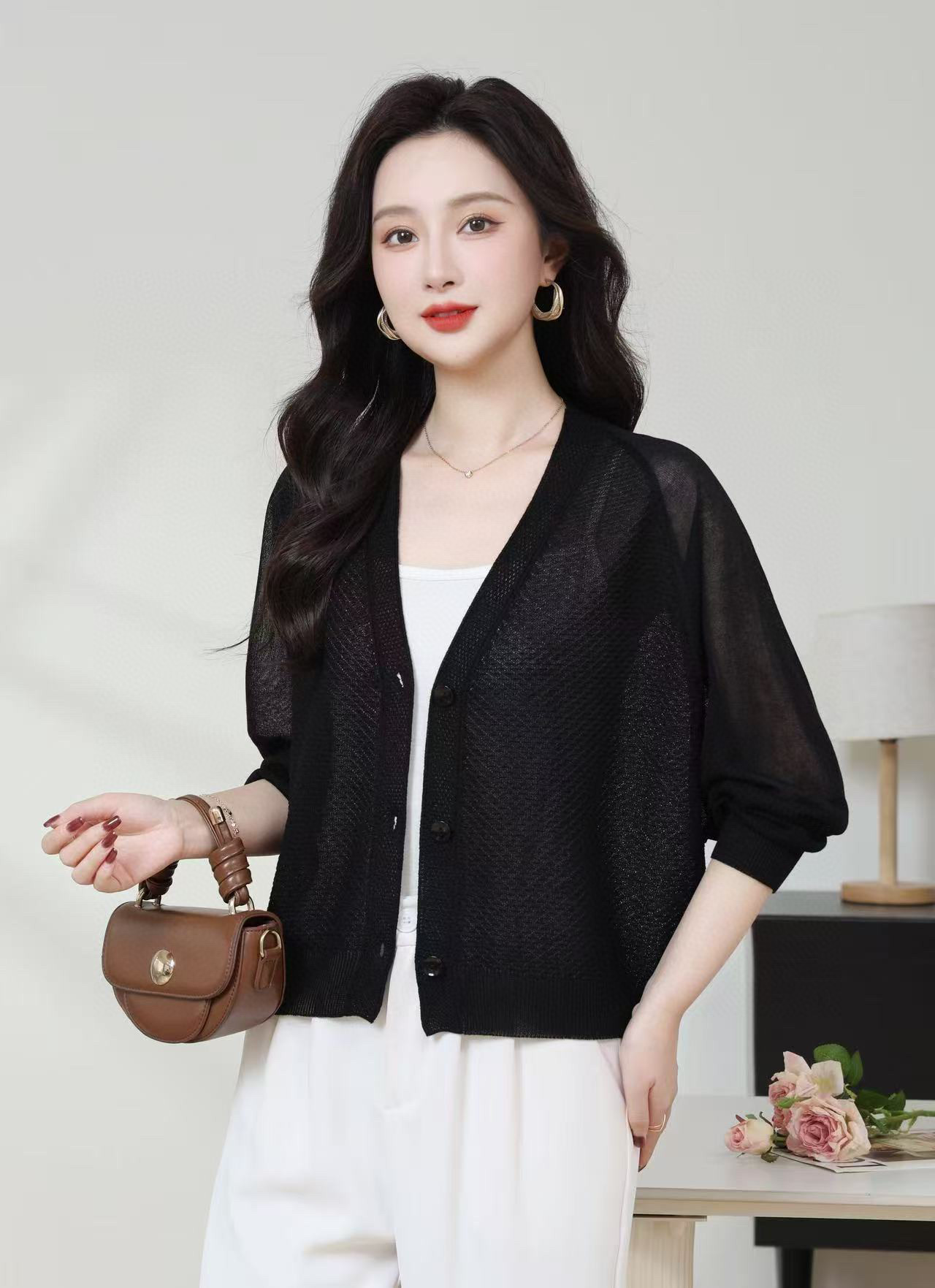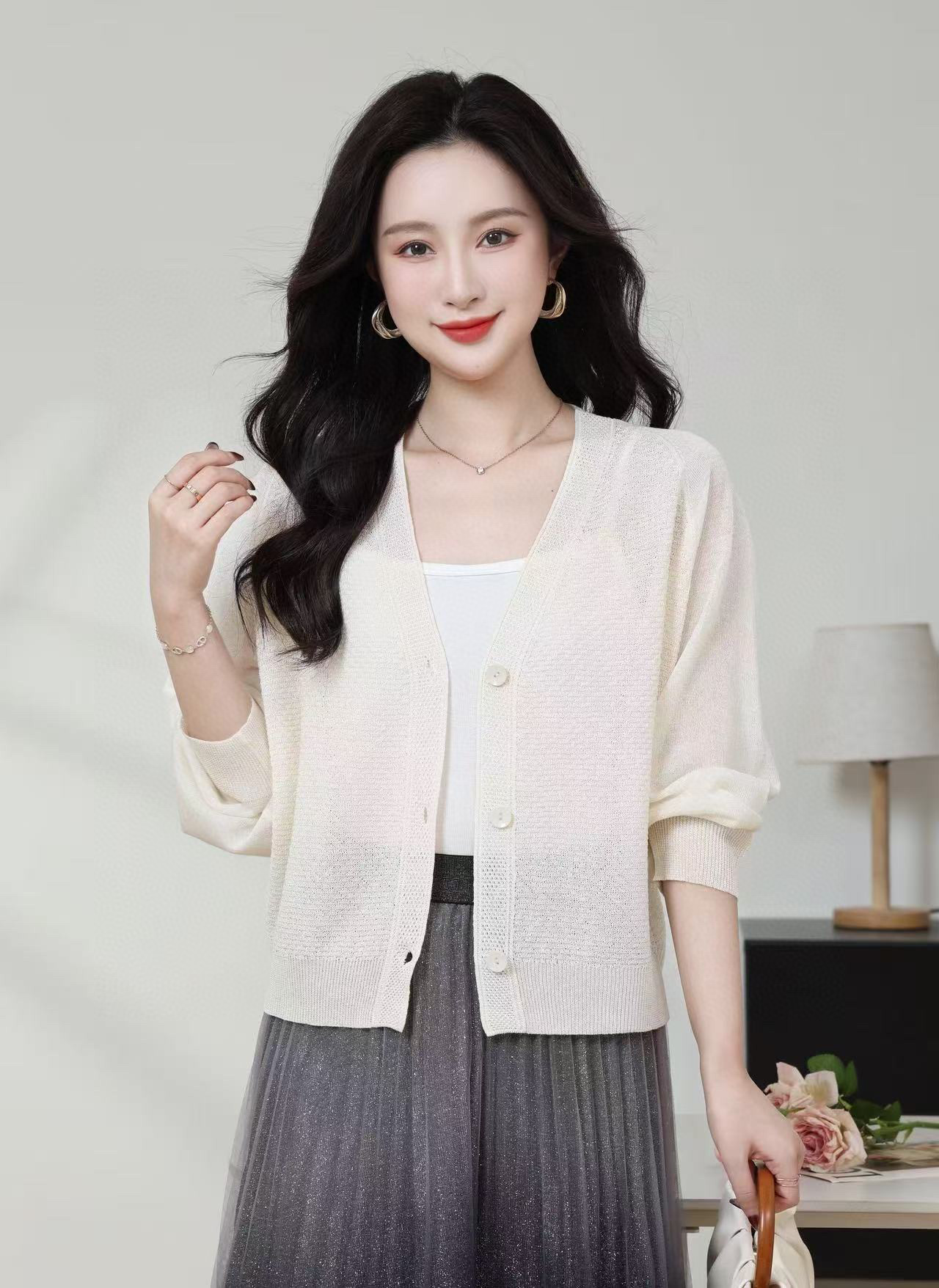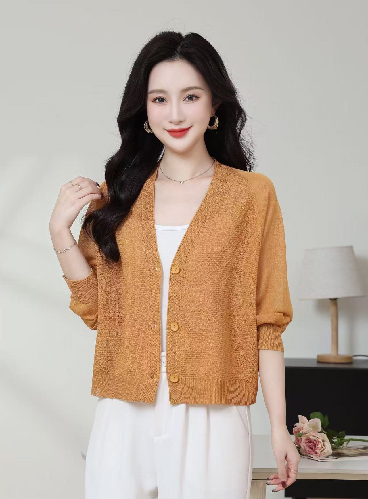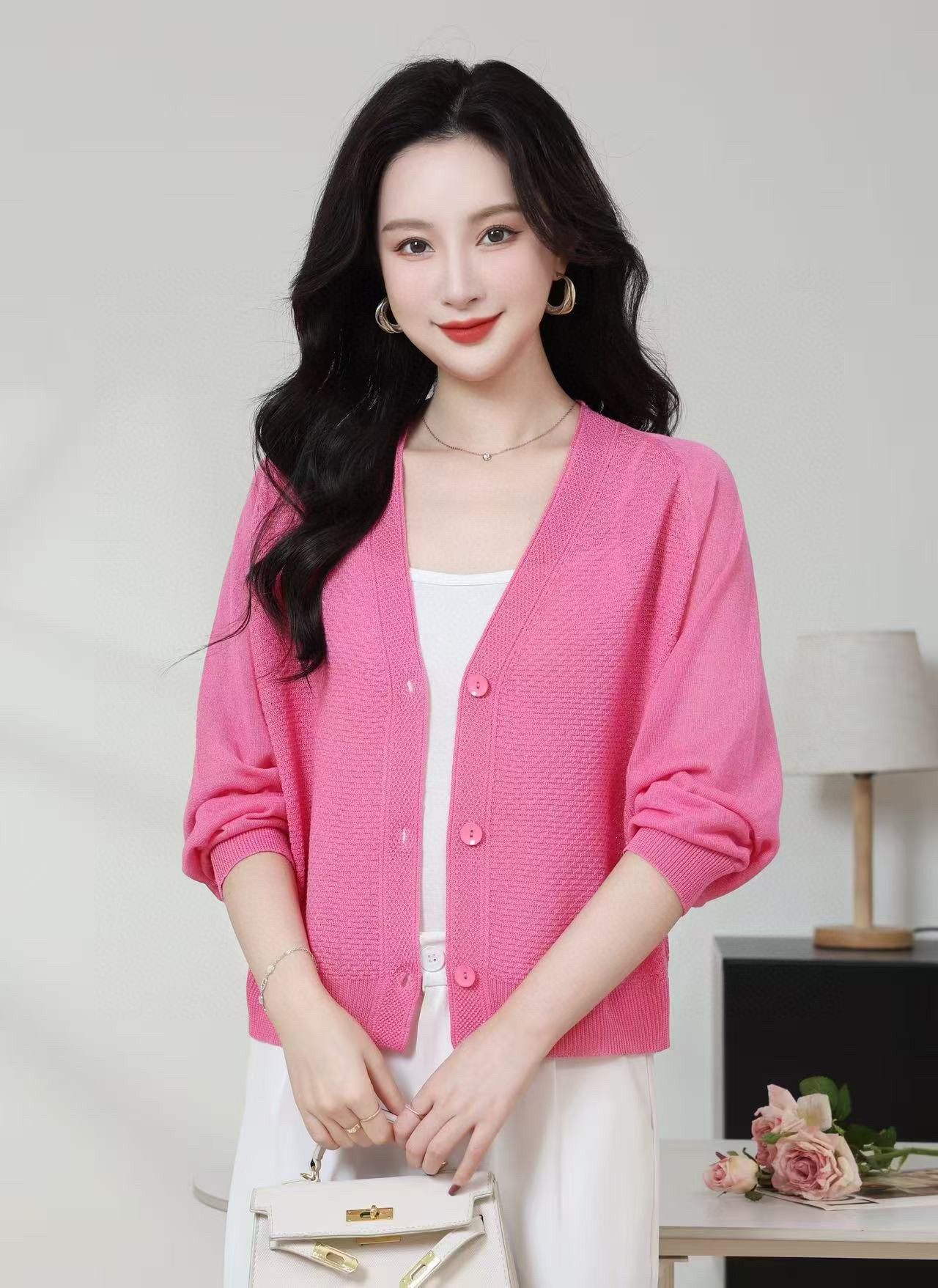 SC1E05_凝脂色/杨妃色/赤金色_针织衫_春夏_V领单排扣镂空肌理感七分袖_高级女装_BERNIEELEN 伯妮斯茵