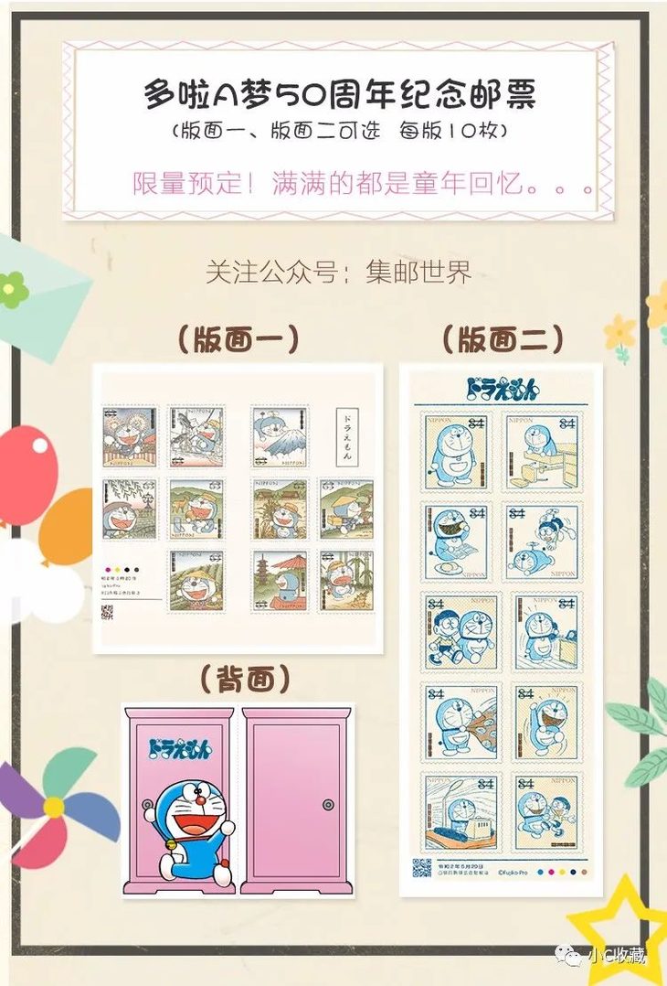今年是哆啦A梦诞生50周年,这套邮票的纪念意义非凡!由于发行量少,供应很紧张,所以每人最多限购2套!先拍先得,订完即止!