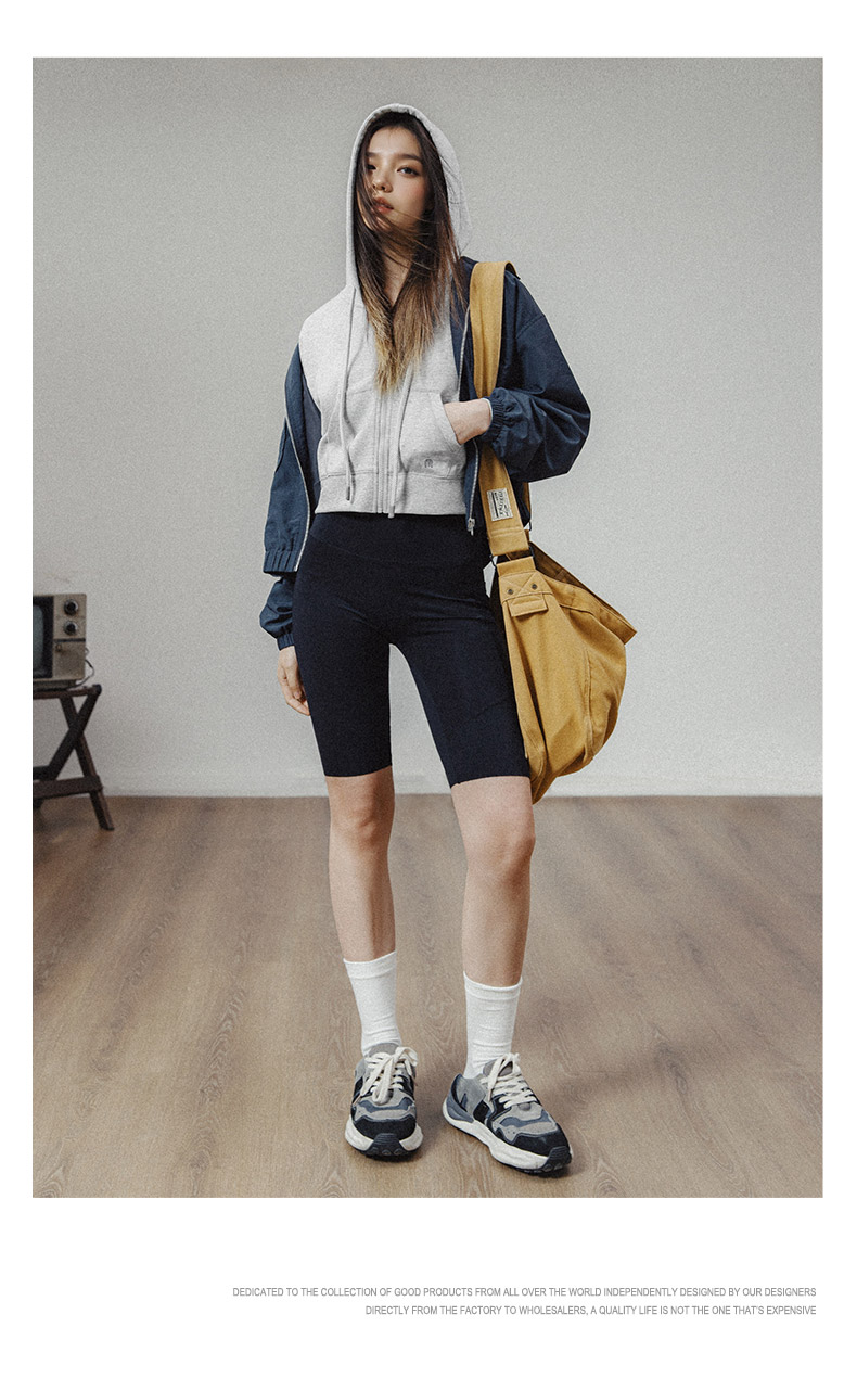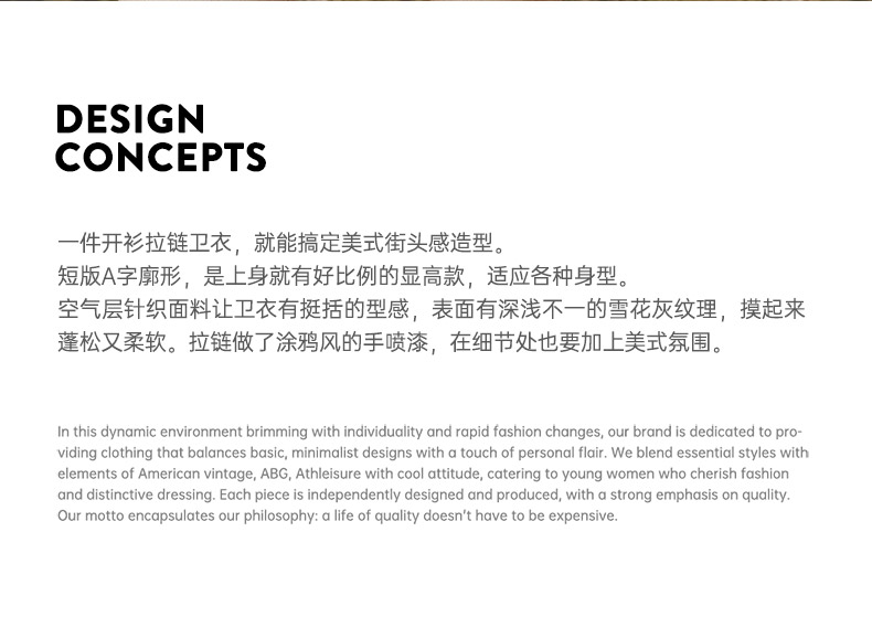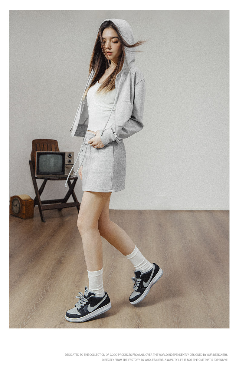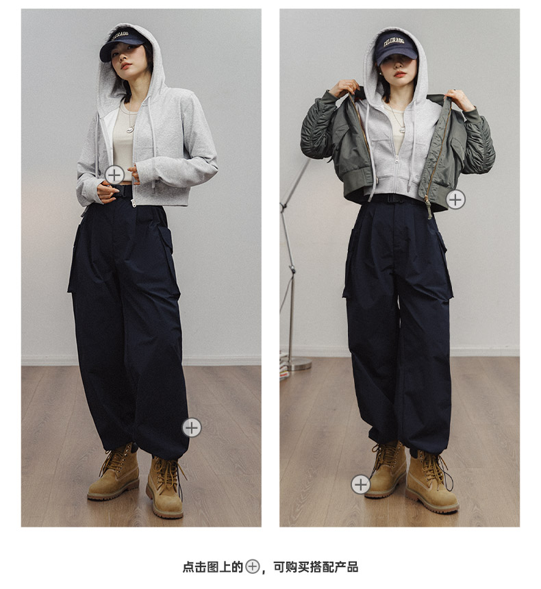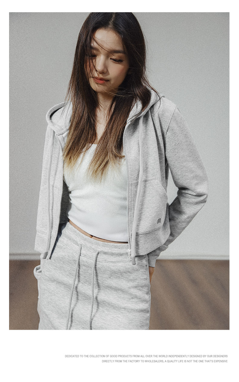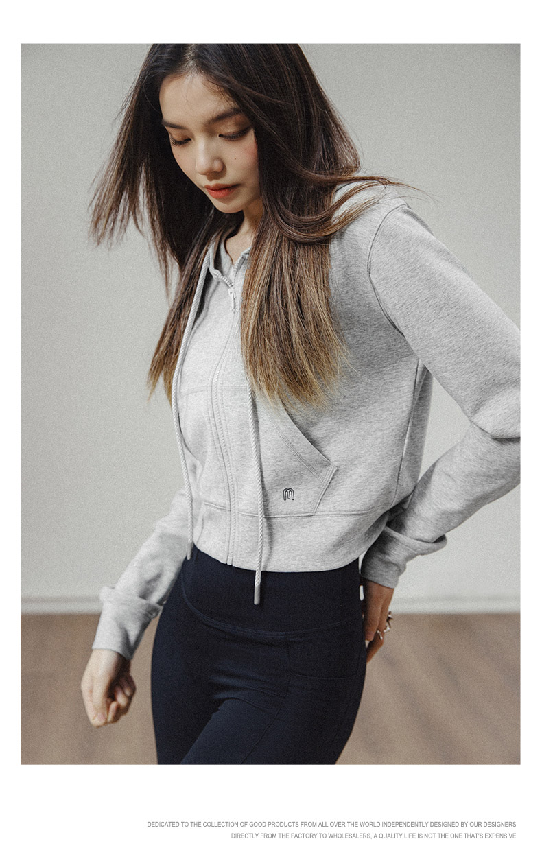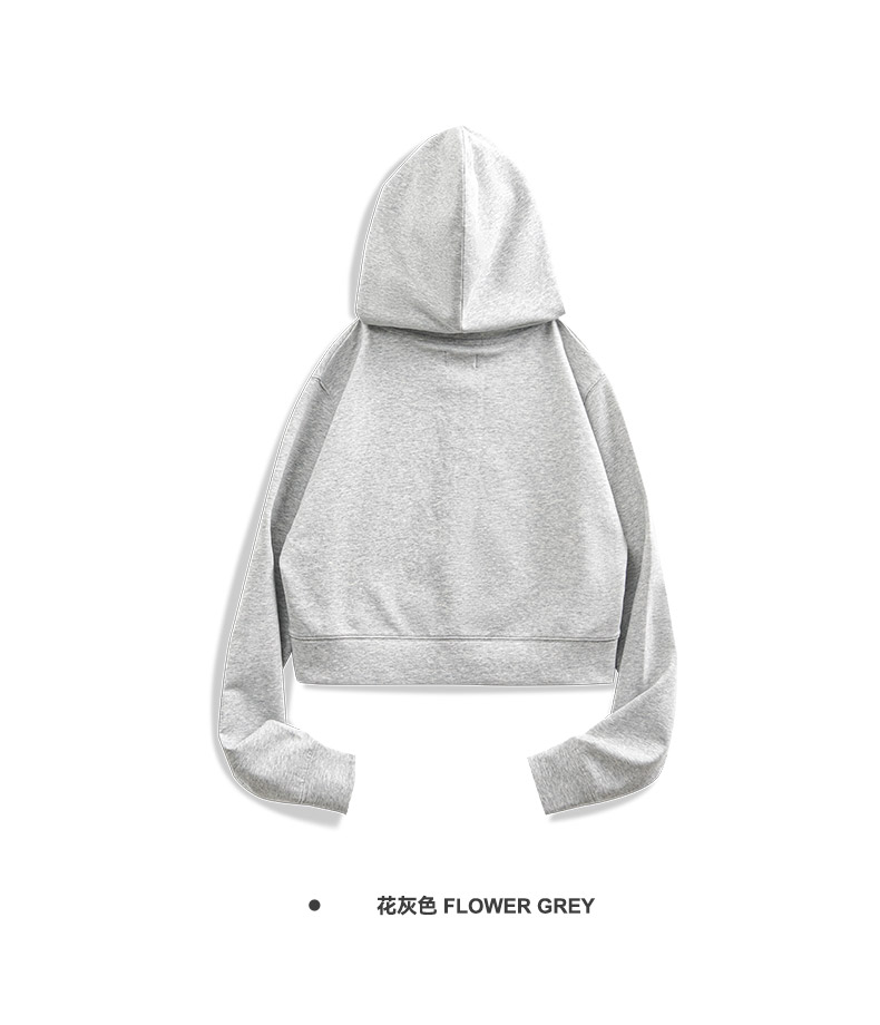 马登女装美式高腰短卫衣修身灰色连帽拉链卫衣开衫复古运动外套