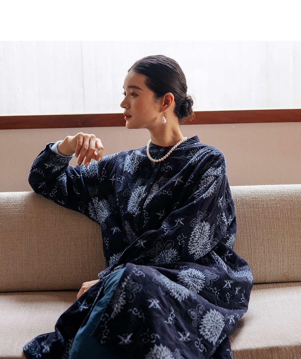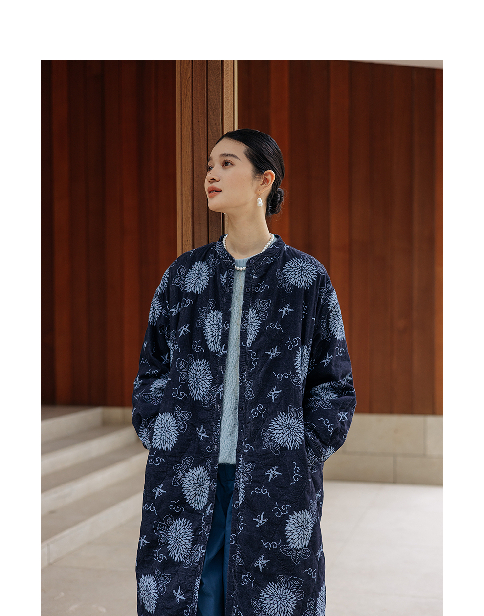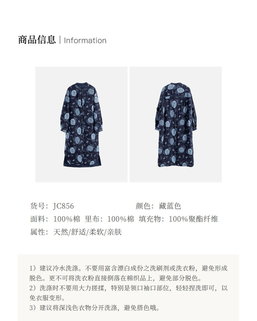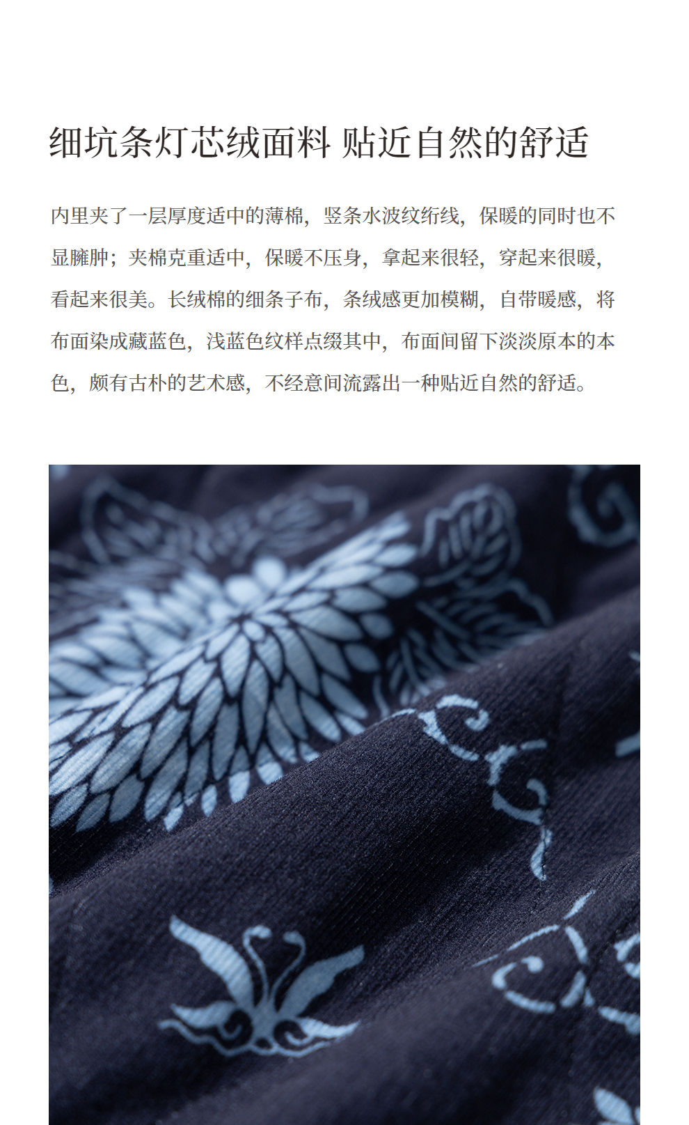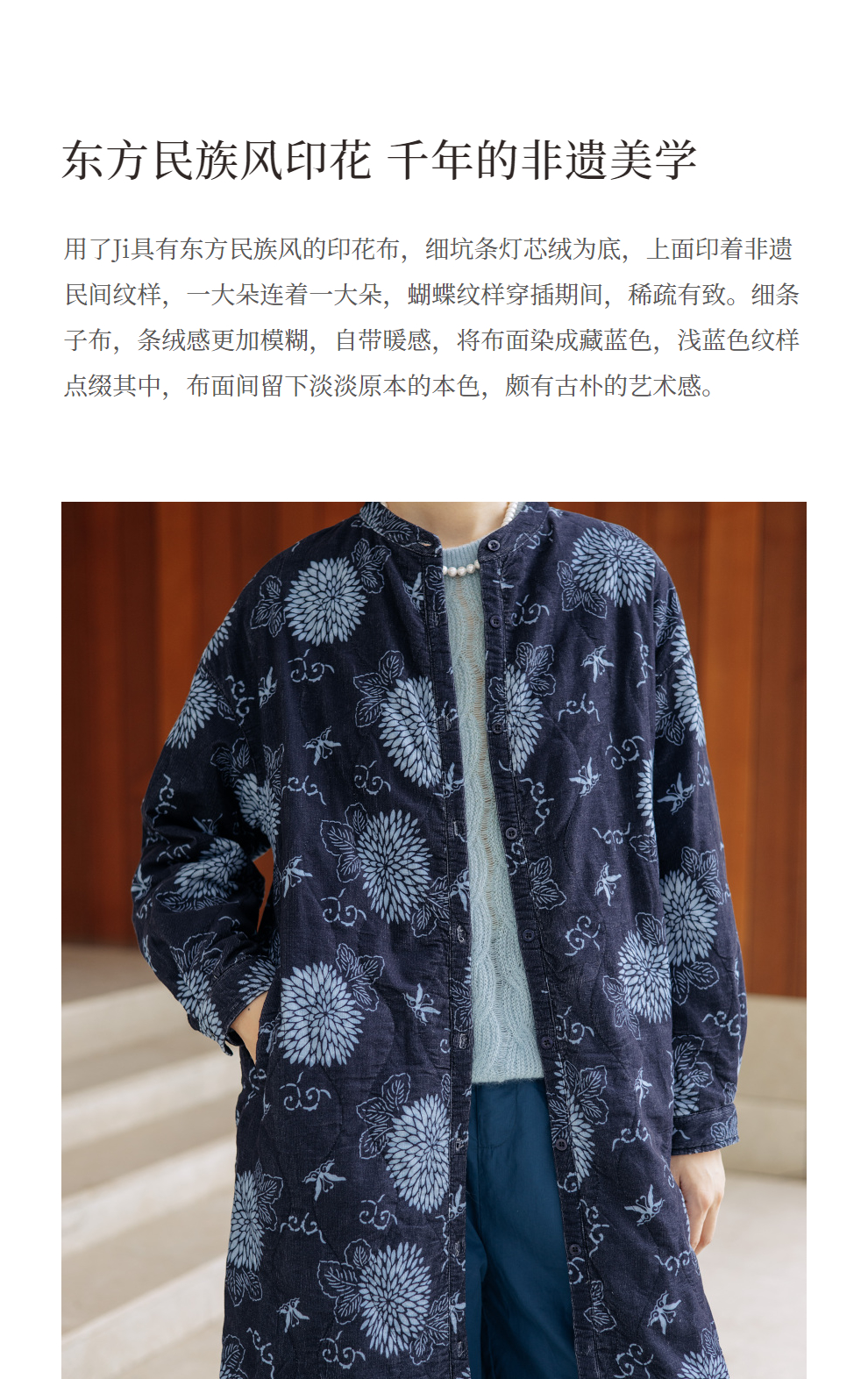 绽放旅行女装856朵/印花蓝裙细坑条灯芯绒圆领夹棉长袖开襟连衣裙