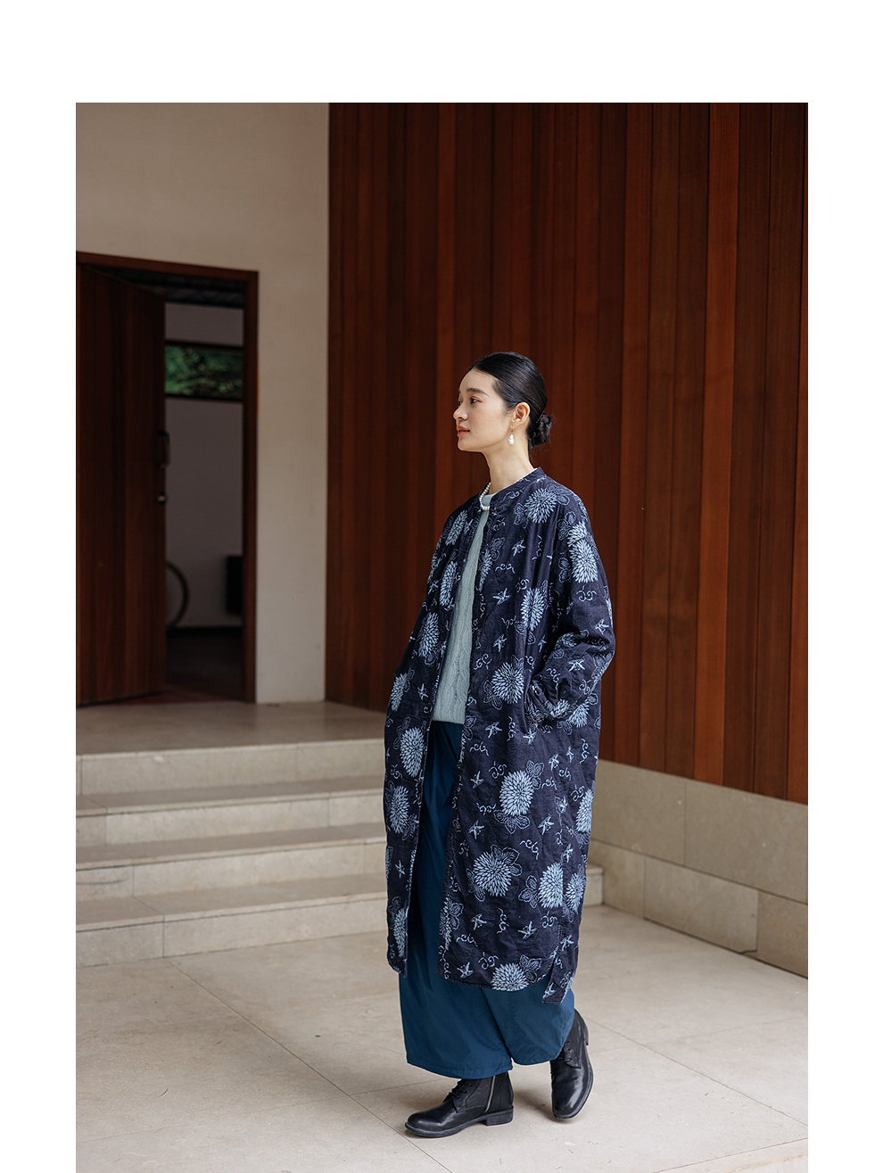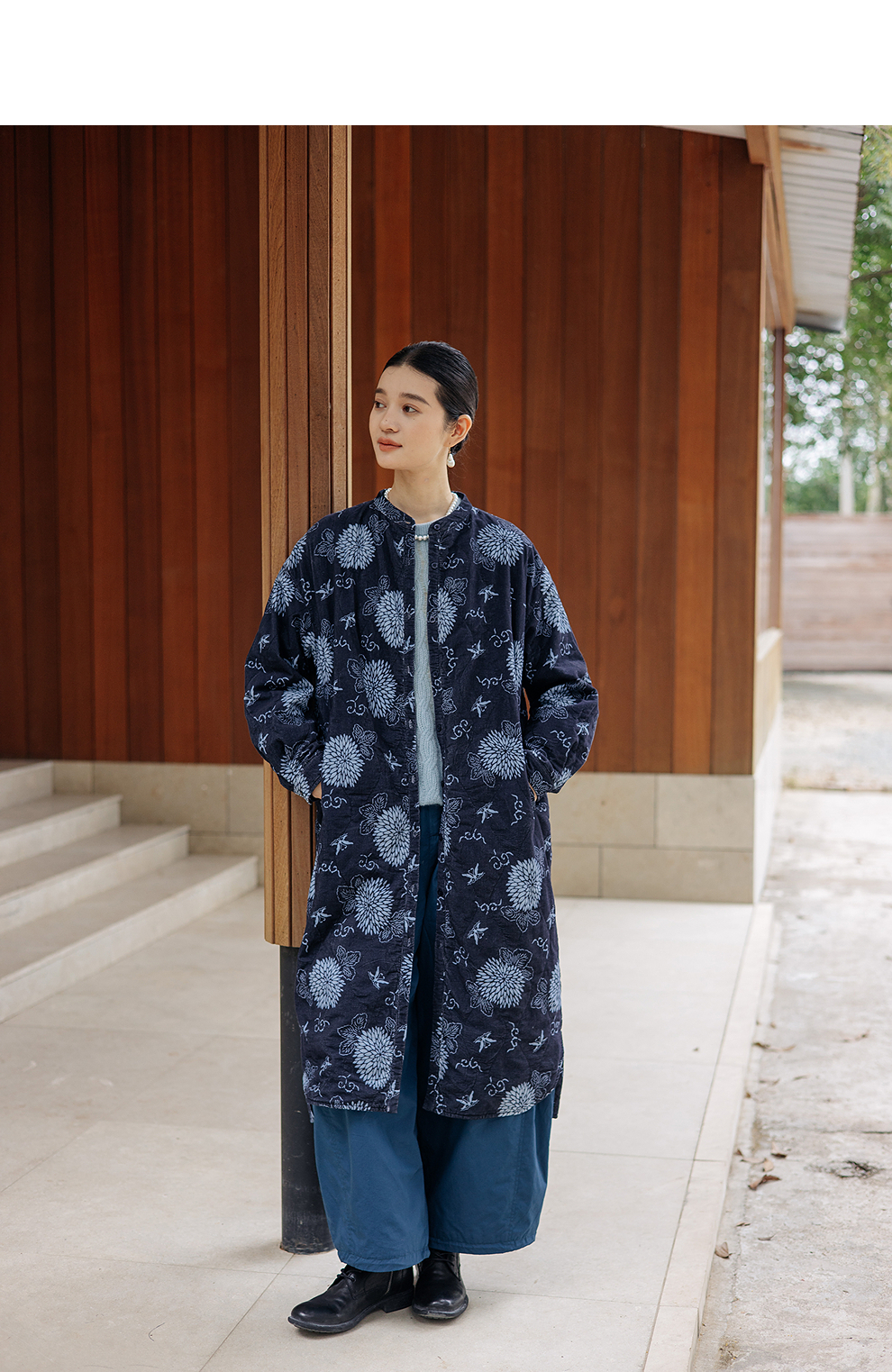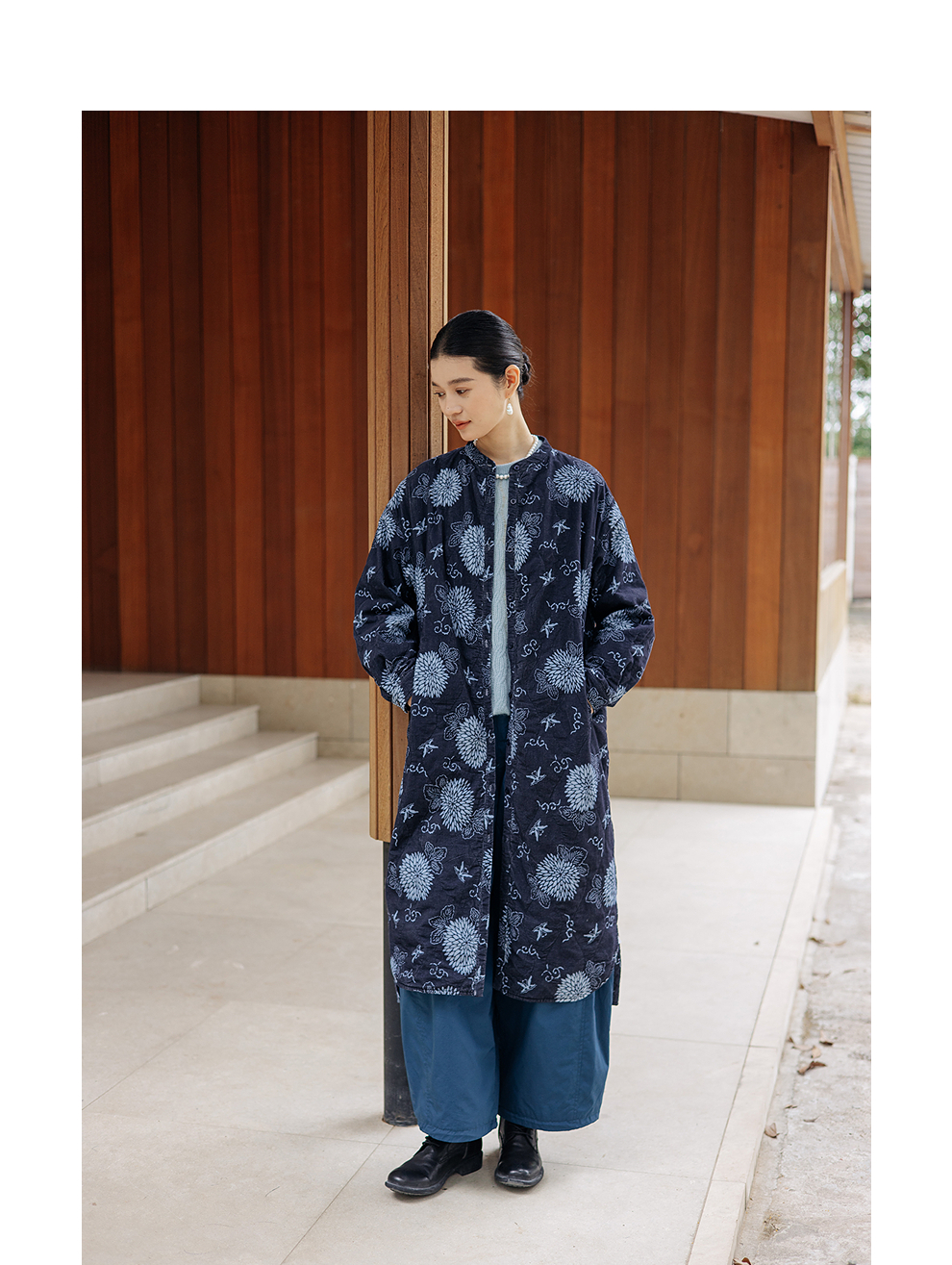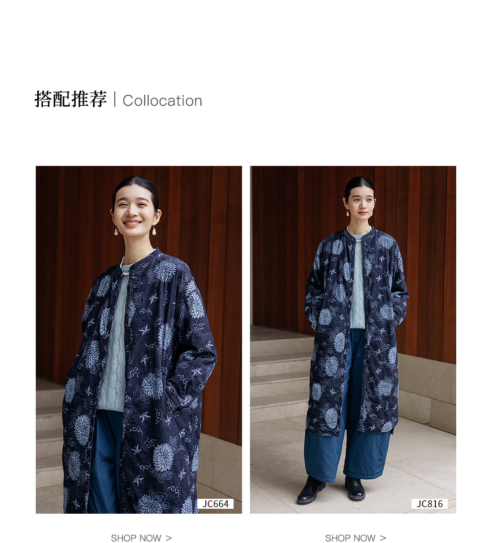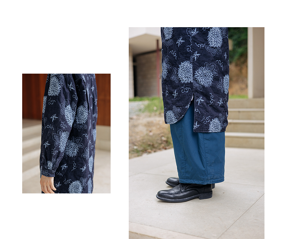 绽放旅行女装856朵/印花蓝裙细坑条灯芯绒圆领夹棉长袖开襟连衣裙