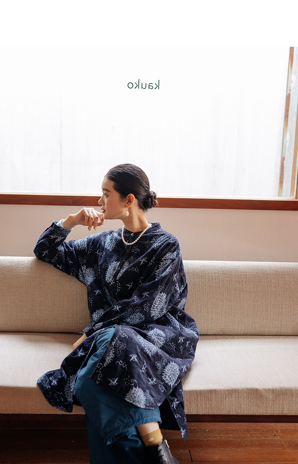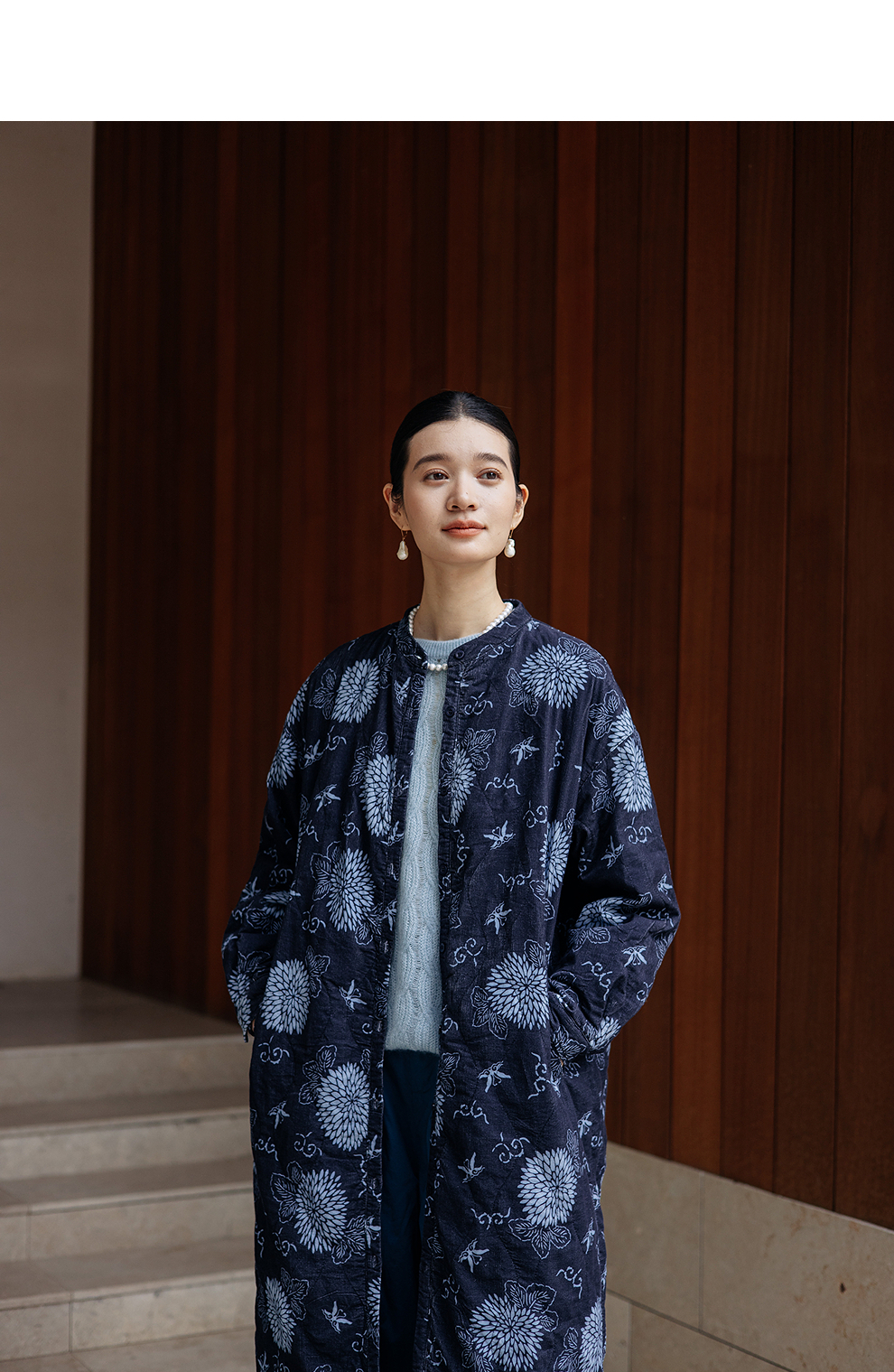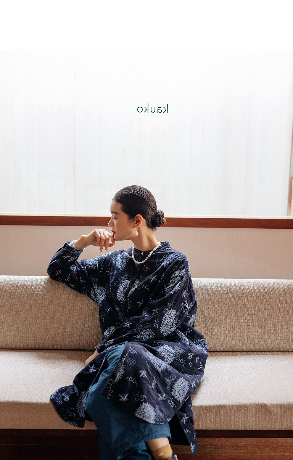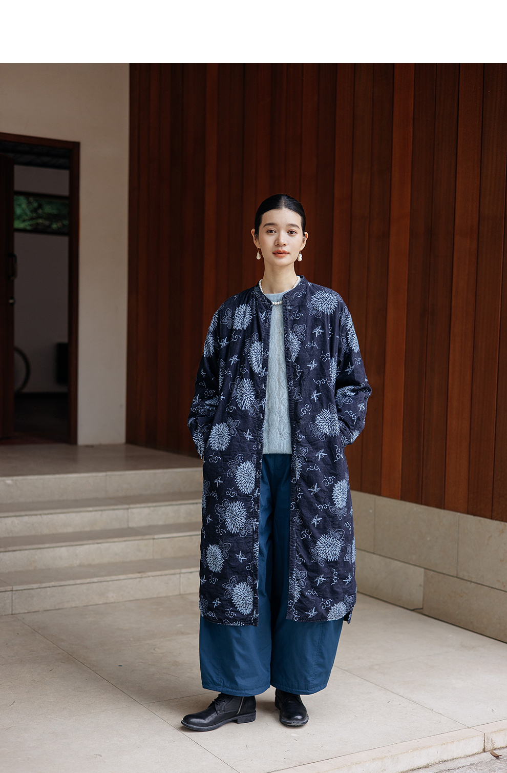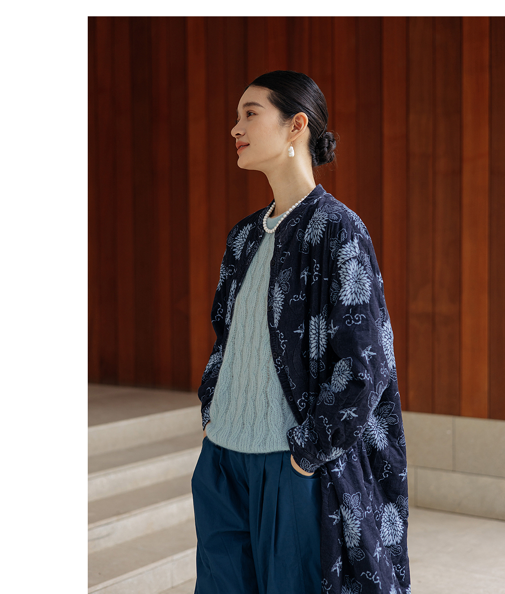 绽放旅行女装856朵/印花蓝裙细坑条灯芯绒圆领夹棉长袖开襟连衣裙