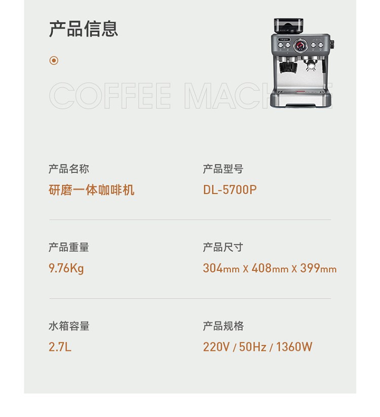 东菱研磨一体咖啡机DL-5700P【鲜知30.0】