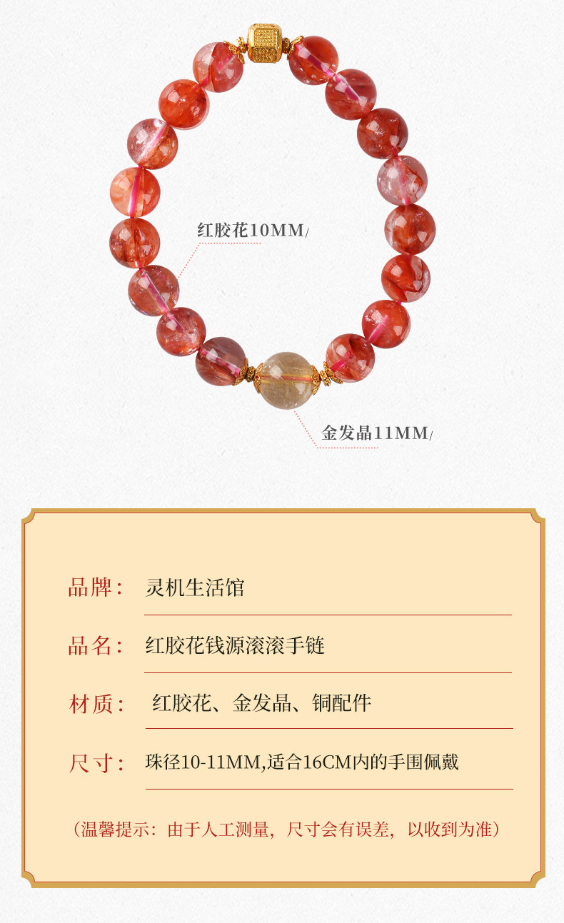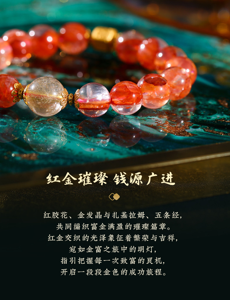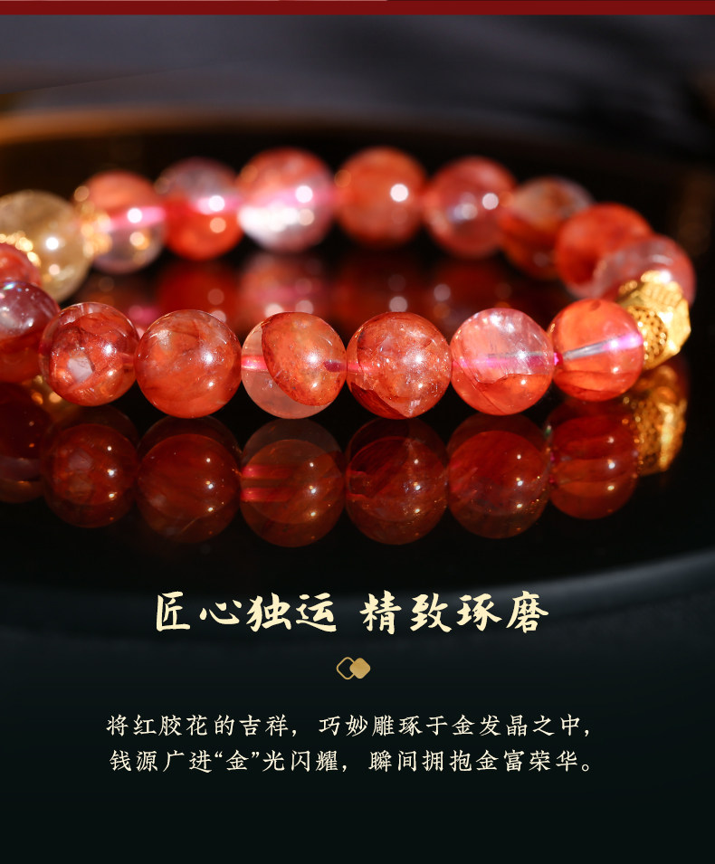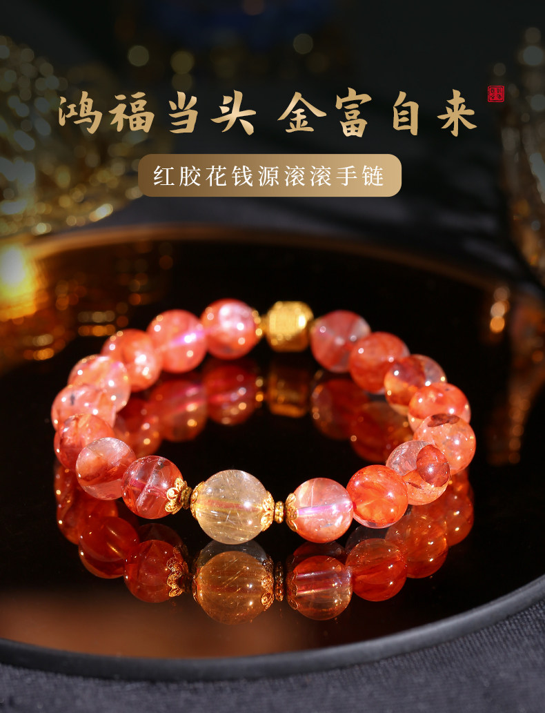 【祈愿吉品】红胶花钱源滚滚手链 鸿运当头金富自来 金发晶水晶手串