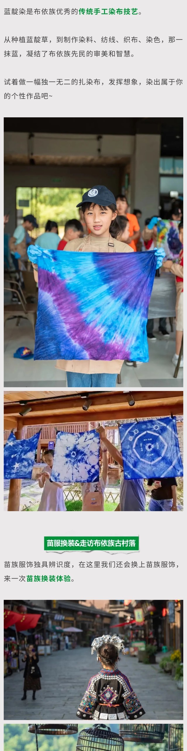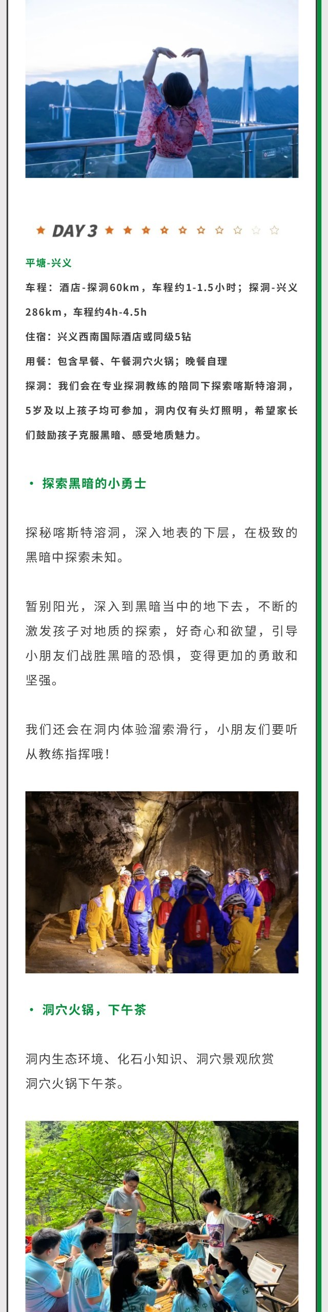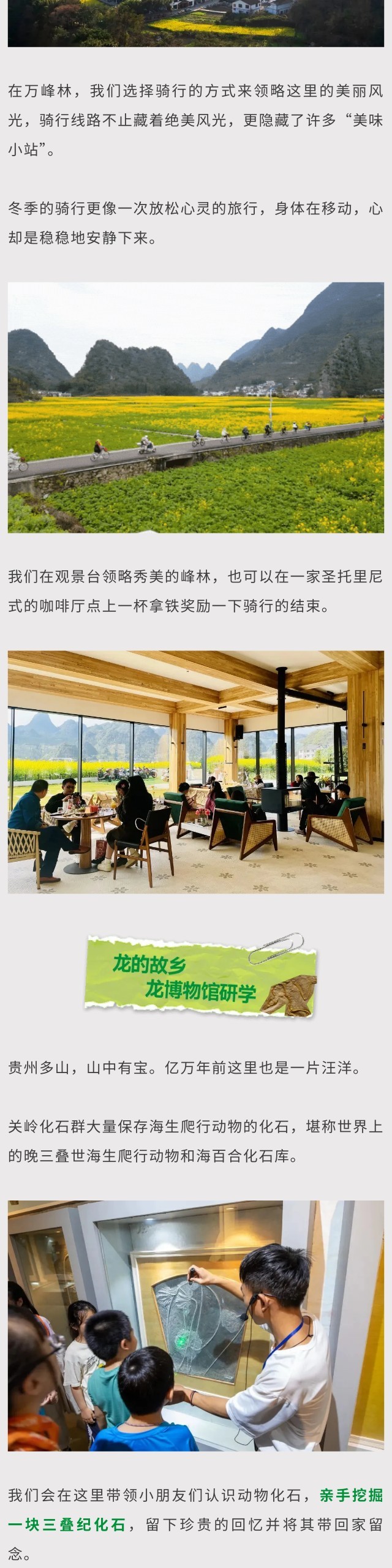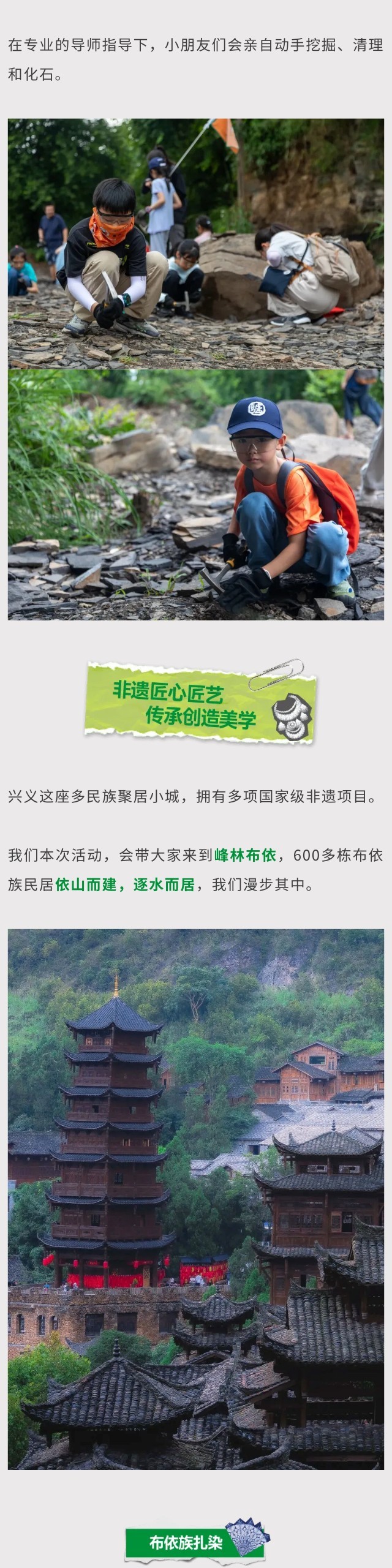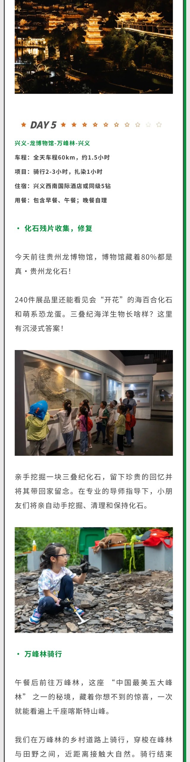 天眼研学、探洞和溜索、布依族扎染、苗服服饰体验、万峰林骑行(不会骑车或身高不够可安排景区观光电瓶车),龙博物馆讲解+化石残片收集+化石修复。