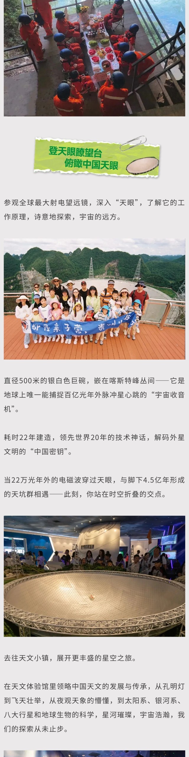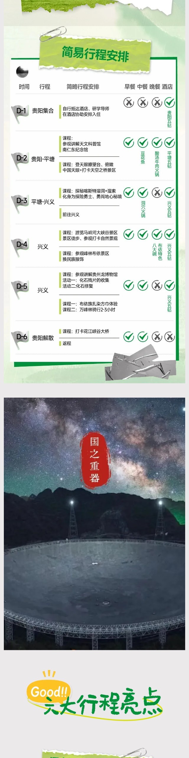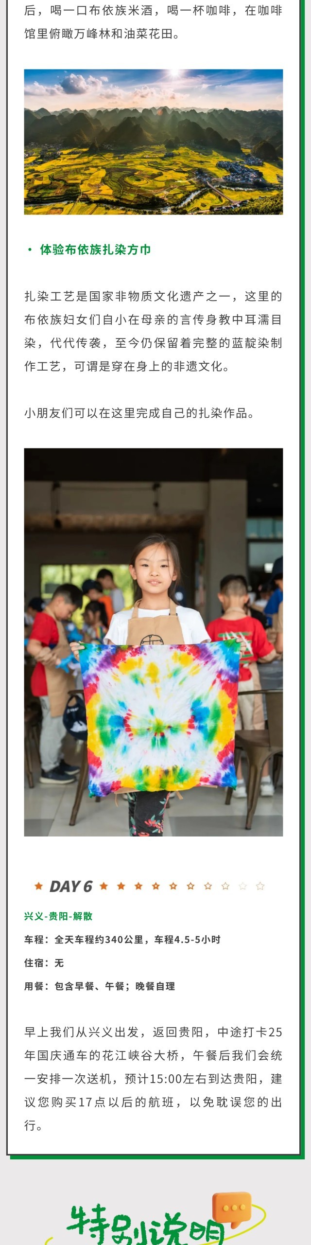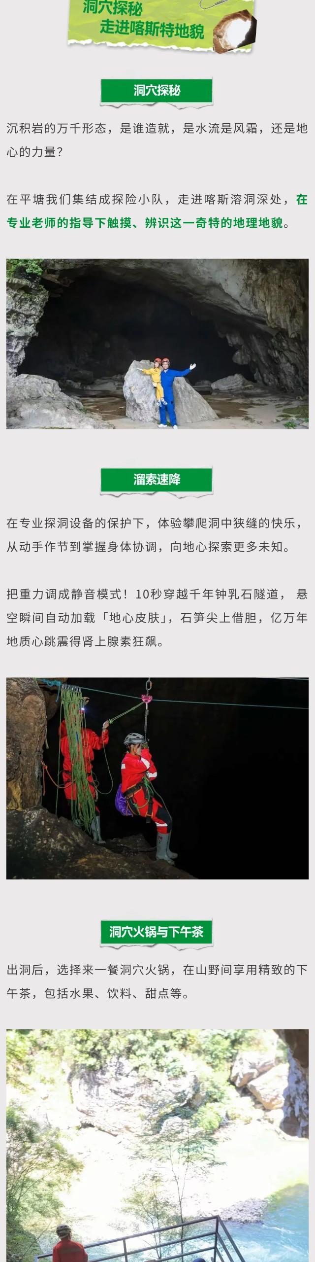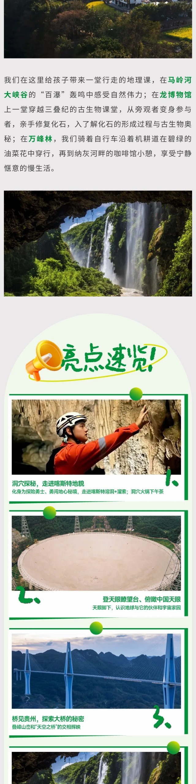 天眼研学、探洞和溜索、布依族扎染、苗服服饰体验、万峰林骑行(不会骑车或身高不够可安排景区观光电瓶车),龙博物馆讲解+化石残片收集+化石修复。