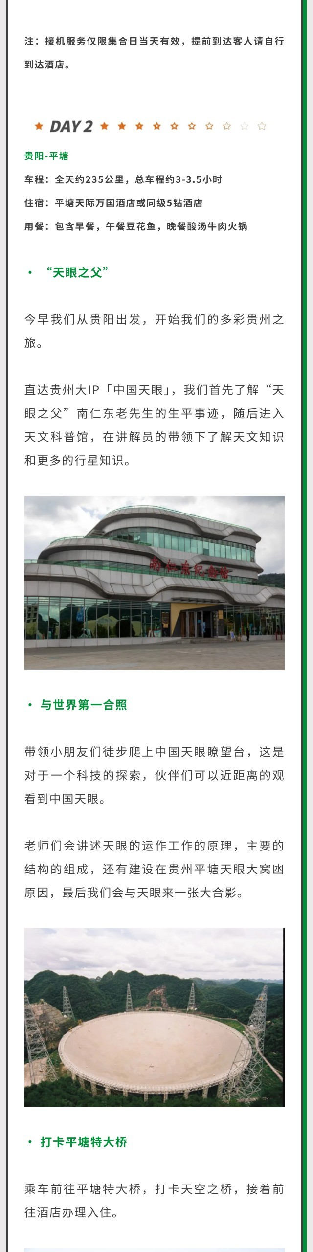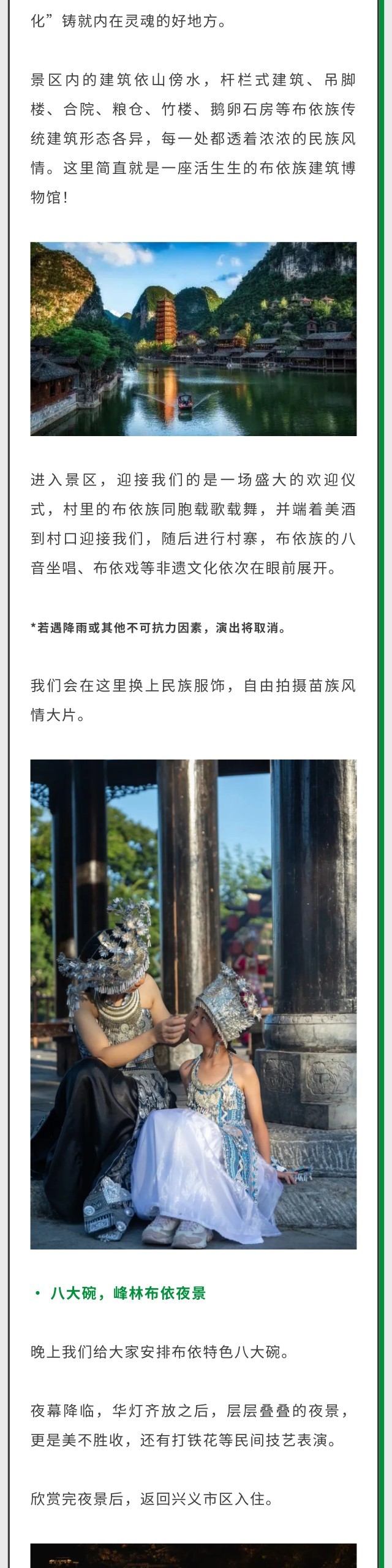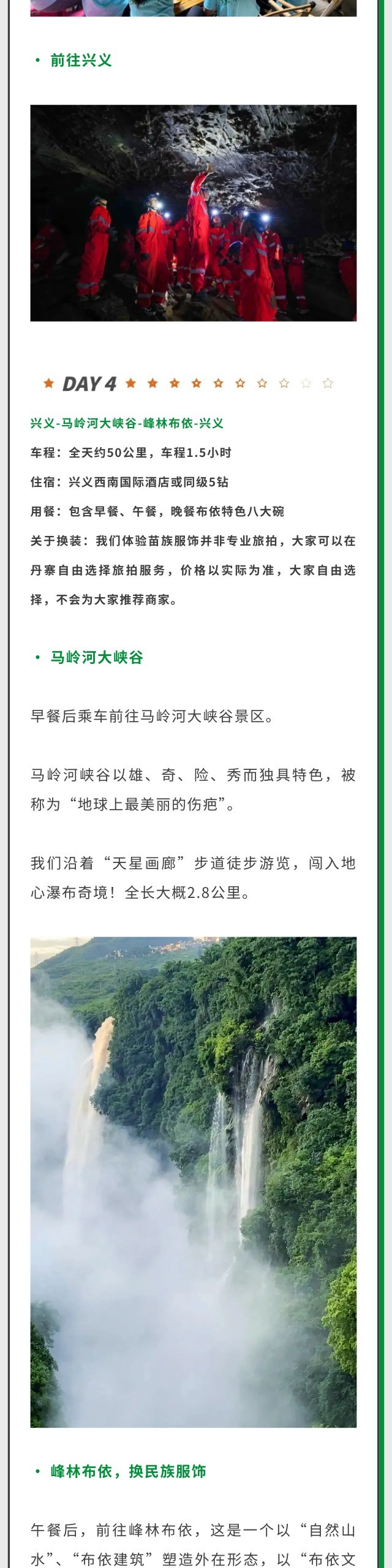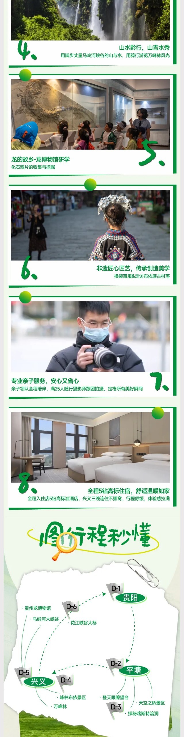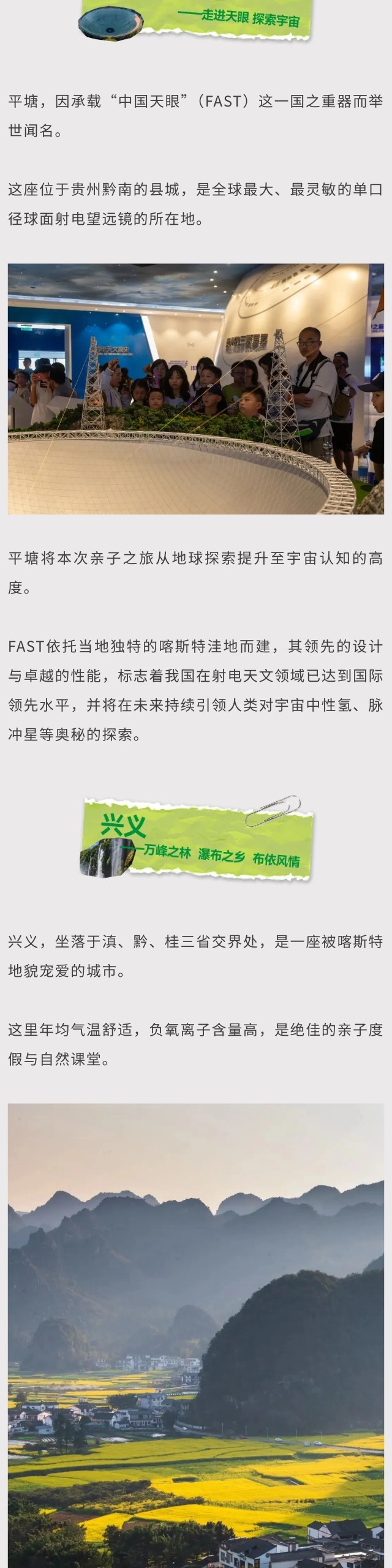 天眼研学、探洞和溜索、布依族扎染、苗服服饰体验、万峰林骑行(不会骑车或身高不够可安排景区观光电瓶车),龙博物馆讲解+化石残片收集+化石修复。