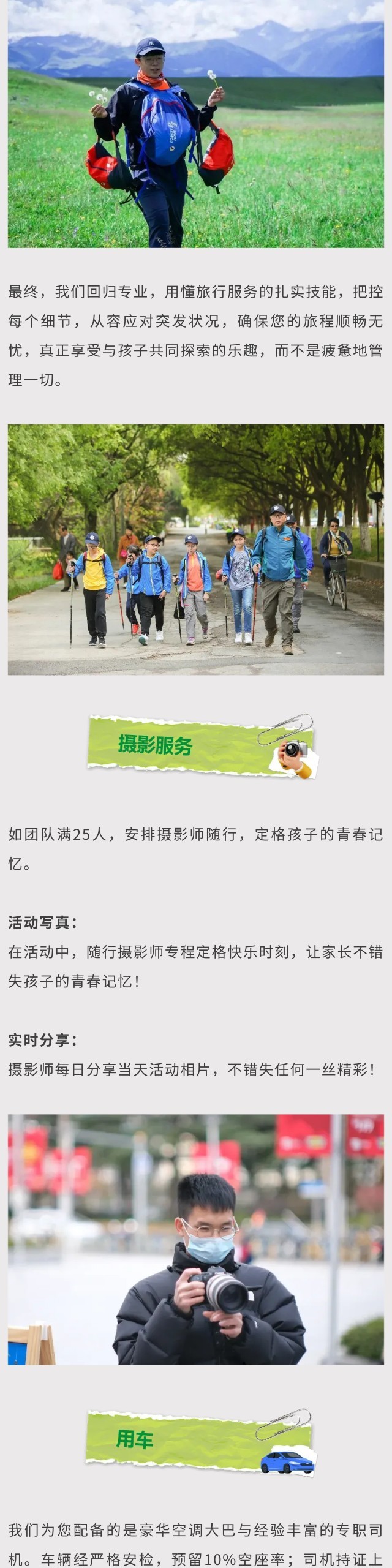 每个团队不少于2位教练or导游,即包含一名户外领队+一名当地专业导游;每团满25人配备跟团摄影。