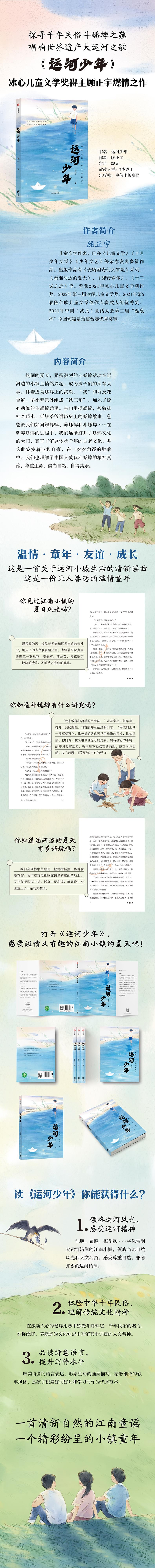 《运河少年》以世界遗产大运河文化为背景,聚焦中国传统民俗“斗蟋蟀”,讲述三位少年智斗蟋蟀,收获友谊和爱的励志成长故事。斗蟋蟀活动在这座运河沿岸的小镇上悄然兴起,“我”和好朋友花吉道、毕小蓉也跃跃欲试。但我们始终赢不了罗小胖,还在向他追讨常胜秘诀时被摆了一道。后来,在毕小蓉爷爷和爸爸指点下,我们了解到斗蟋蟀的历史,以及其“崇尚自然,自得其乐”的文化内涵,懂得如何寻找蟋蟀和精心照养蟋蟀。后来,我们终于凭借英勇的蟋蟀“飞将军”大获全胜。但没想到,我们的高调引来了一个更大的麻烦,为了保护朋友和爸爸,“我”不得不忍痛割爱,将蟋蟀罐用力往墙上砸去,而少年那热烈又惊险的夏天也随之结束。作品题材新颖,用质朴语言和跌宕情节描写具有浓厚东方色彩的蟋蟀文化,趣味盎然,又深接地气,展现出传统民俗的魅力与内涵,有利于青少年了解和传承传统民俗。作品还描写了大量具有地域特色的风景、建筑、食物、手工艺、生活方式等,生动地......