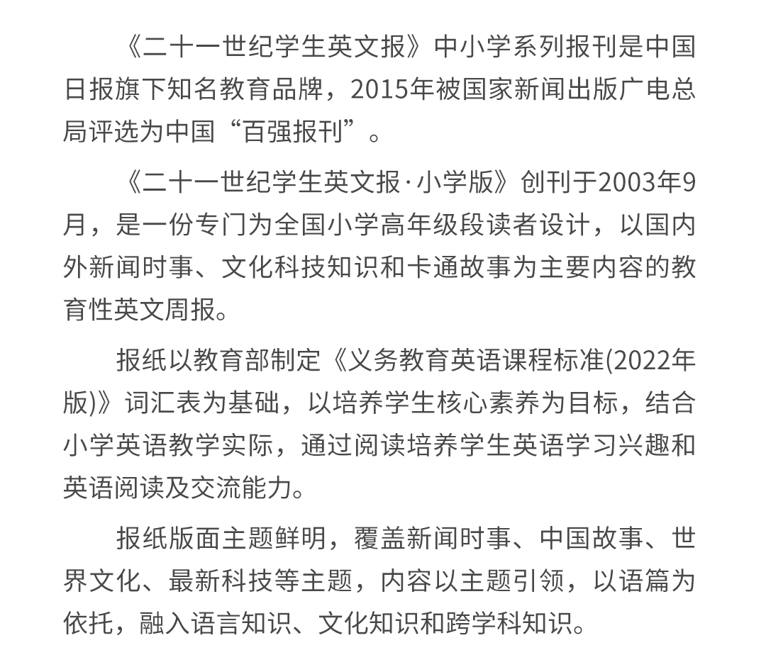 21世纪报社全新推出《教材同步阅读》产品,小学4-6年级读者可自选人教版/外研版,搭配小学版报纸助力英语学习能力提升。