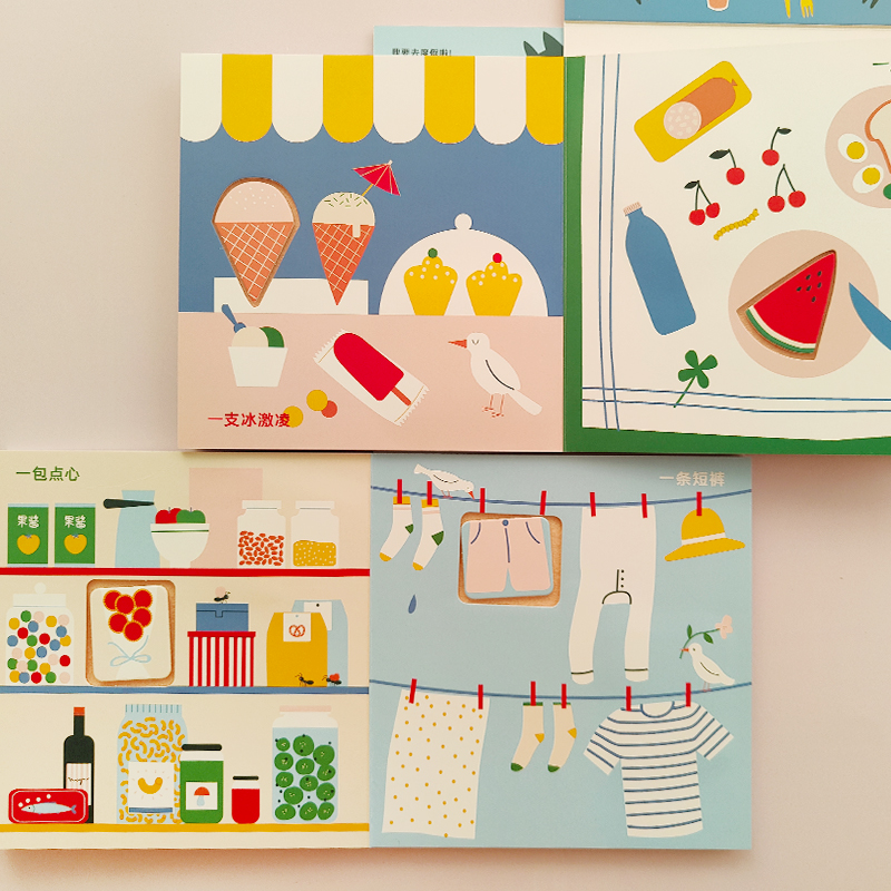 除了认知物品,还可以用这本书来编故事。可以进一步观察每页的场景和物品,想一想狼先生为了找食物都去过了哪里呢?狼先生爱吃什么食物呢?……一边阅读和拼贴,一边发挥想象力讲出一个完整的故事,也是一项有趣的体验。