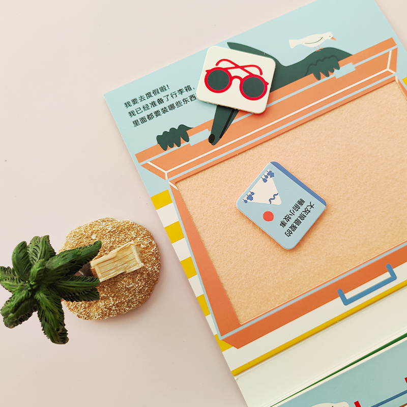 这本书以狼先生的假期快要到了,准备去度假为线索,让孩子们帮忙寻找合适的日常用品贴在狼先生的行李箱里。孩子可以观察并说出页面上都有哪些物品,可以取下来的那件物品是什么,这也让整个认知过程更加好玩和有趣。