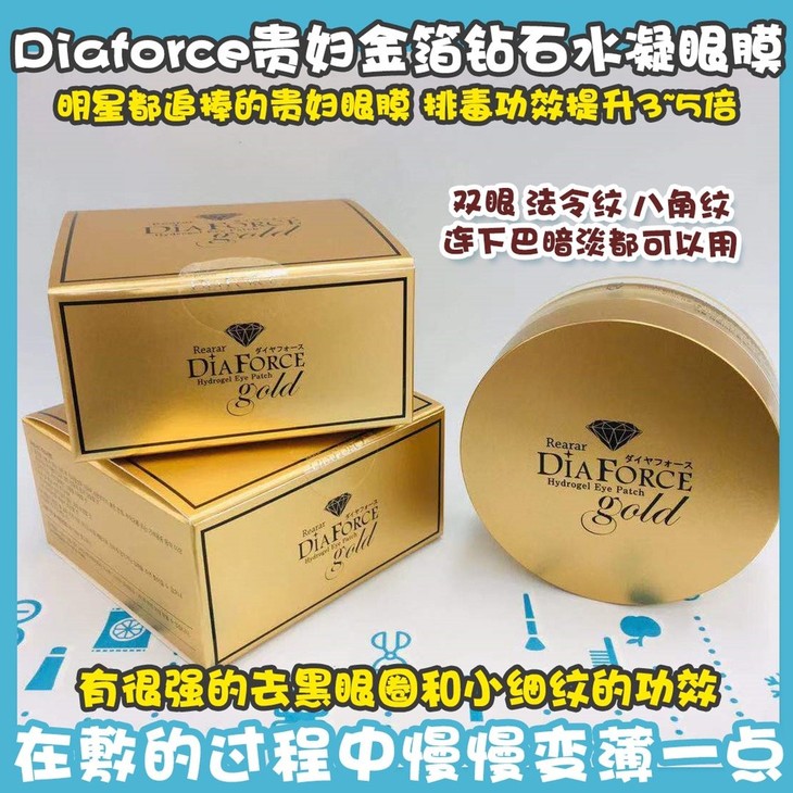 Diaforce贵妇金箔钻石水凝眼膜👍 明星都追捧的贵妇眼膜👀,一盒60片,排毒功效提升3~5倍🔝,有很强的去黑眼圈和小细纹的功效🕸,是现代OL的最爱😘。不光是贴双眼☑,法令纹☑,八角纹☑,连下巴暗淡都可以用✨。密着力很强,水分多💦,是胶原体,在敷的过程中慢慢变薄一点,敷20分钟-30分钟🕓,第二天起来脸蛋滑滑滑😬