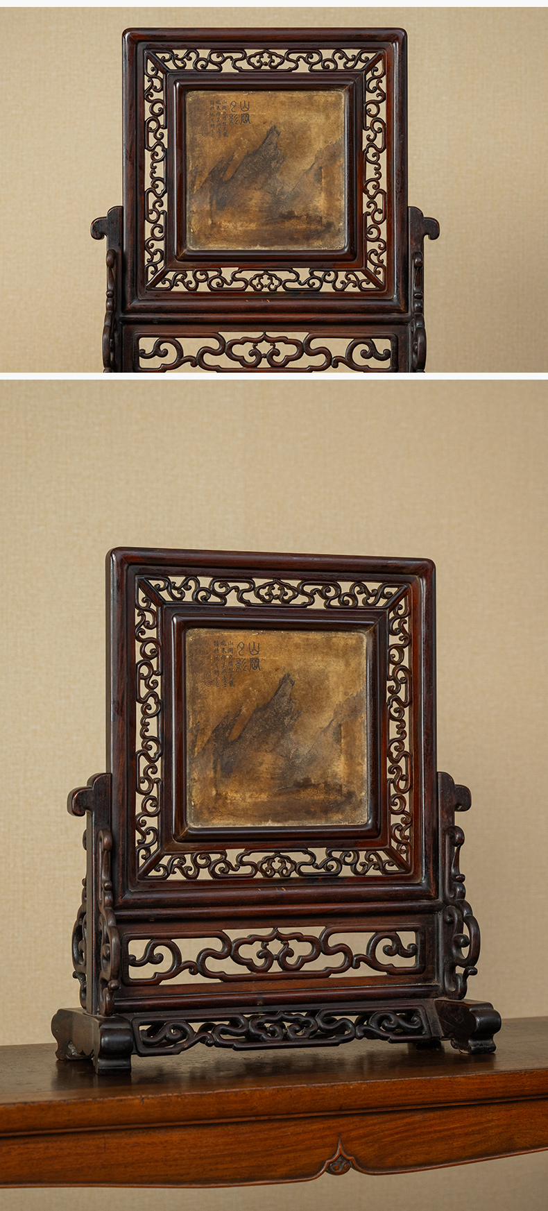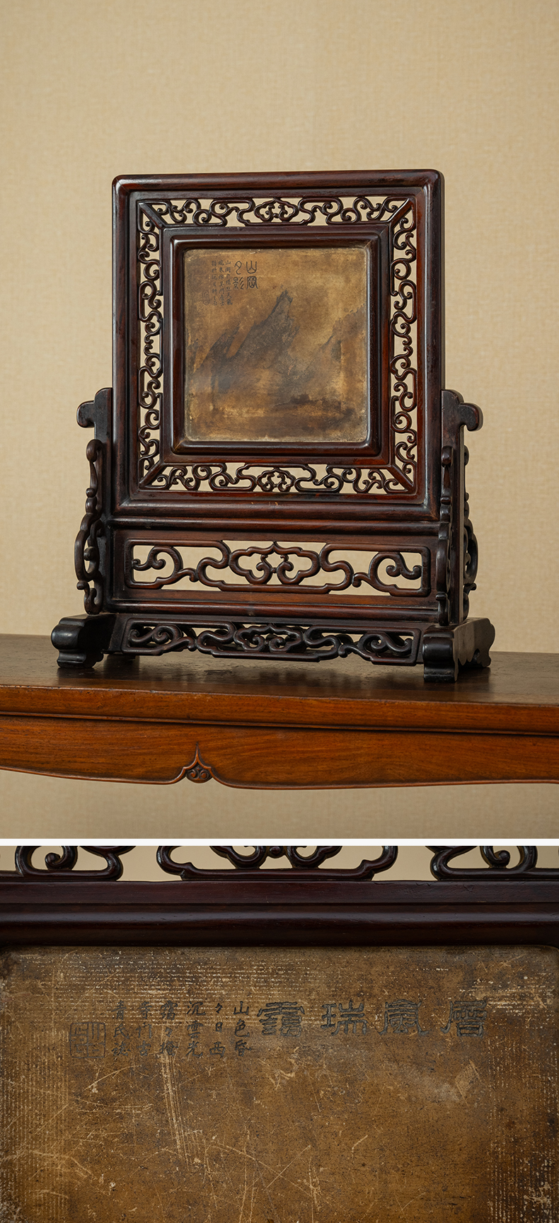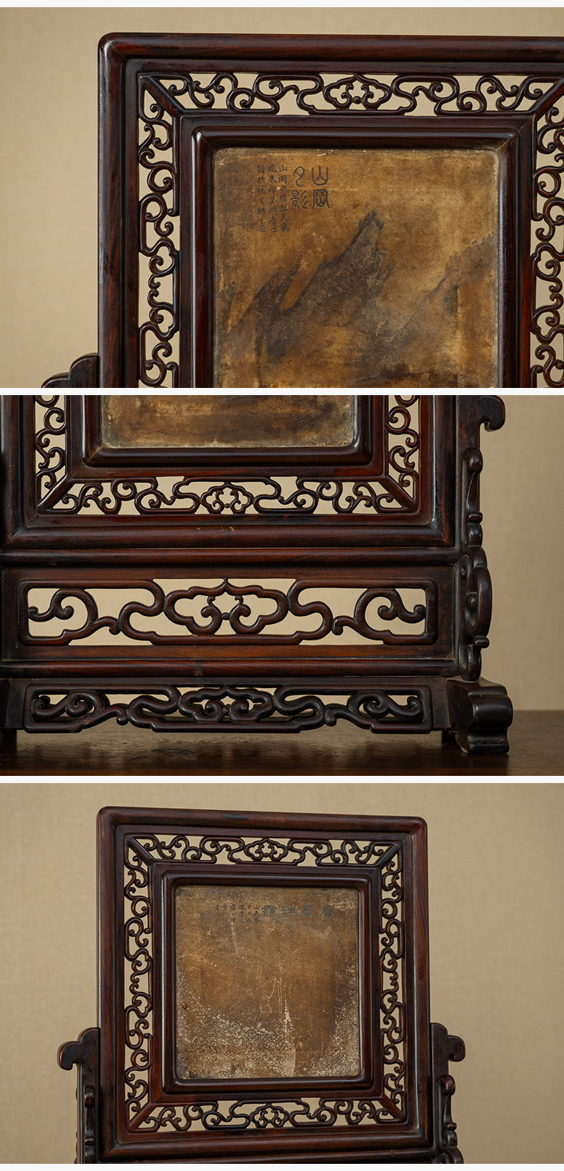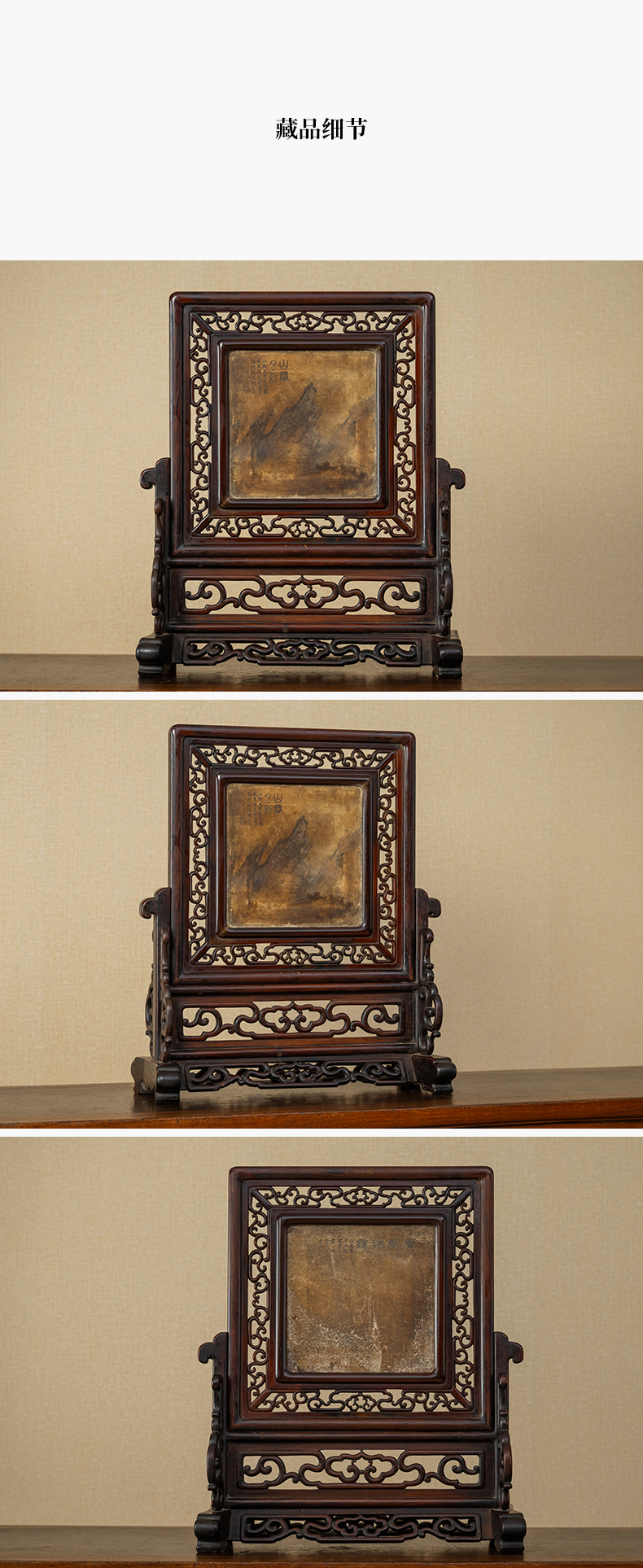 清代 红木镶瘿木嵌寿山石山水人物插屏