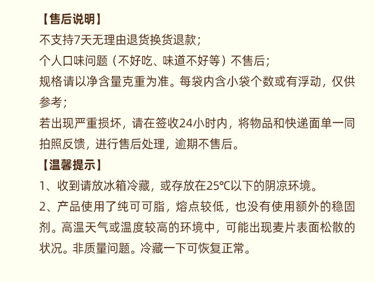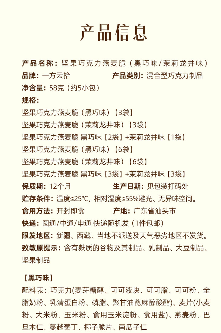 品名:坚果巧克力燕麦脆 规格1:黑巧味58g/袋*3袋 规格2:茉莉龙井味58g/袋*3袋 规格3:58g/袋*3袋组合(黑巧味*2+茉莉龙井味*1) 规格4:黑巧味58g/袋*6袋 规格5:茉莉龙井味58g/袋*6袋 规格6:58g/袋*6袋组合(黑巧味*3+茉莉龙井味*3);拍几份发几个包裹,不一定能同时到达,请耐心等待; 发货地/产地:广东 包装方式:袋装 保质期:12个月 物流信息:默认中通/韵达快递,不支持指定快递 发货区域:西藏、新疆不发; 物流详情:周六、周日及节假日除外,正常48小时内发货,到货时间约为2~5天,请耐心等待 售后说明:收到货后有质量问题,在24小时内都可以拍照(坏品+快递单面箱子一起拍)上传,申请按坏品比例理赔或联系客服,生鲜性质特殊,不支持7天无理由退换货;因地址错误,手机号联系不上,拒收等造成的损失无法售后,请理解; |