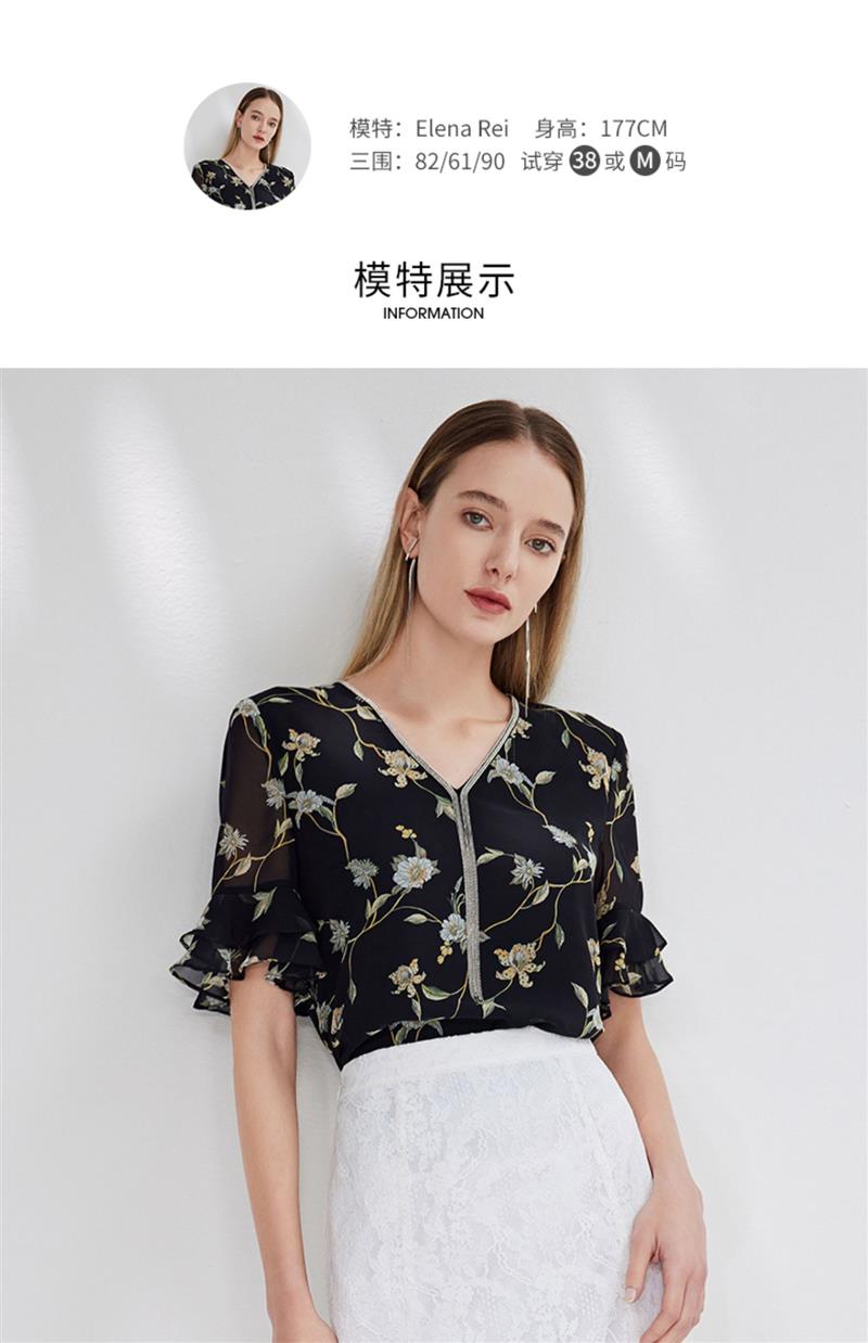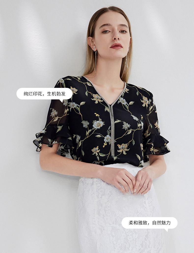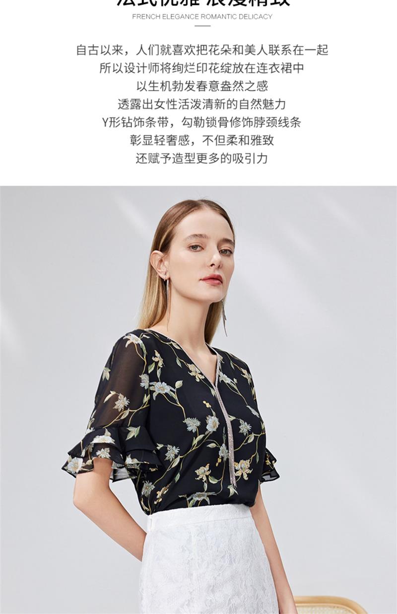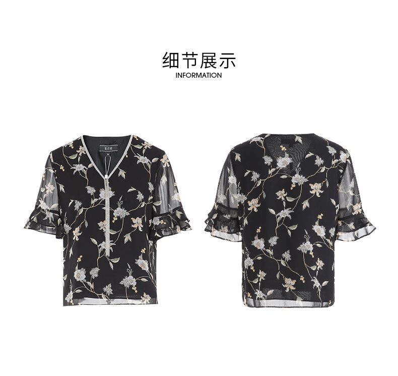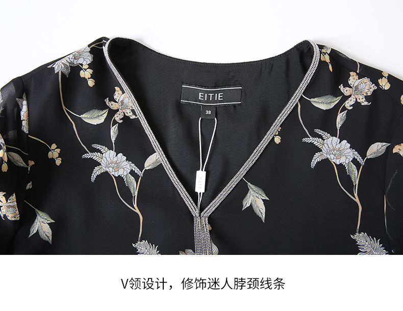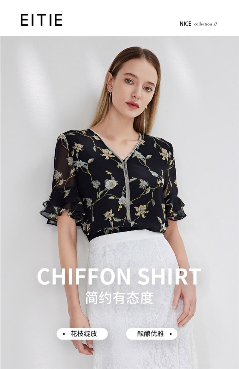 EITIE爱特爱复古法式优雅印花V领直筒短袖雪纺上衣显瘦夏季新款B13126