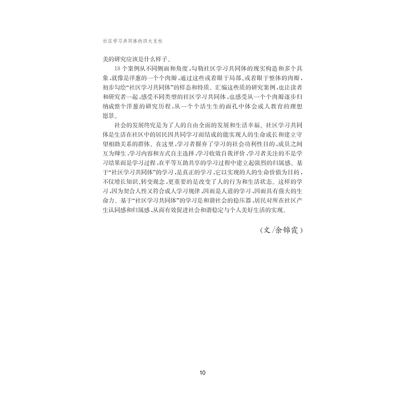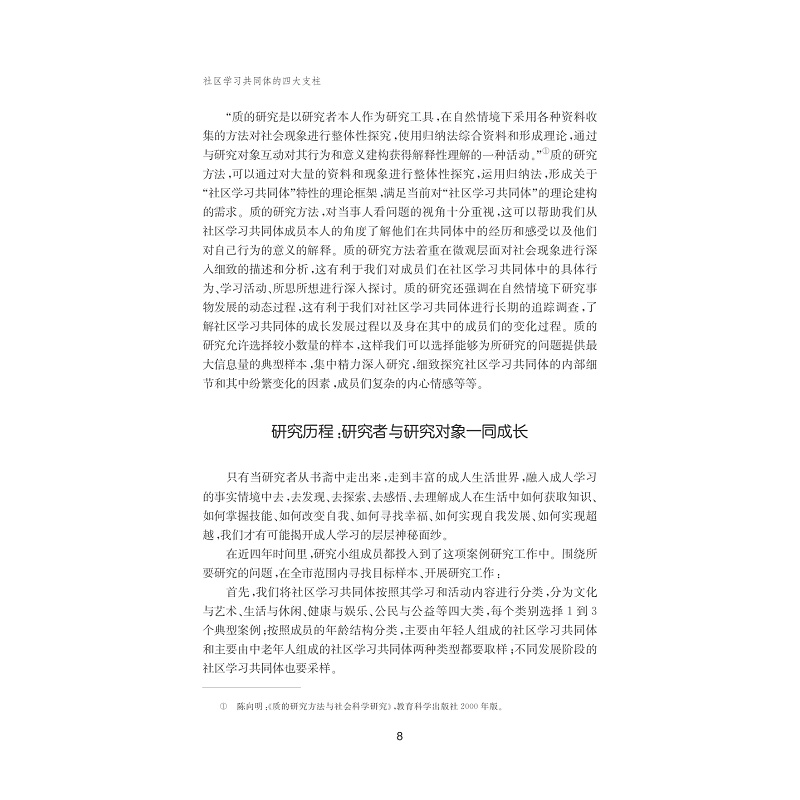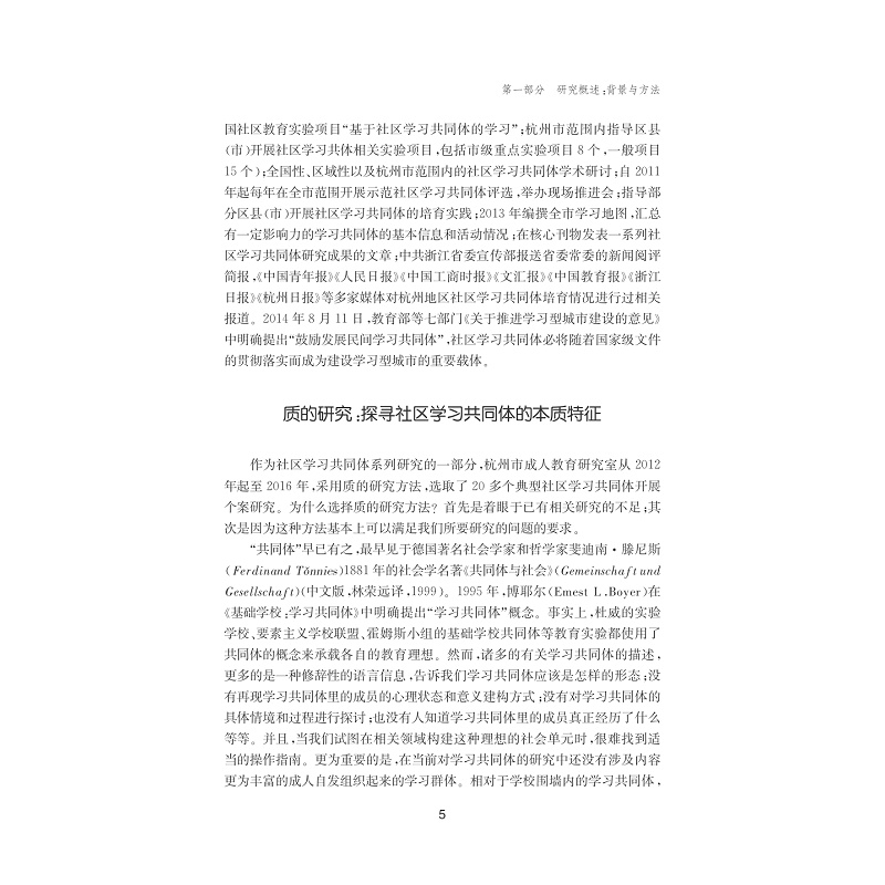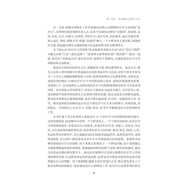 本书主要由20篇关于社区学习共同体的质性研究报告及由此而得出社区学习共同体的本质特性(四大支柱)二部分所组成。多名专业研究者经过三年时间,对20个不同类别的典型社区学习共同体进行跟踪,在实地参与学共体活动、以及研究者与被研究者的互动中获取的大量的一手资料,在此基础上开展整体性探究和价值性判断。研究者从不同侧面和角度,勾勒社区学习共同体的现实构造和多个具象,勾画出社区学习共同体的基本样态,梳理出社区学习共同体的“本质意志”、“守望相助”、“共同学习”、“内评价”四大本质特征。