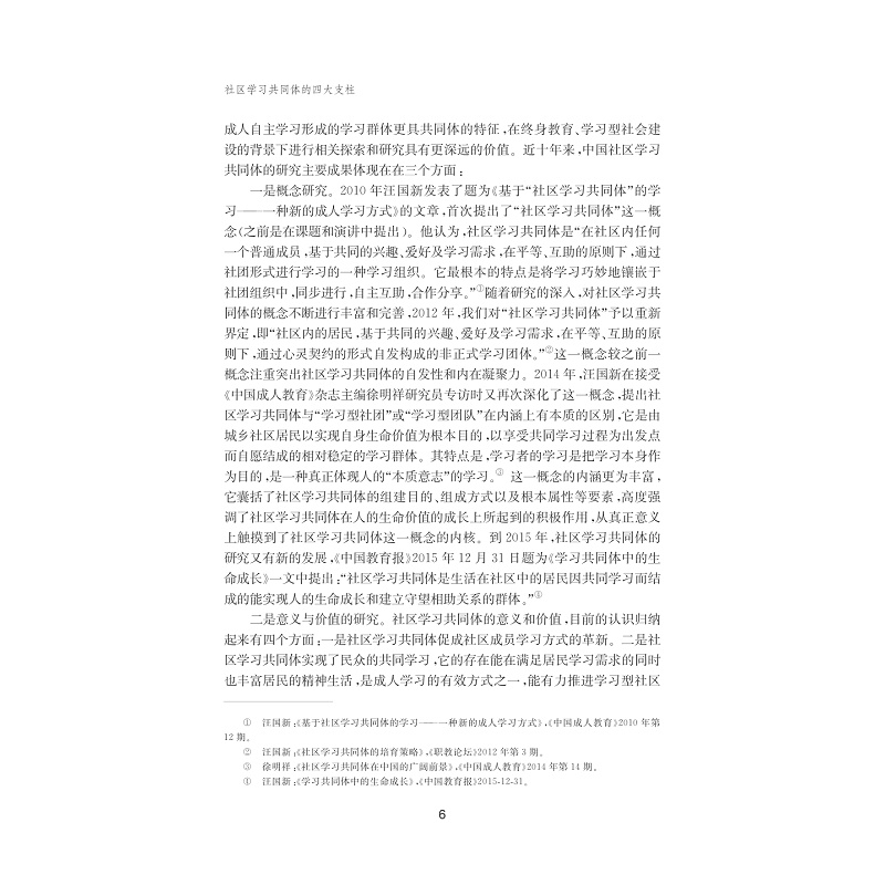 汪国新,杭州市成人教育研究室主任,中国成人教育学术委员会委员,教育部社区教育专家组成员,中国成人教育协会科研机构委员会副理事长,浙江省成职教协会副秘书长。已由浙大出版社出版《资源的合建与共享——成人教育共同体建设研究》,由浙江教育出版社出版《成人双证制教育:提高人均受教育年限新路径》《走向学习型城市》,由浙江科技出版社出版《中国社区教育30年名家访谈》、《杭州社区教育发展报告》、《市民素养提升工程系列读本》等专著。九年前提出“社区学习共同体”概念,持续九年研究不辍,是国家社科基金课题《社区学习共同体生命价值与成长机理》研究的主持人。