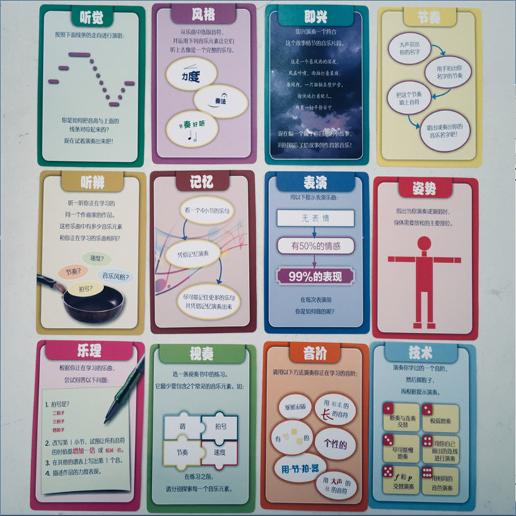 这套卡片主要内容共52张(不含1张版权页及1张新书推荐页),涵盖音乐素养训练的12个方面,如表演、视奏、听辨、乐理、音阶等,每个训练方面又分四至六个具体的训练内容。教师在使用时可以让学生随机抽出一张,然后玩音乐小游戏。不同的卡片有不同的游戏提示,不同的训练类别用不同的颜色进行区分,让音乐的教与学更加生动有趣。卡片的版式设计完全按照幼儿心理进行设置,文字、图片的排版有意和字义吻合,让学生乐入其中。