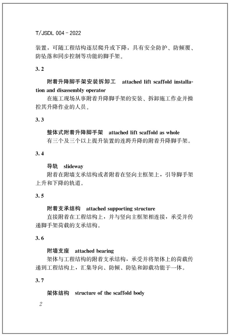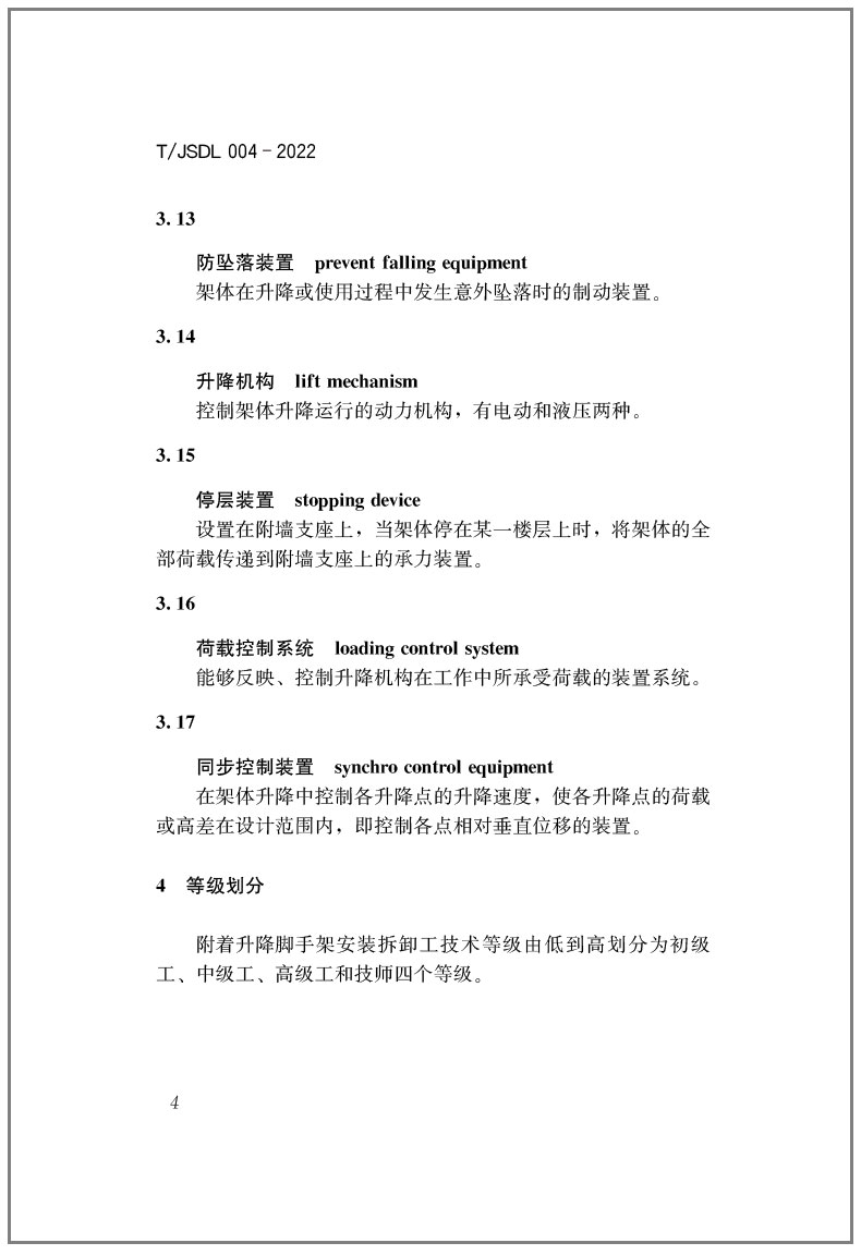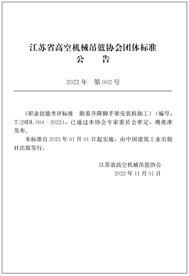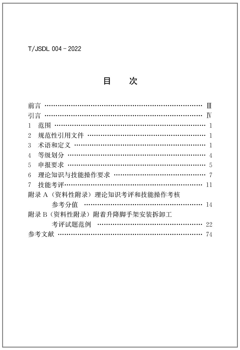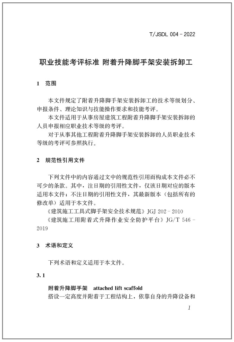 书名:职业技能考评标准-附着升降脚手架安装拆卸工T/JSDL004-2022