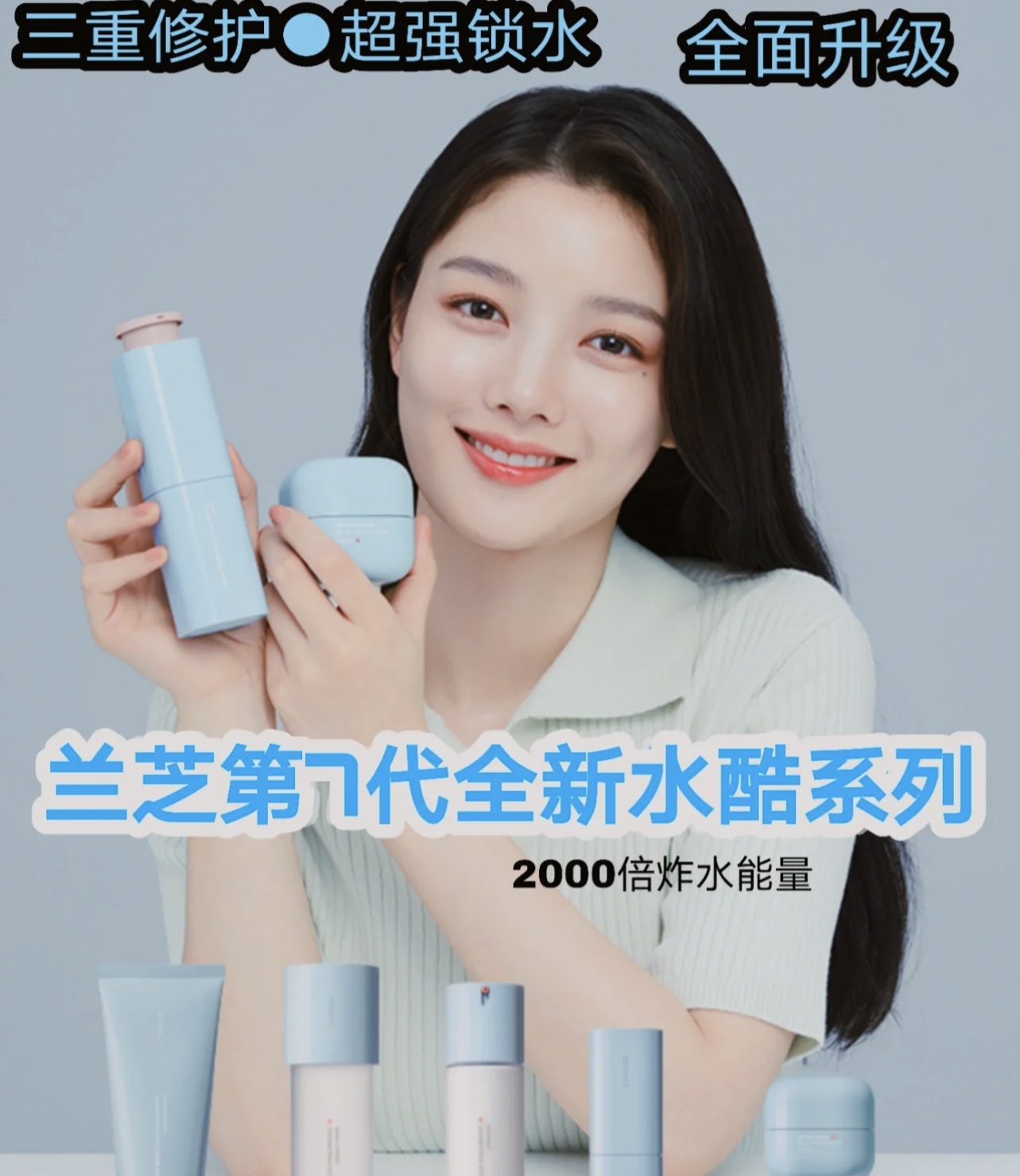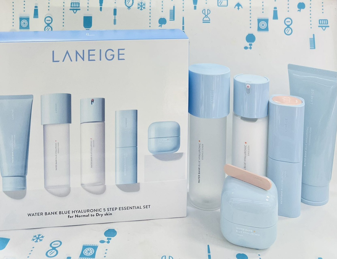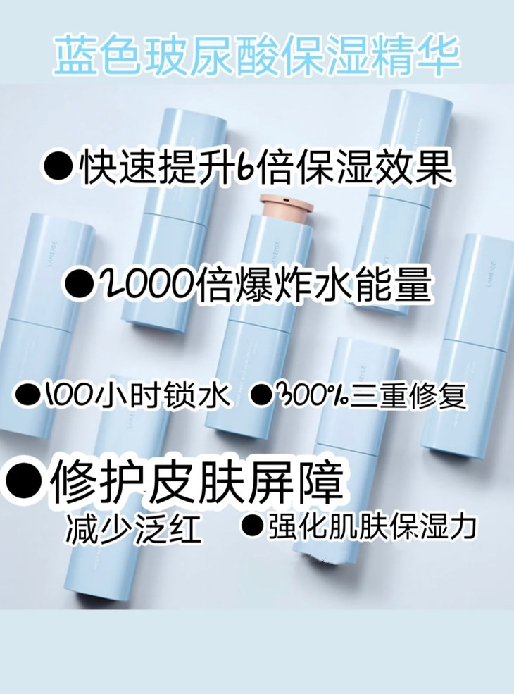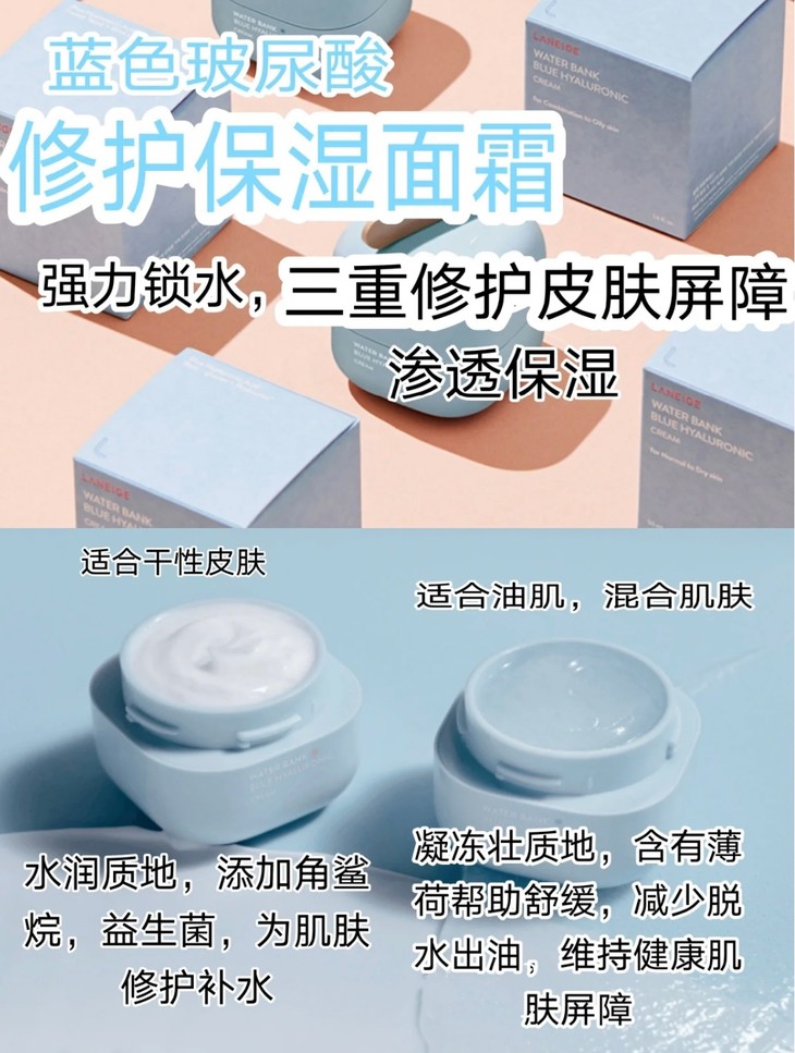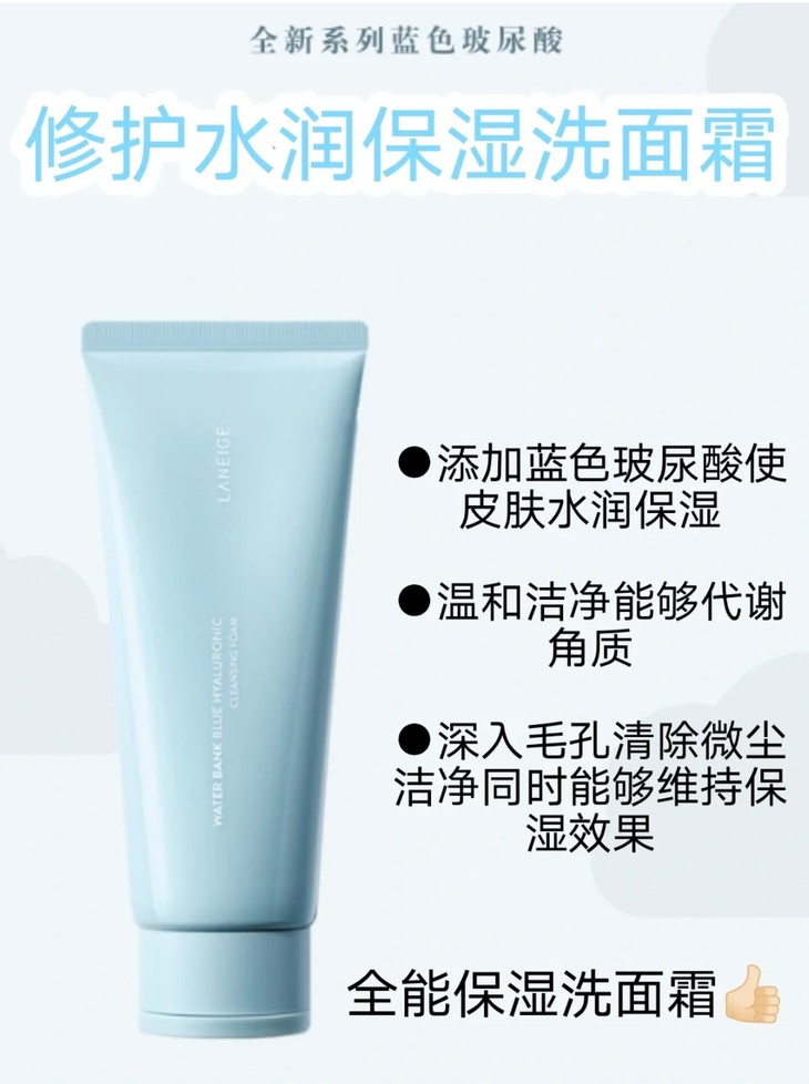 兰芝新水酷透明质酸五件套(特润)👍 要给设计兰芝【小蓝盾】的设计师加鸡腿🍗!一整个美颜暴击的节奏✨!整个系列都是小方块+马卡龙蓝色系💦!自带高级清新感🌿。全线升级🙌!两千分之一微小玻尿酸,渗透吸收加倍✅!强化肌肤屏障搞到300倍,同时还能维持超长锁水🔒,保持肌肤滋润☁️!从此告别皮肤脱皮、皮肤泛红、改善皮肤暗沉等问题💋。换季再也不用怕💯!“粉标”💗,适合干皮&中性肌肤使用。 【套盒包括】:水乳+精华+面霜+洁面