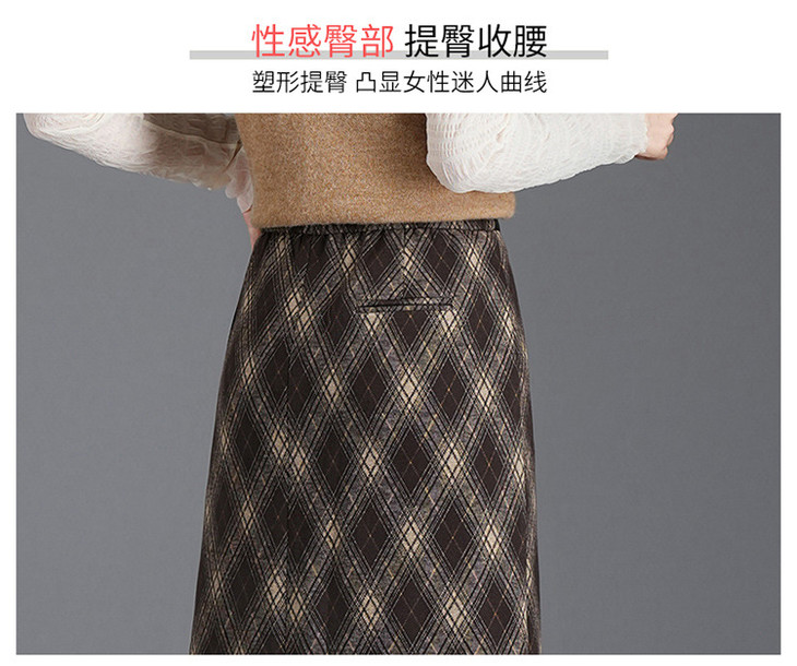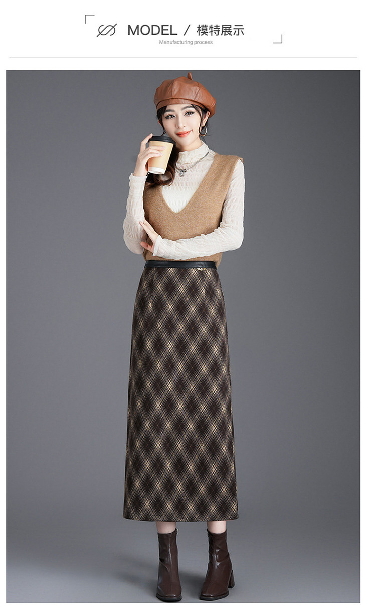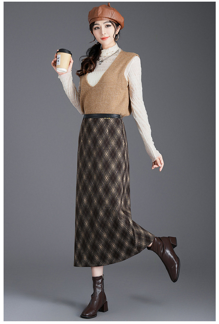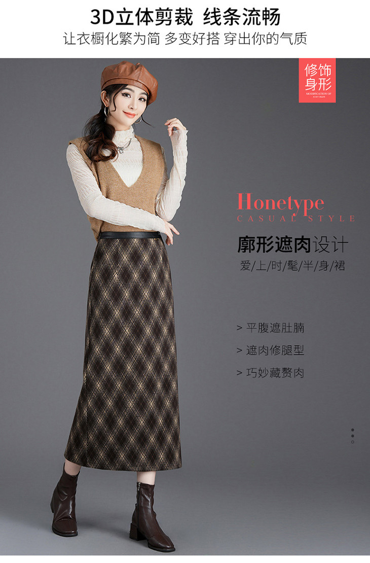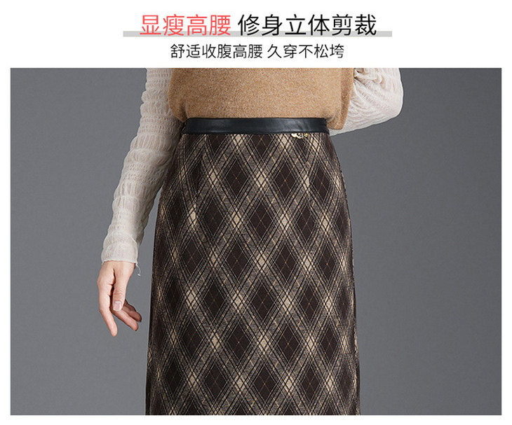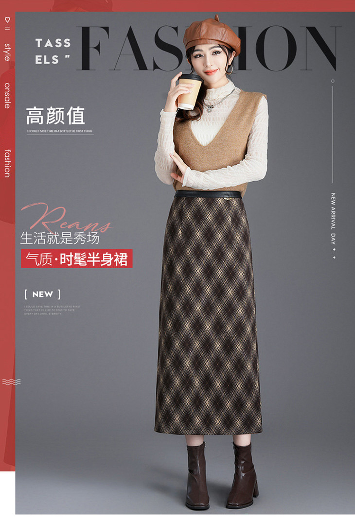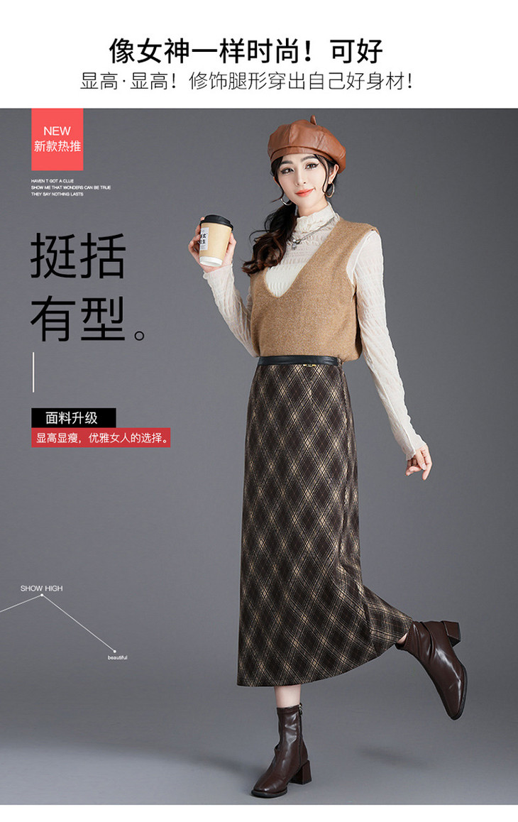 毛呢格子秋冬长款高腰开叉,一步裙显瘦包臀直筒裙MYX-1829