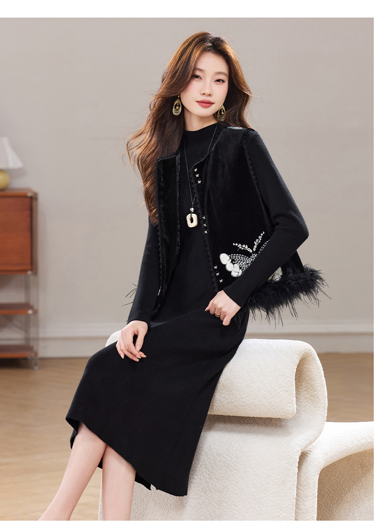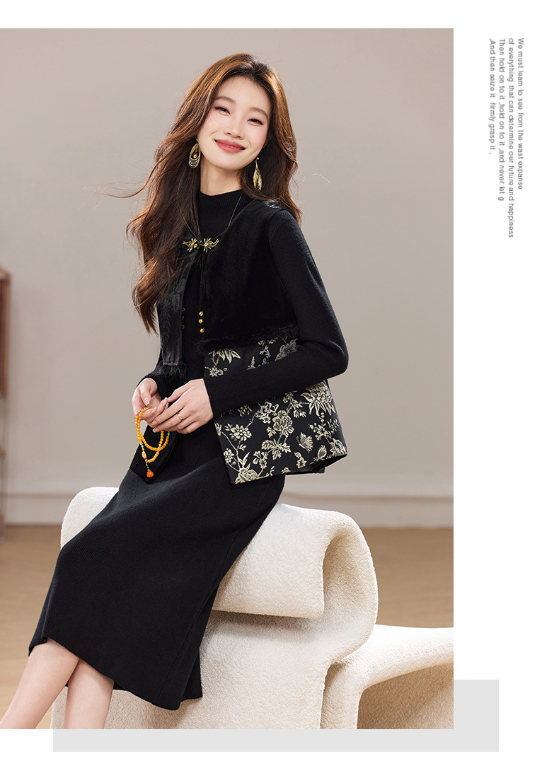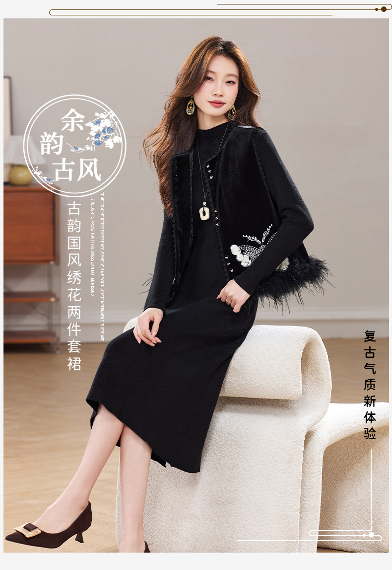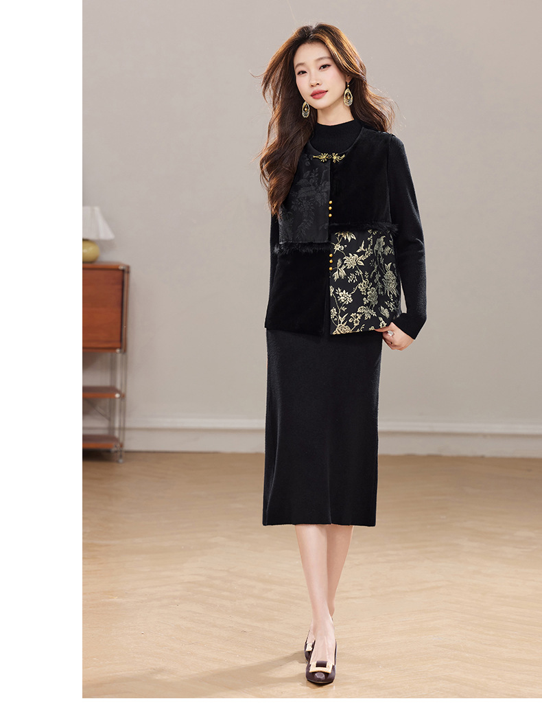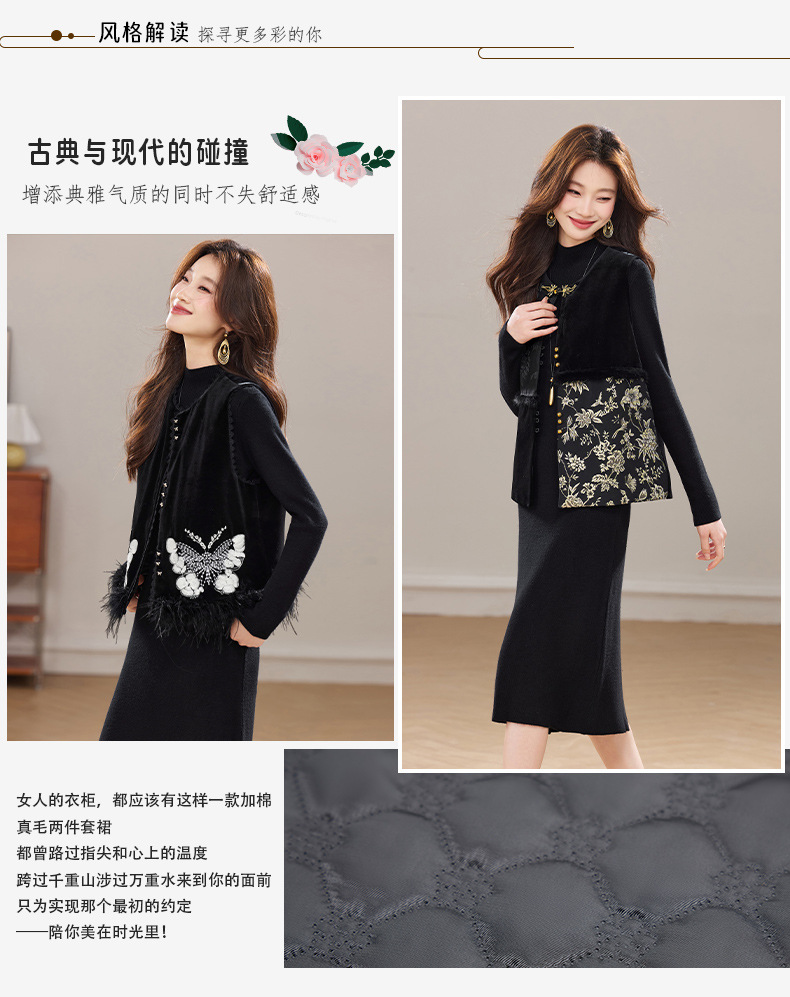HR YBER629加棉新中式圆领真毛马甲洋气显瘦气质款两件套裙