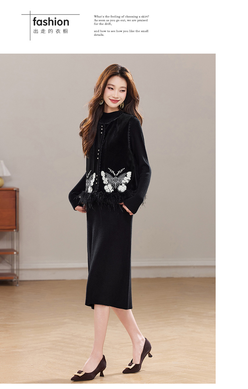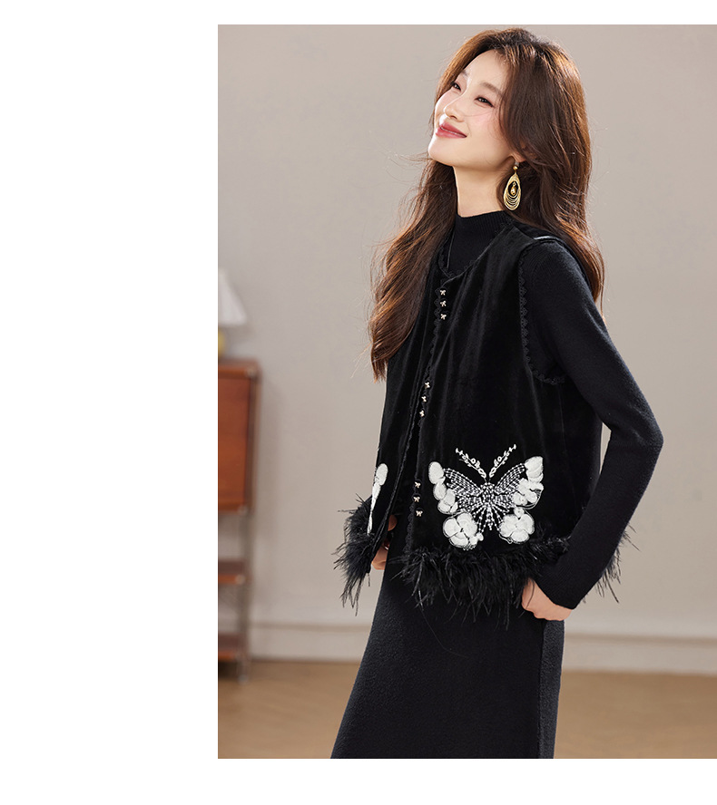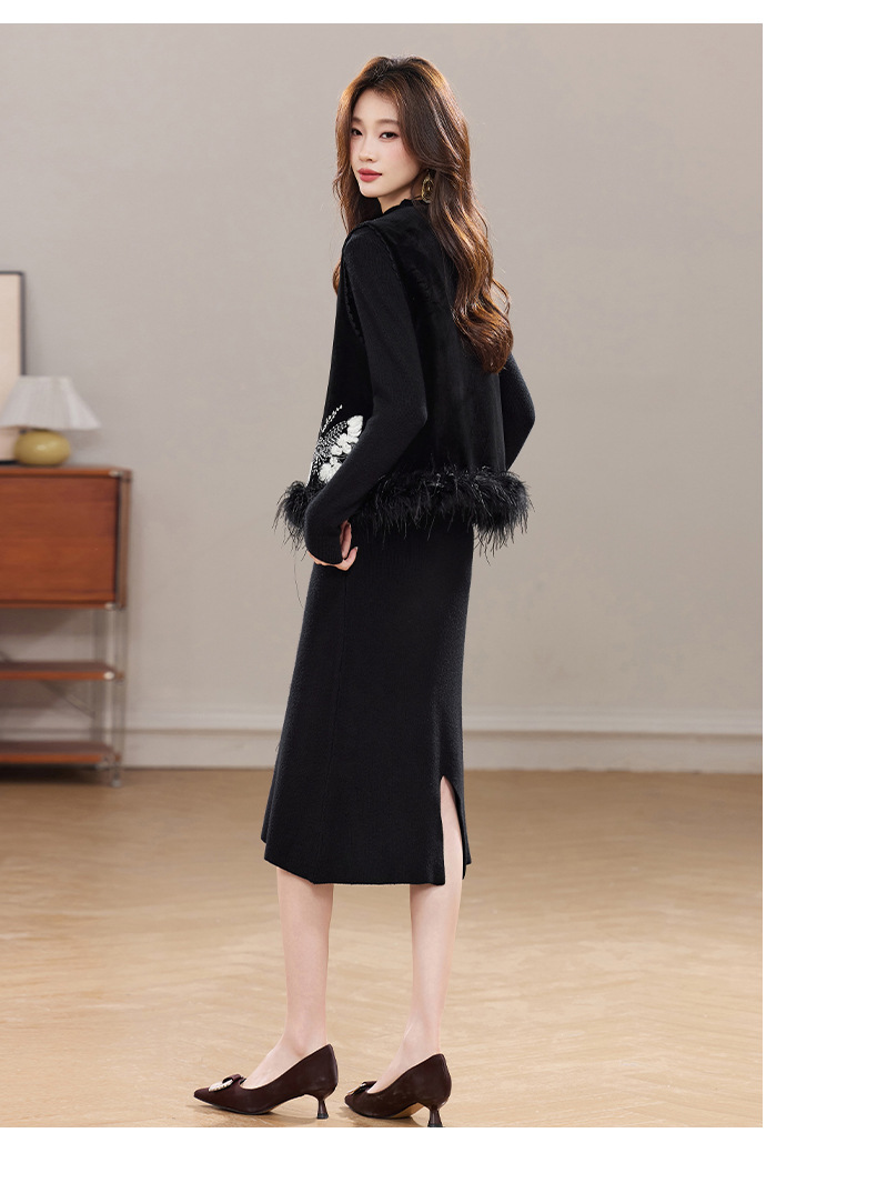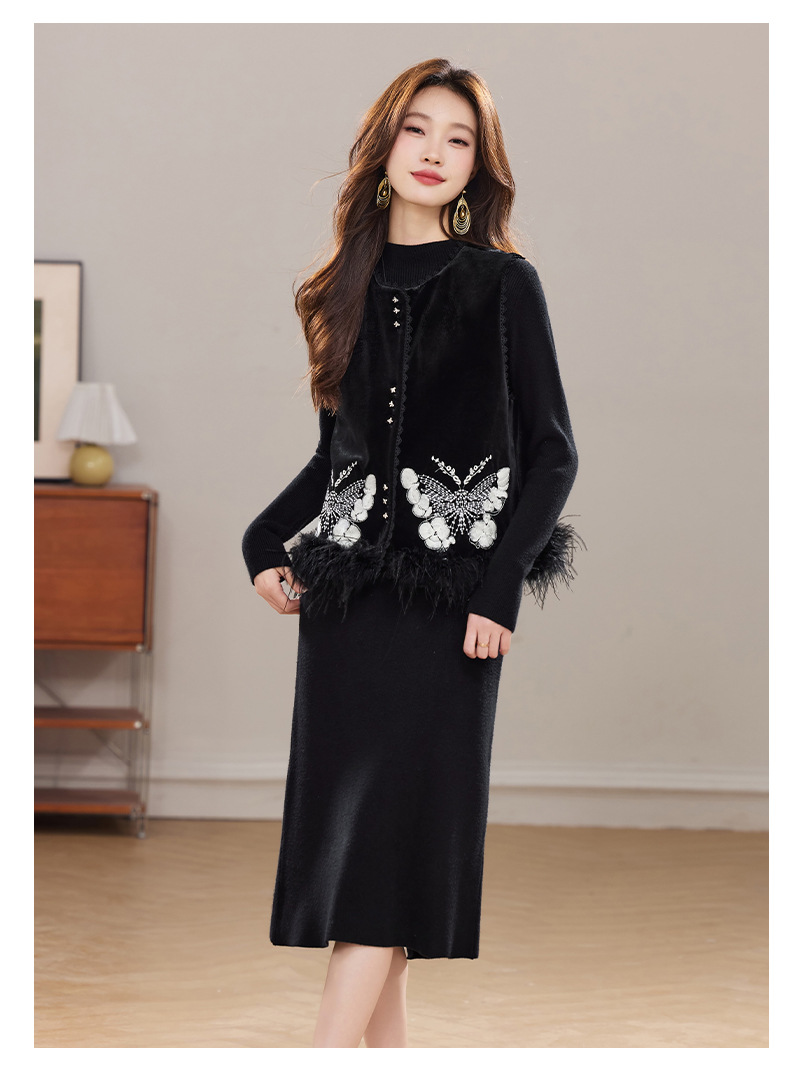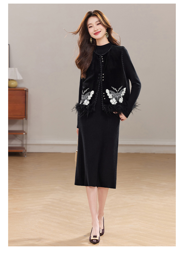 HR YBER629加棉新中式圆领真毛马甲洋气显瘦气质款两件套裙