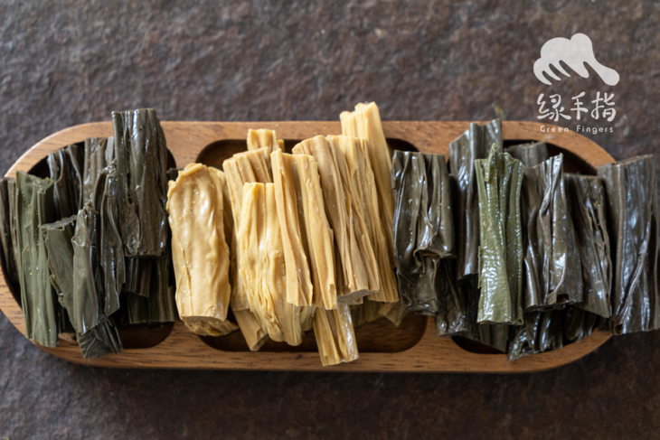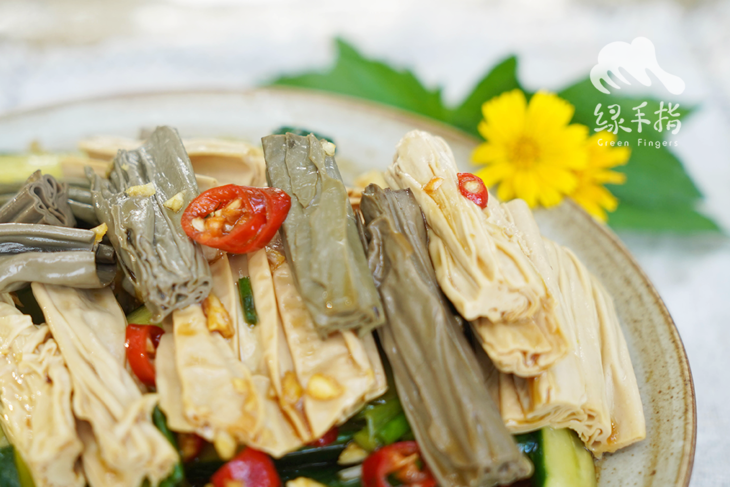 腐竹作为中国食物加工文化中的典型代表,值得给它一束高光:黄豆经过研磨煮浆,精华从细胞壁溢出溶解在水里,液面遇冷凝结成膜,蛋白质和油脂的集结。挑起晾晒去除水分,不给细菌霉菌机会,便能经起时间的考验,复水便恢复Q弹口感。脱胎换骨,青出于蓝,是倾尽对食物热爱和极具创造力的改造了。