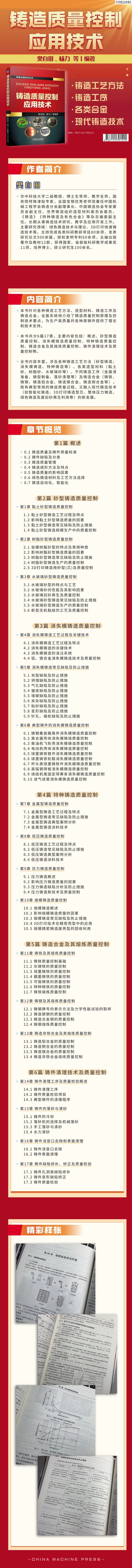2)主要内容包括:概述、砂型铸造质量控制、消失模铸造质量控制、特种铸造质量控制、铸造合金及其熔炼质量控制、铸件清理技术及质量控制等。