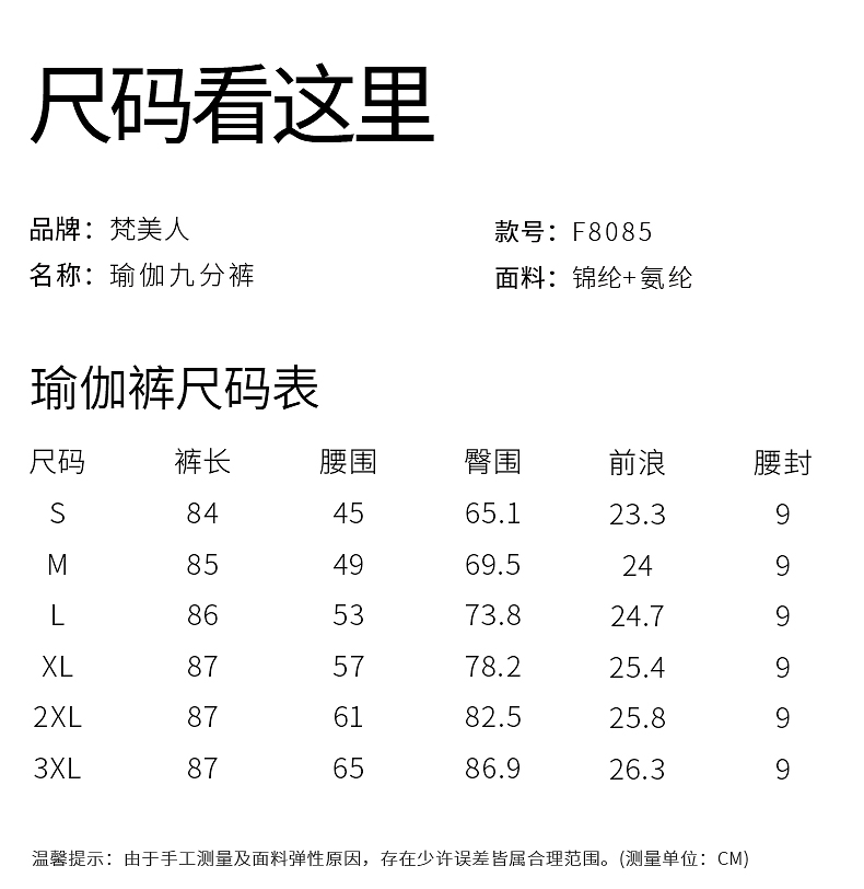 梵美人 F8085 瑜伽九分裤 无松紧 莱卡云柔