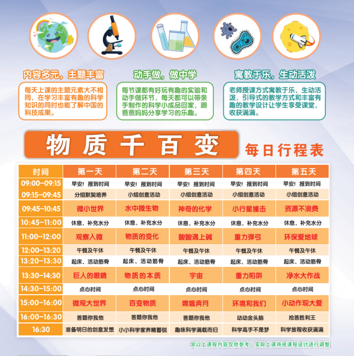 您好!力翰科学暑假科学营【物质千百变】课程活动详情如下: