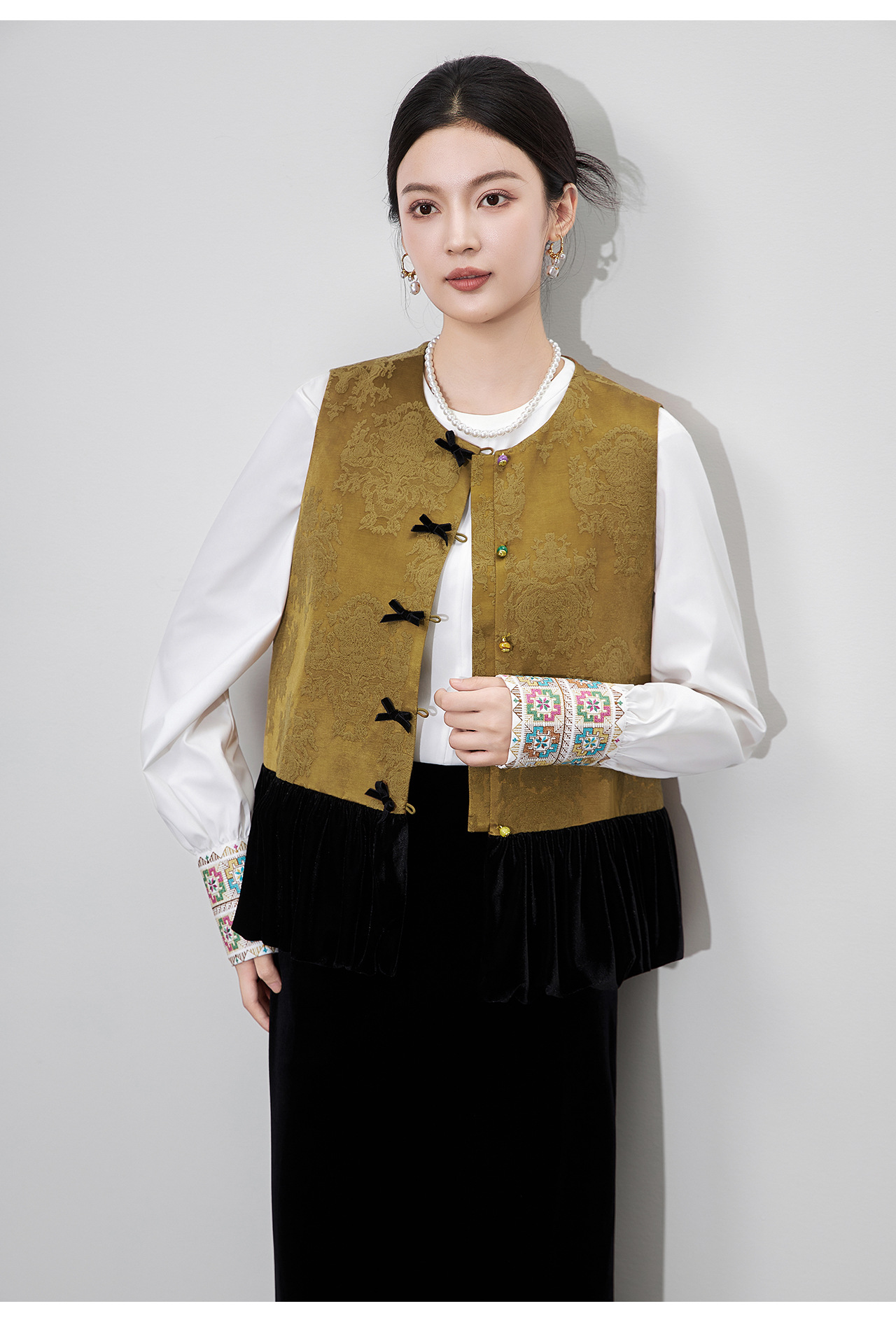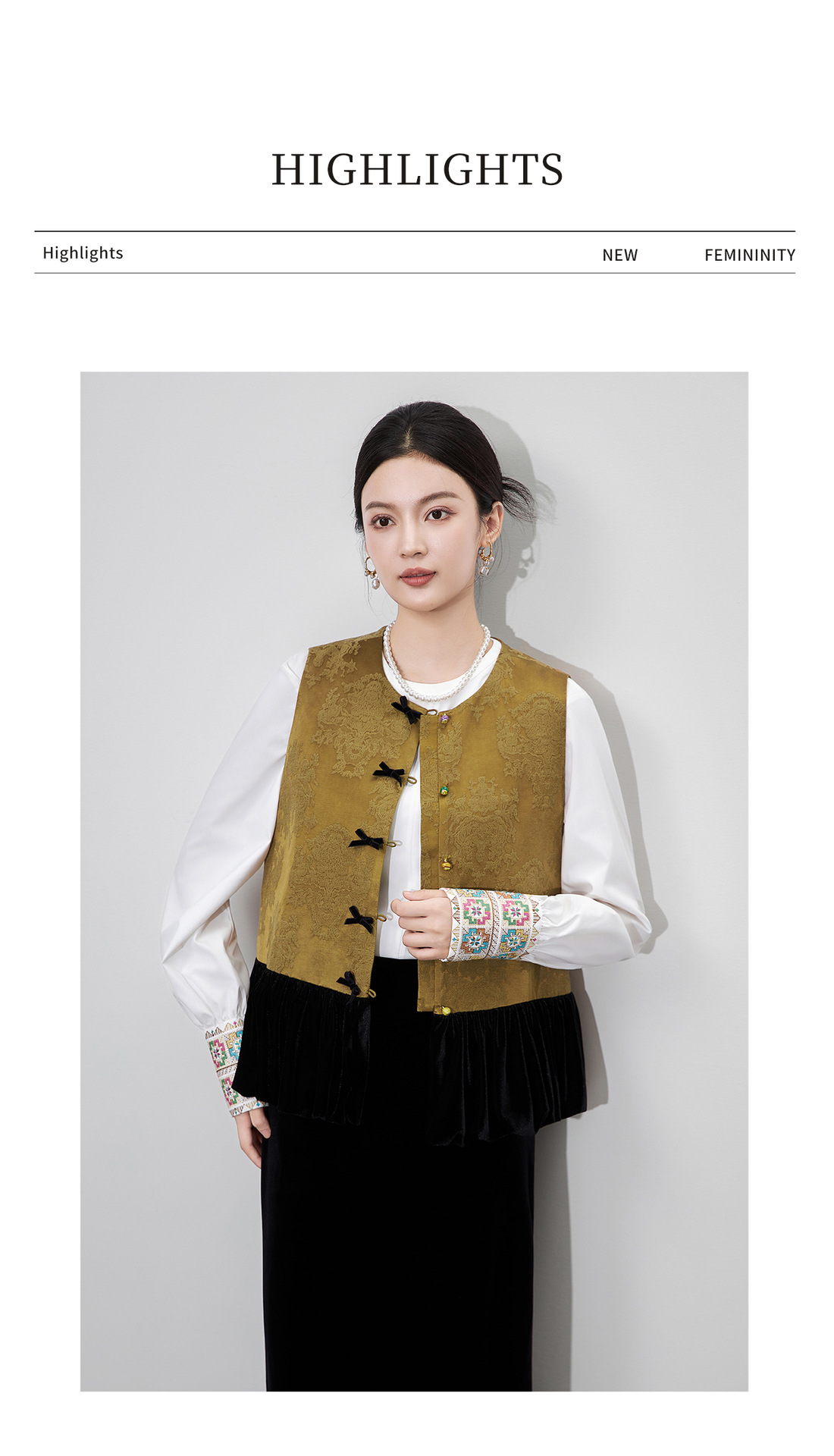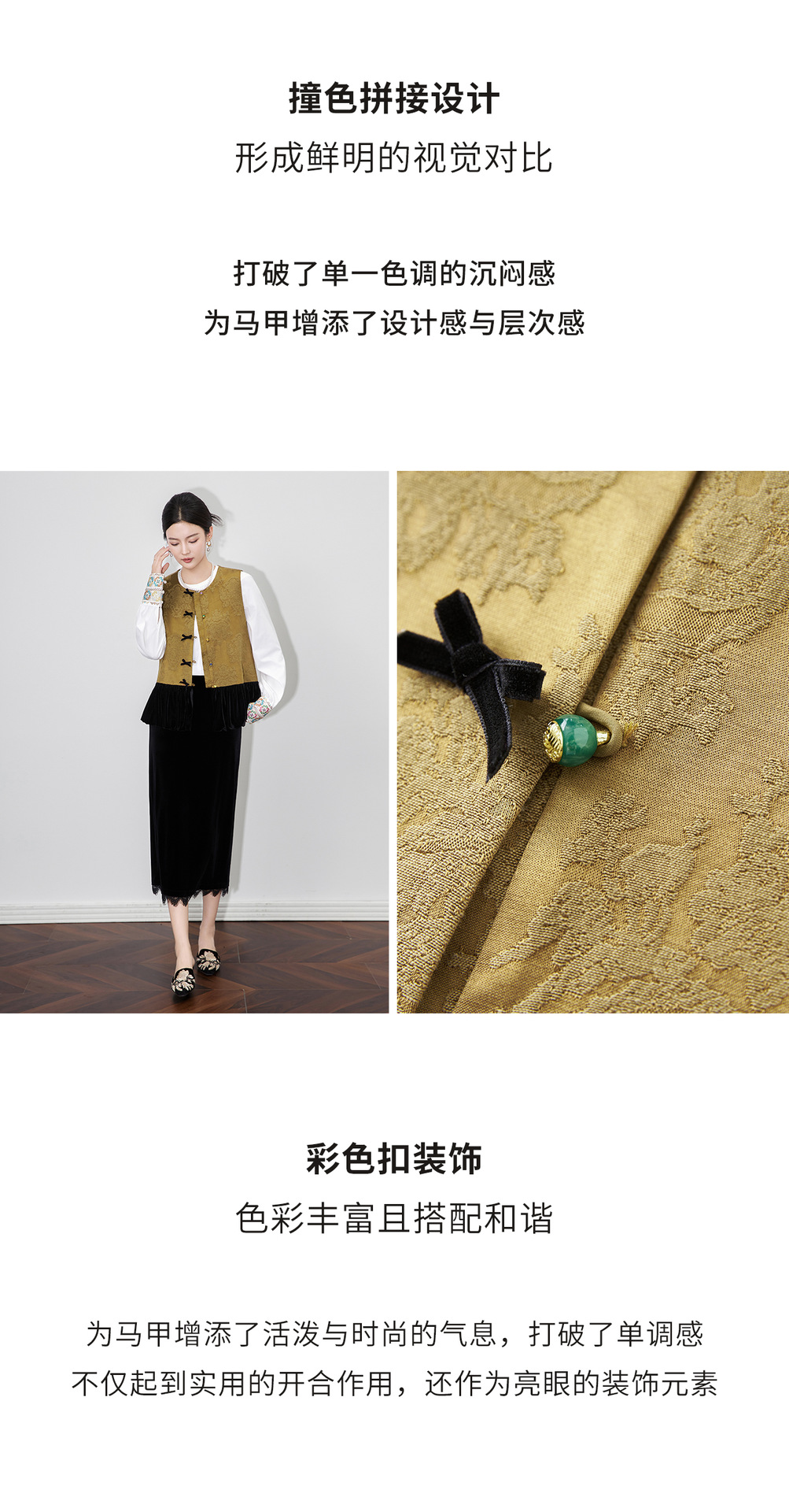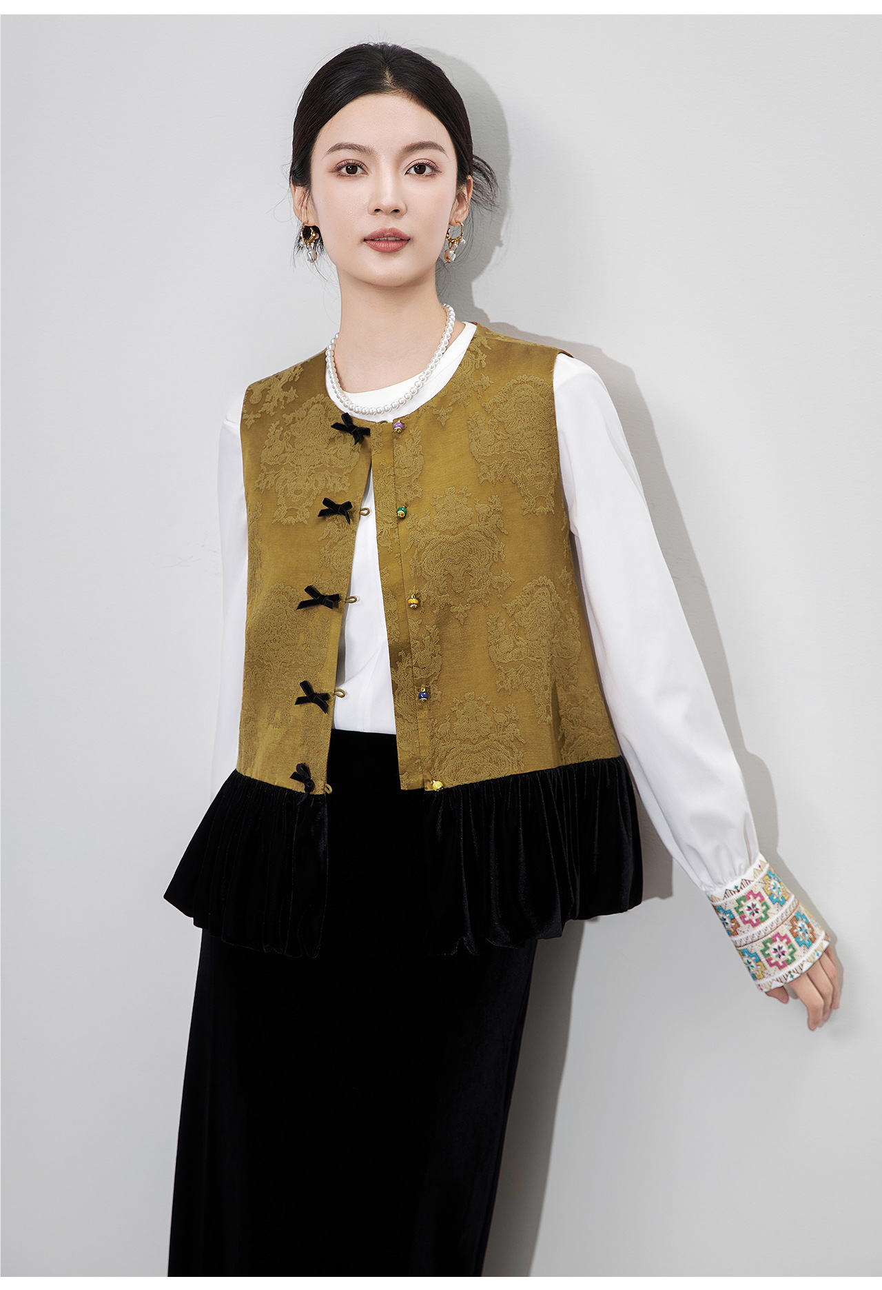 「高货wl」全新升级【铂金会员330/天猫439/差价109】(15459)洛诗琳新中式提花拼接丝绒马甲2025秋季衣显瘦国风上衣