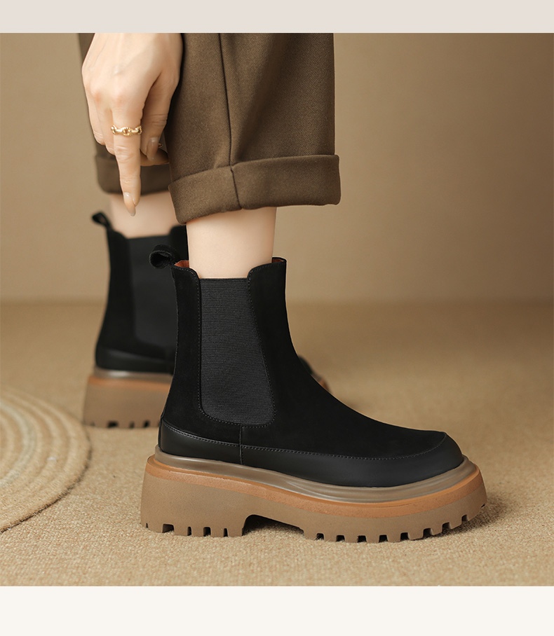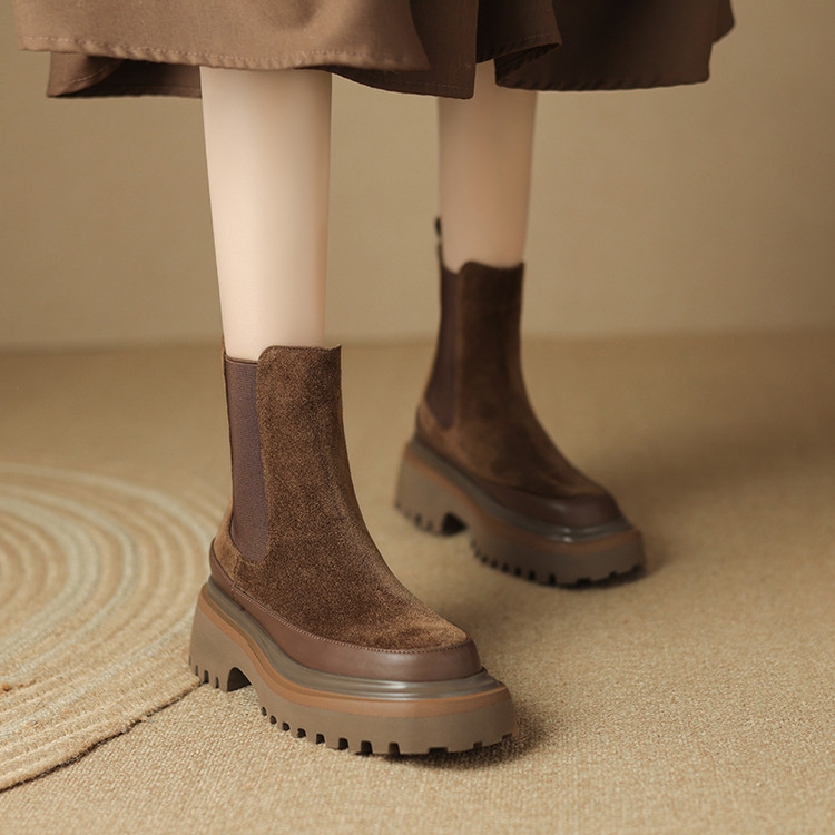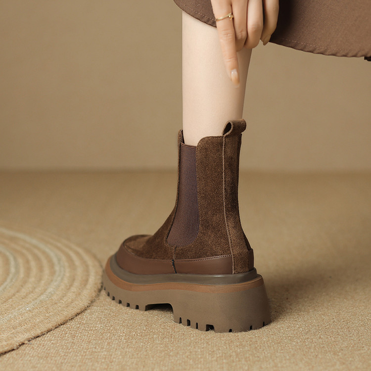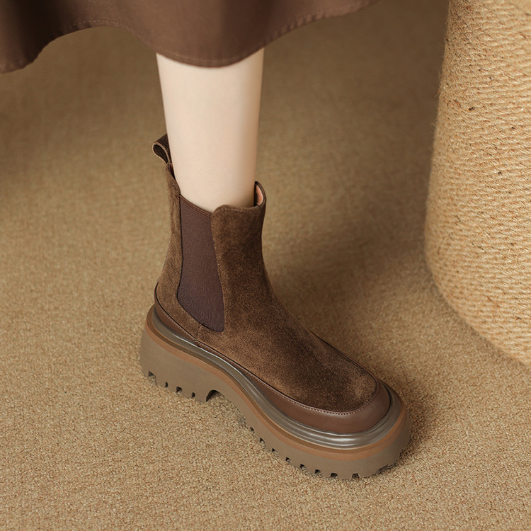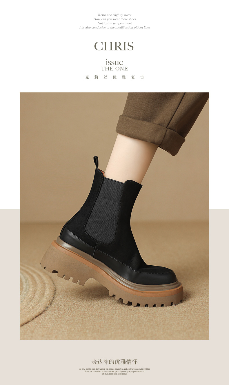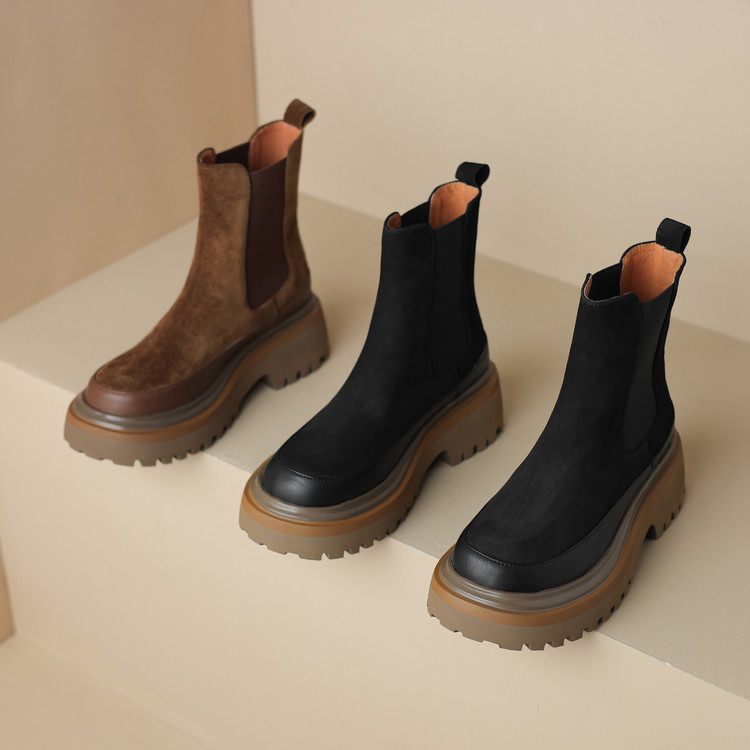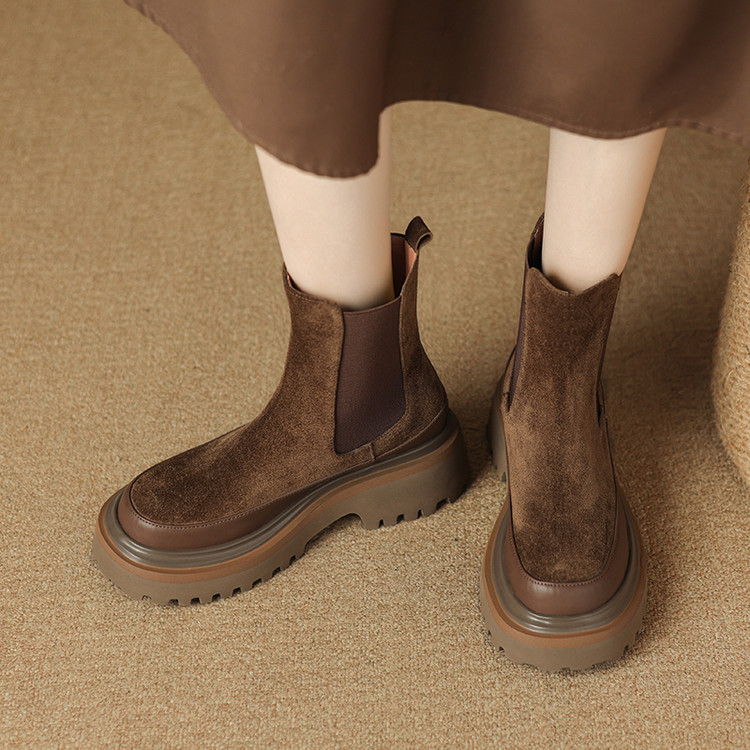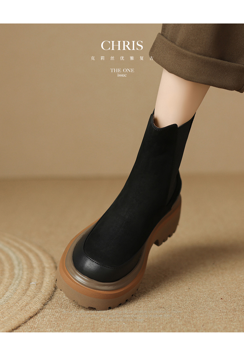 【预售5天】轻巧舒适圆头松糕底切尔西靴女秋冬新款真皮复古磨砂厚底短筒骑士靴MDY&AM2169-20