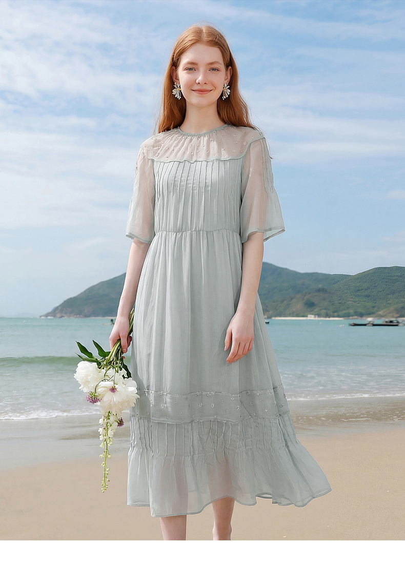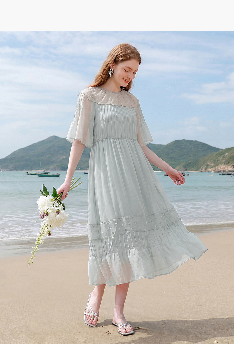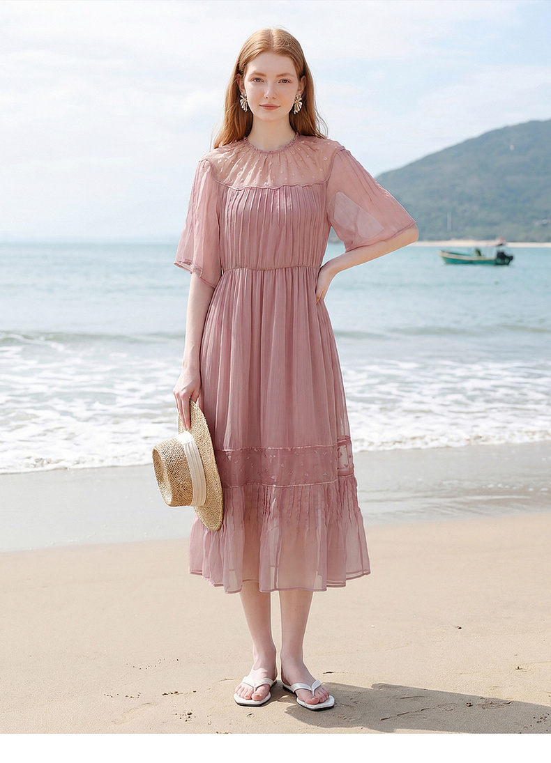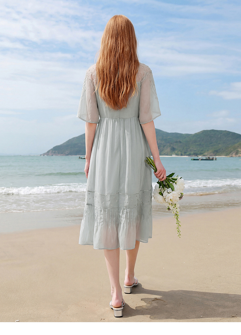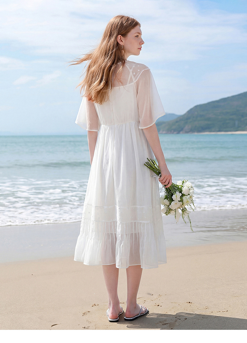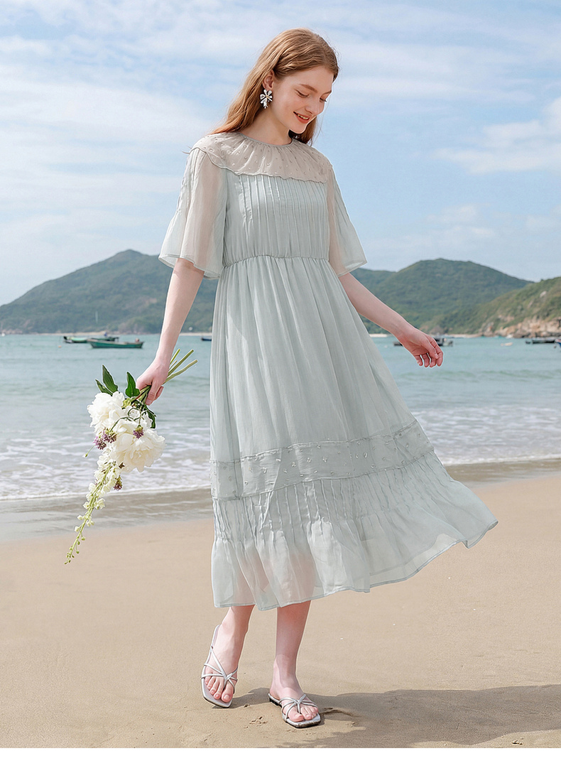 天猫同步【轻奢!沙滩裙】拉夏贝尔/La Chapelle刺绣重工圆领短袖宽松连衣裙轻奢女收腰显瘦度假风